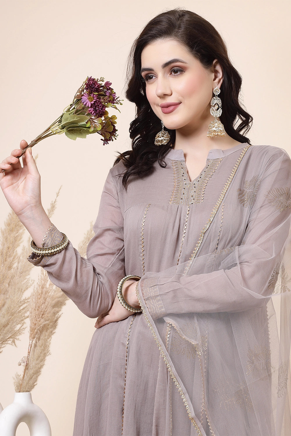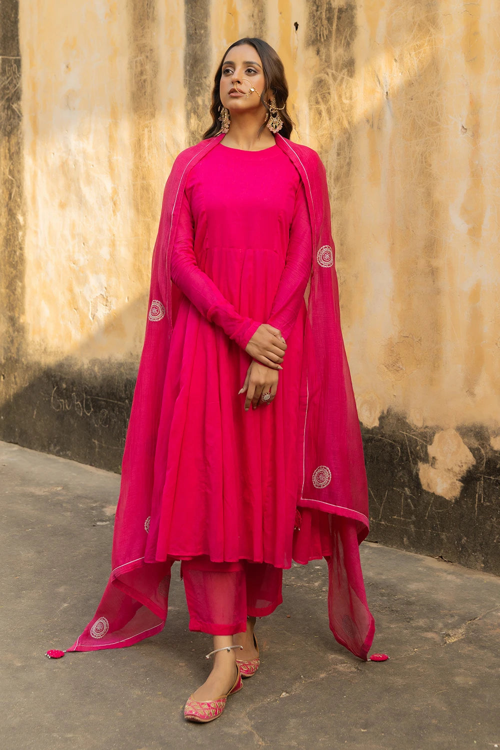 Magenta Malmal Anarkali With Chanderi Pitta Work Dupatta - Set Of 3