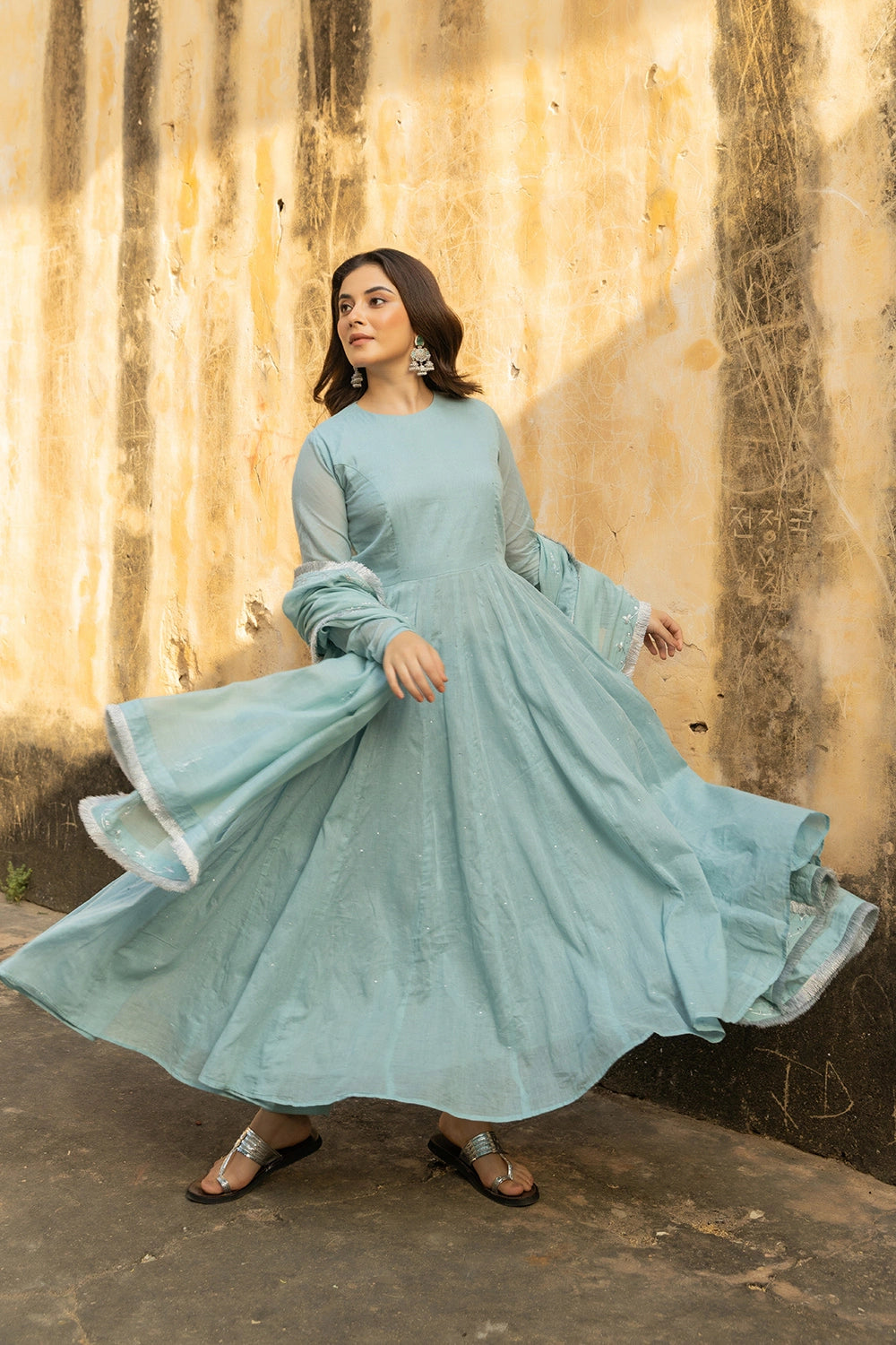 Turquoise Malmal Anarkali Suit With Chanderi Pitta Work Dpatta - Set Of 3