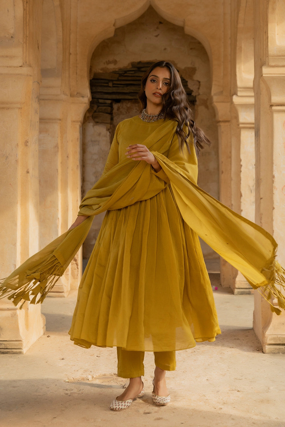 Mustard Malmal Anarkali Mirror Work Suit With Mirrorwork Dupatta Intricate Dangeled Fringes Border - Set Of 3