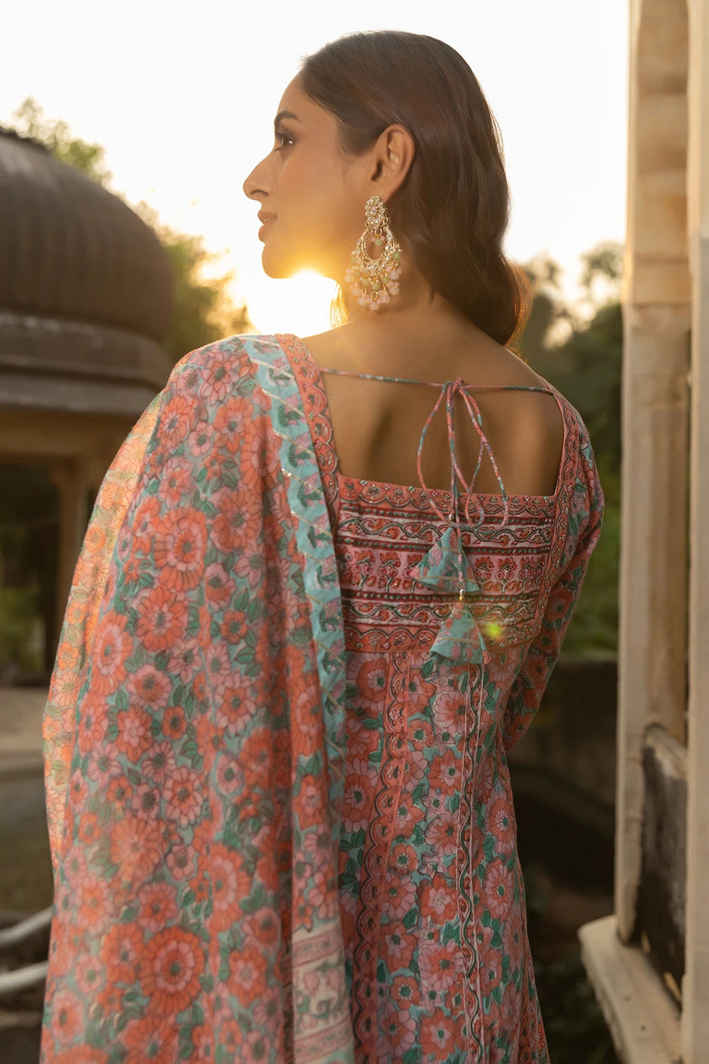 Peach & Green Block Print Adda Work Anarkali, Churidar With Chanderi Dupatta - Set Of 3