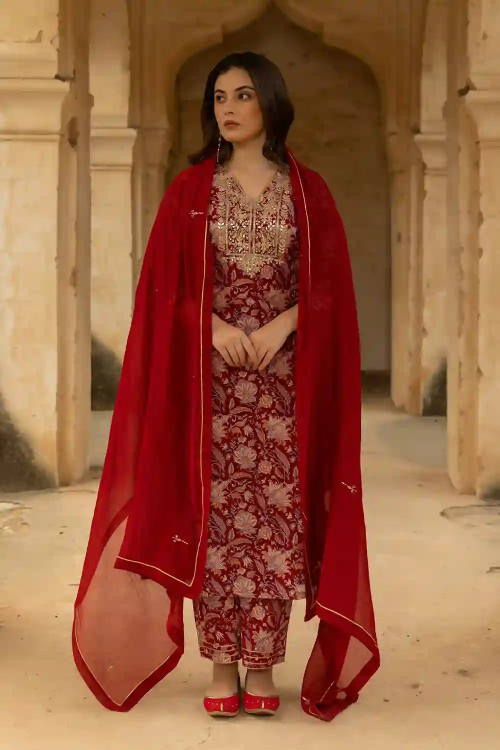 Red Maroon Chanderi Kurta Set With Gota Patti Work And Chanderi Gota Patti Dupatta - Set Of 3