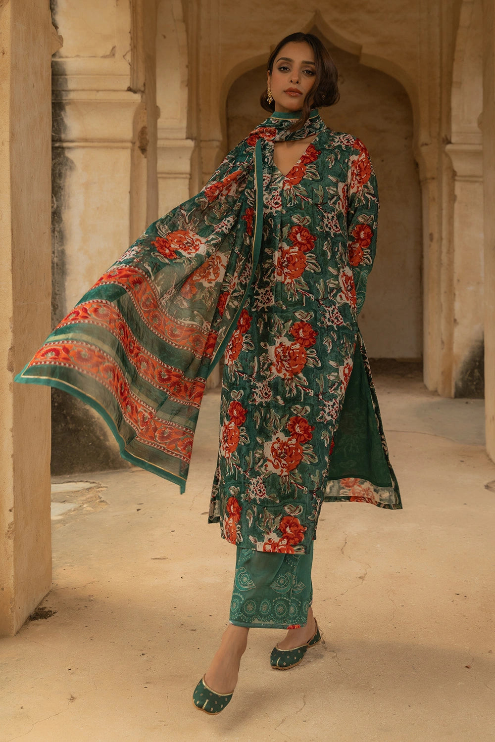 Forest Green Block Print Chanderi Embroidery Kurta Set - Set Of 3