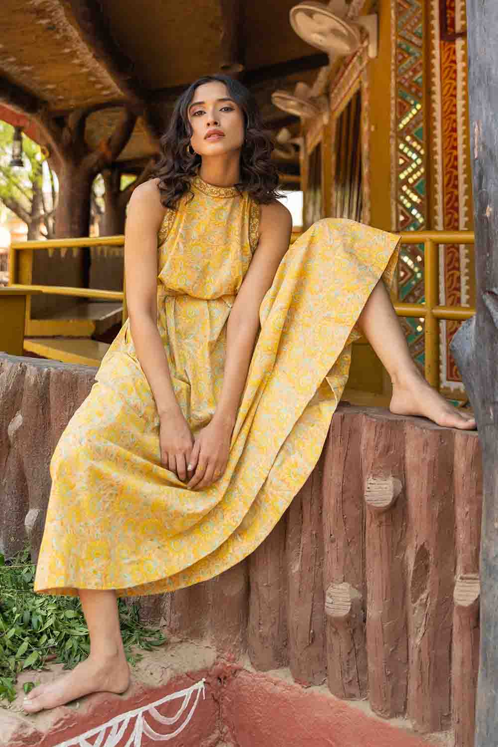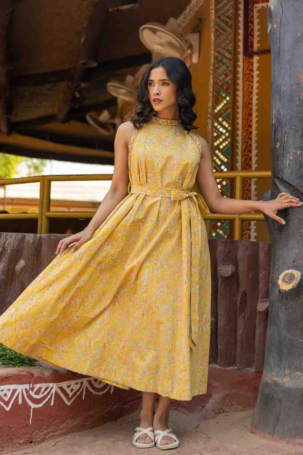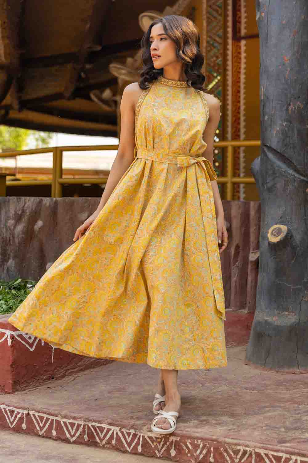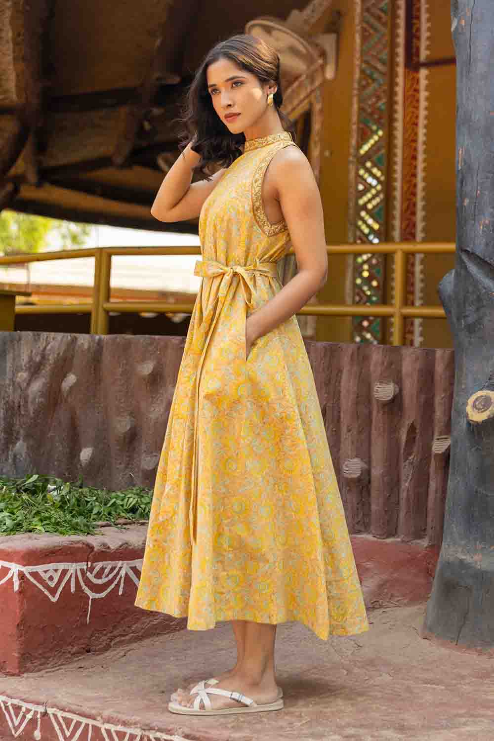 Pastel Yellow & Green A Line Cut Sleeves Dress – Sleeveless Summer Chic