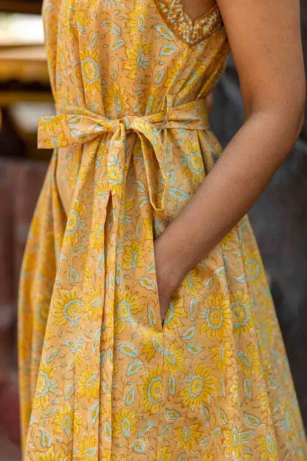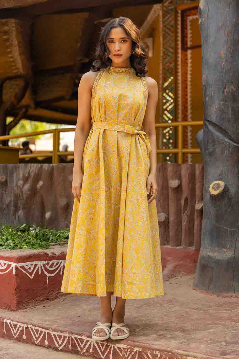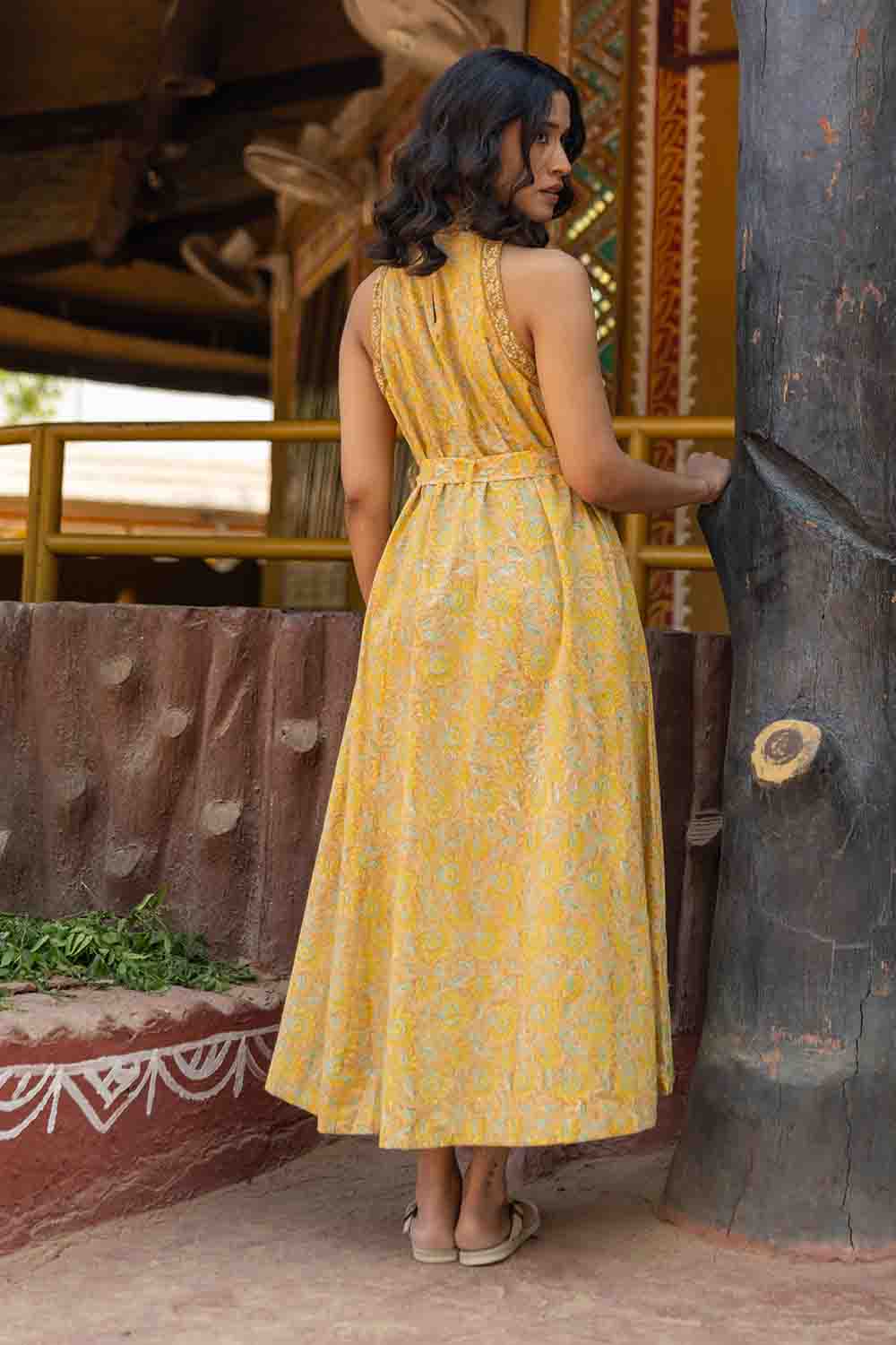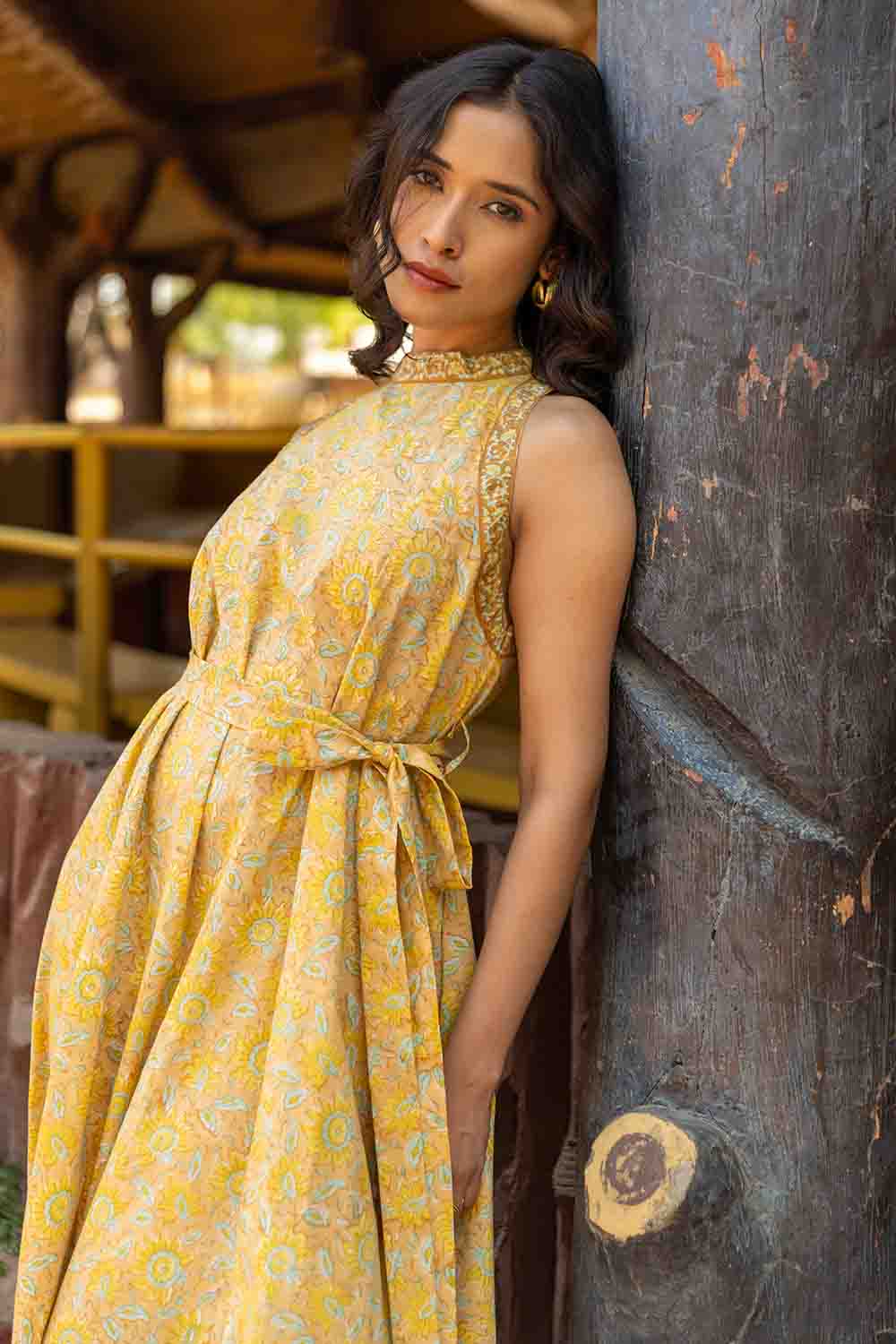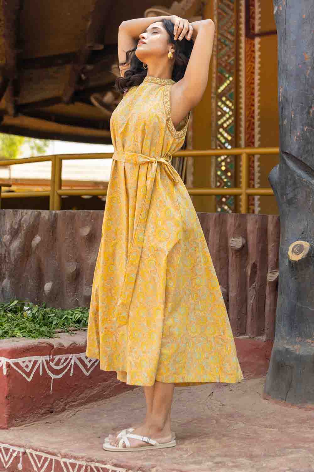 Pastel Yellow & Green A Line Cut Sleeves Dress – Sleeveless Summer Chic