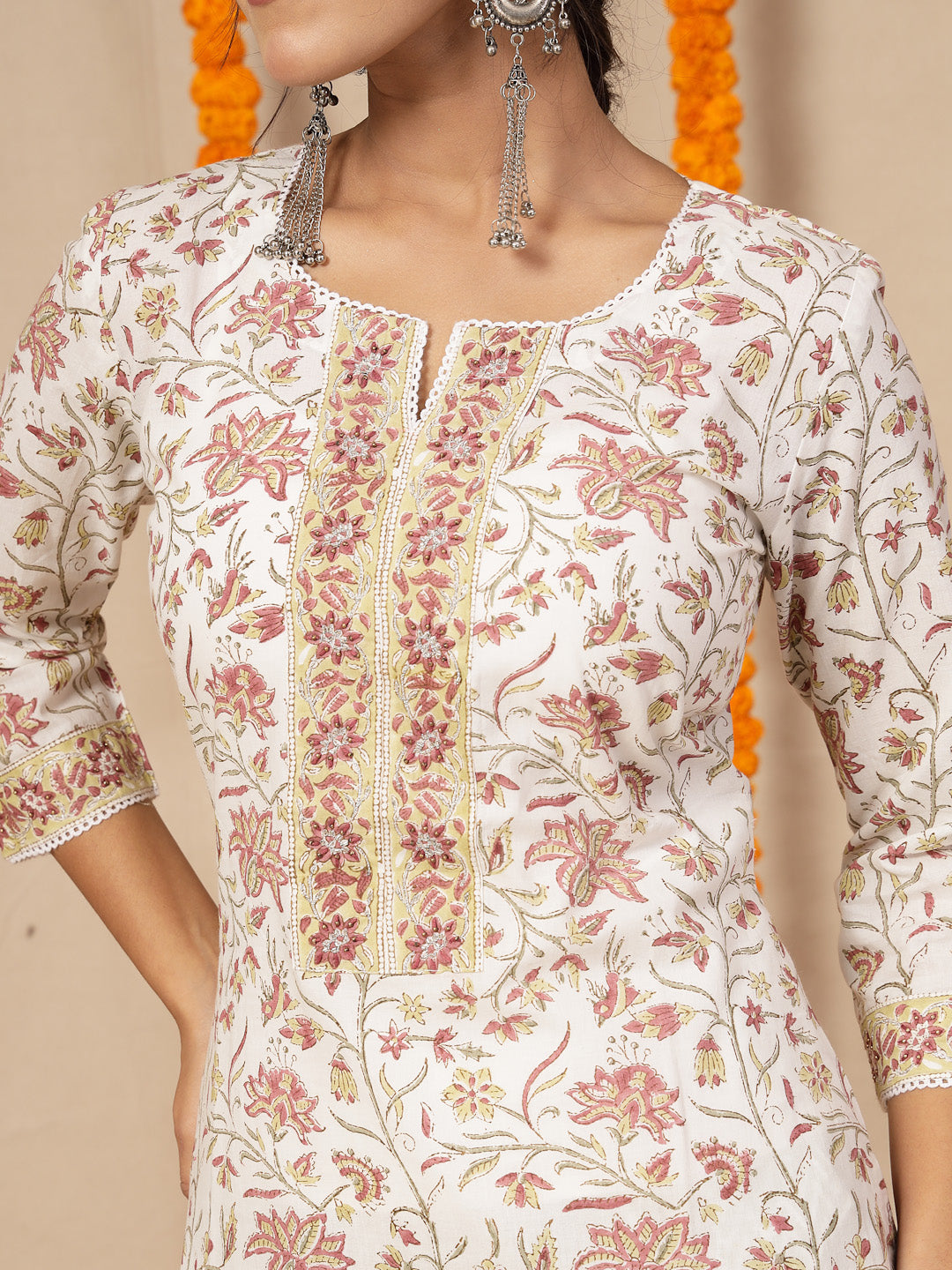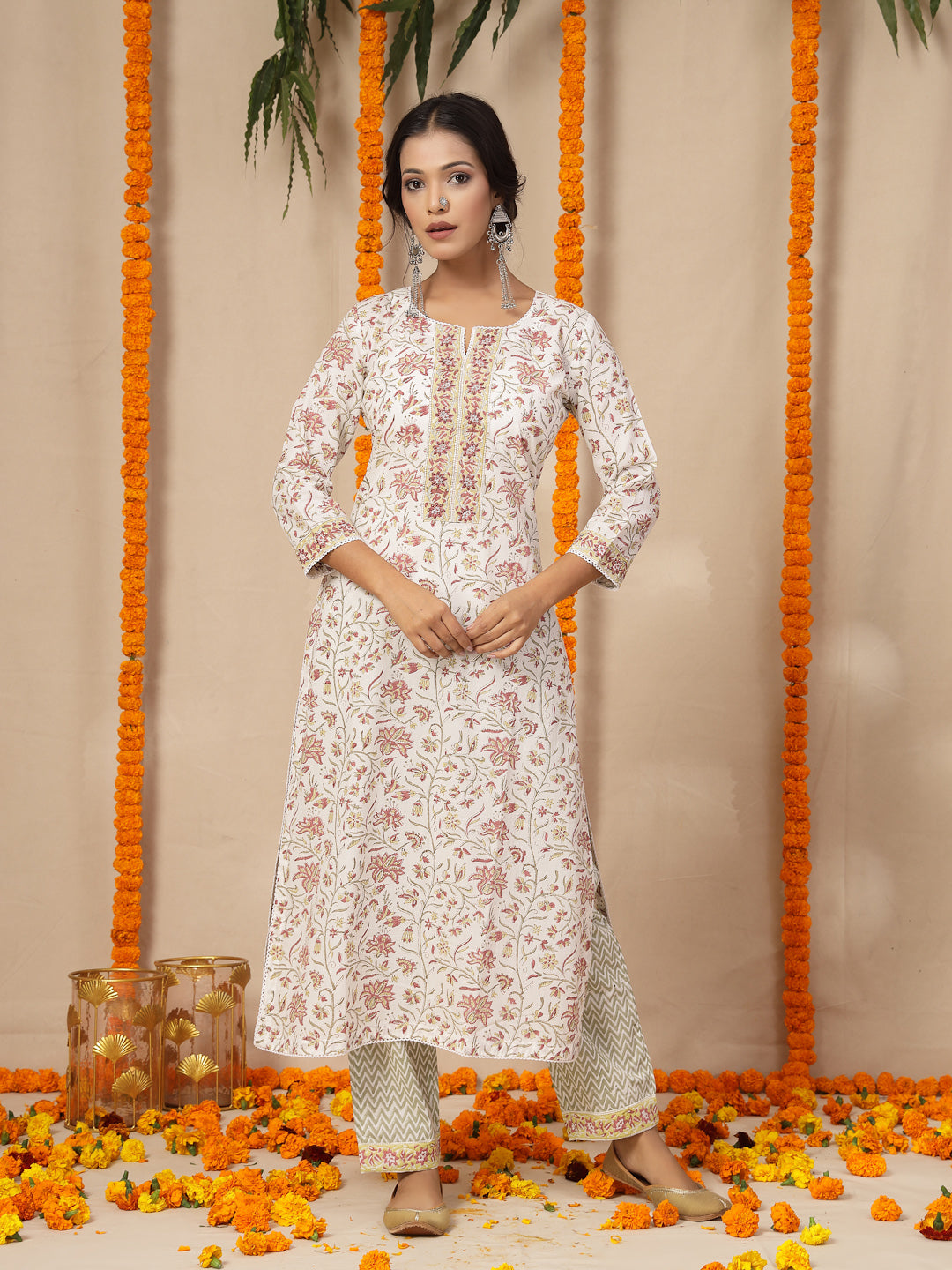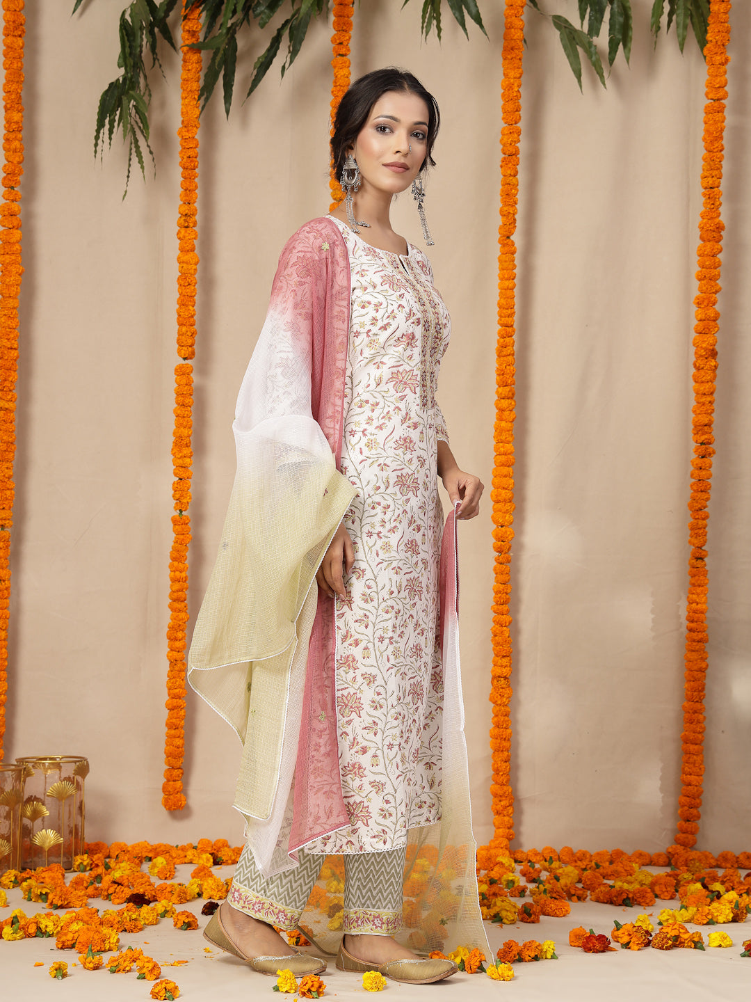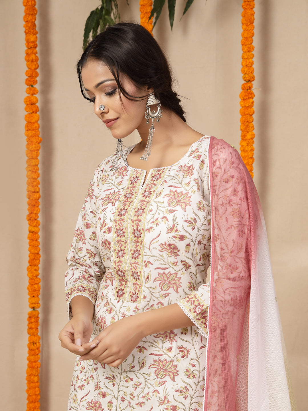 White Cotton hand block printed kurta, pants with hand work kota dupatta
