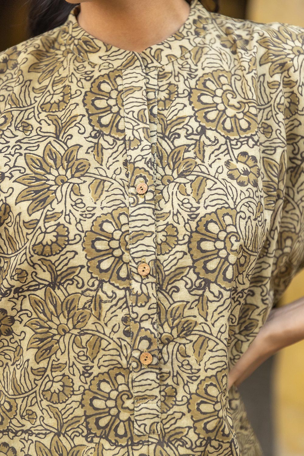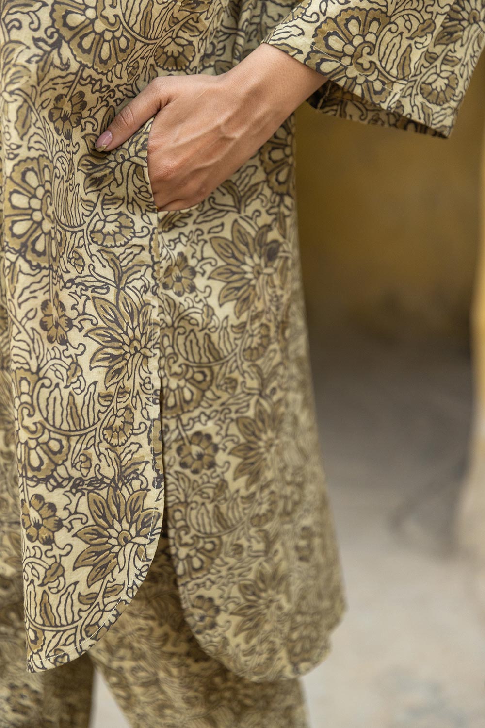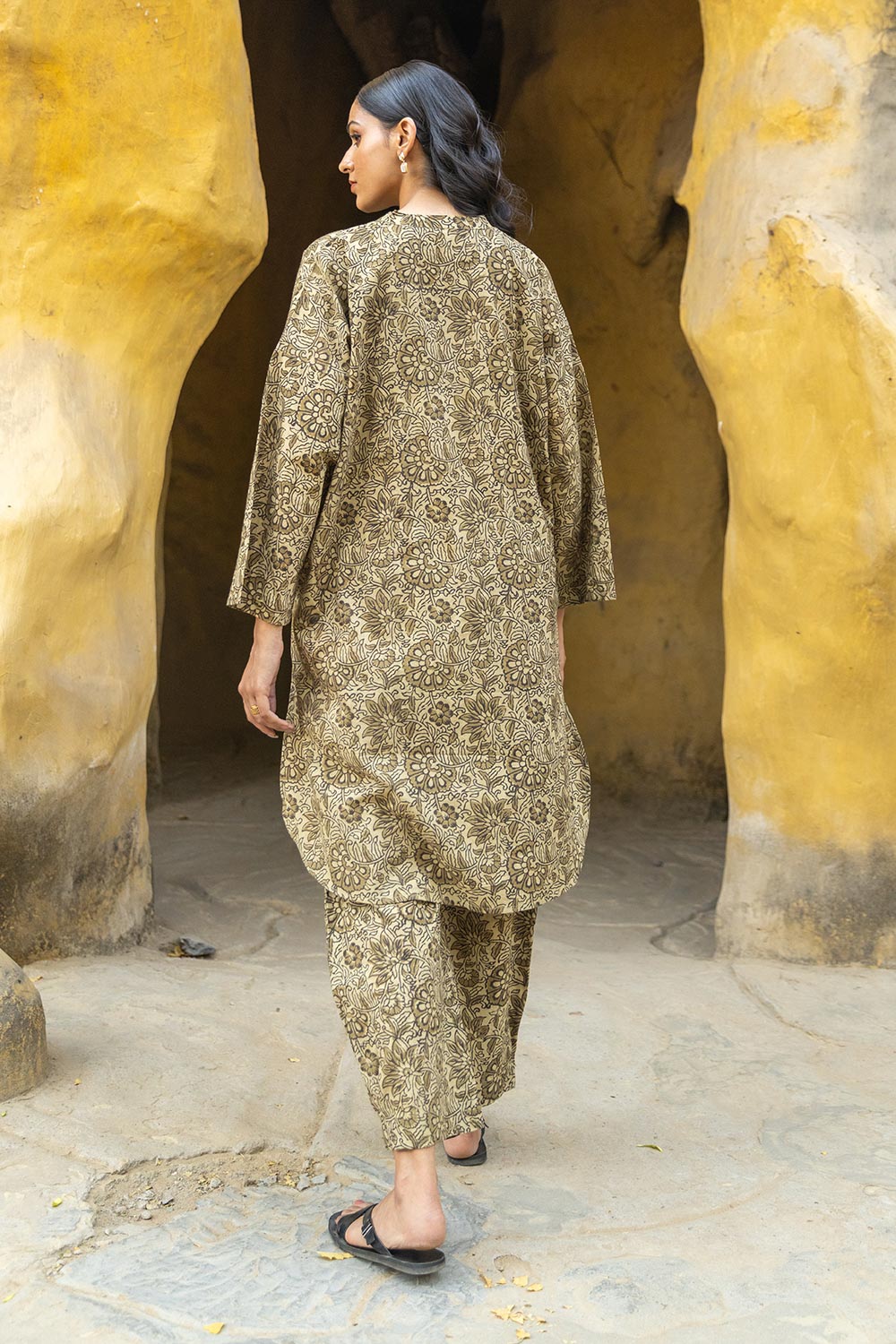 The earthy tones and delicate motifs of Akola printing—originating from Rajasthan—add character and heritage to this minimalist two-piece set. Ideal for work-from-home days,