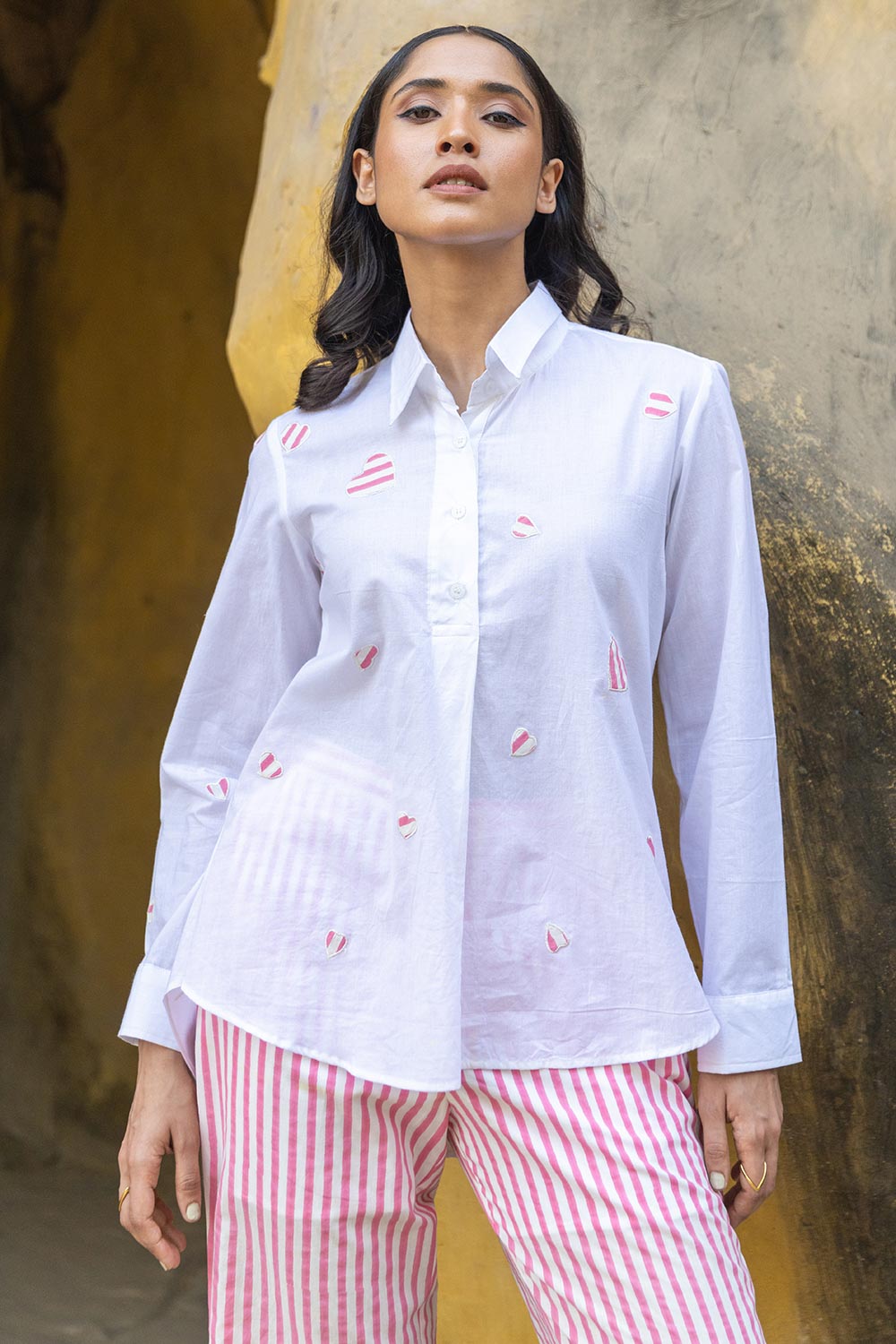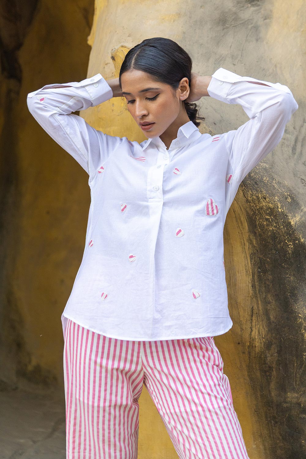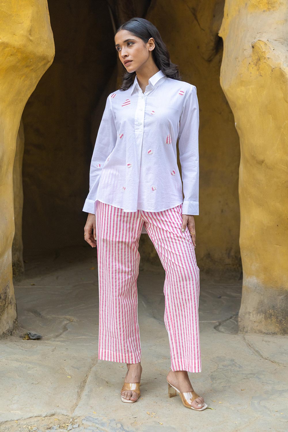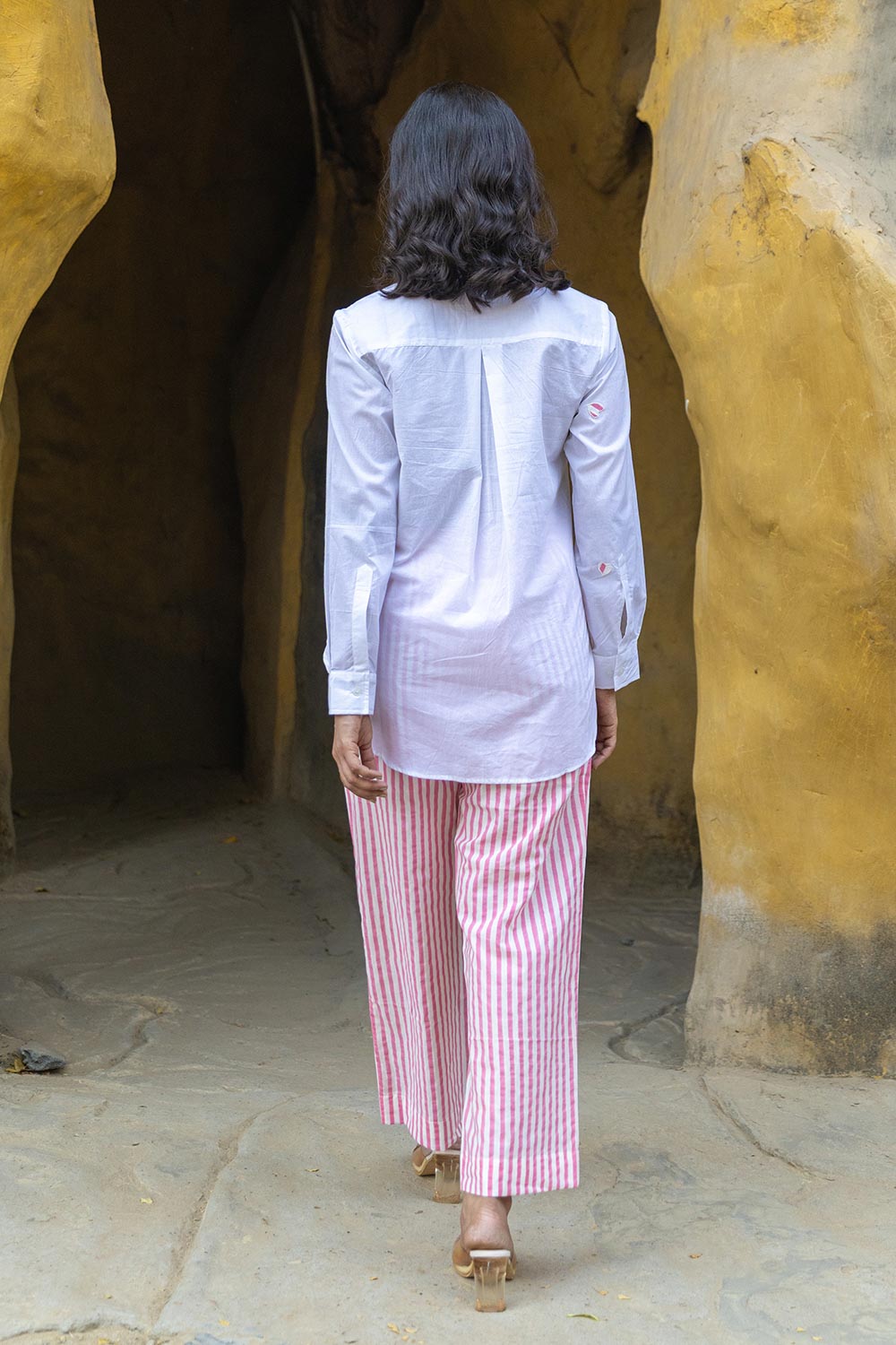 Elevate your everyday style with our White Patchwork Shirt and Pink Stripe Pants Co-ord Set, a refreshing fusion of craft and comfort. Made from breathable, handcrafted cotton,