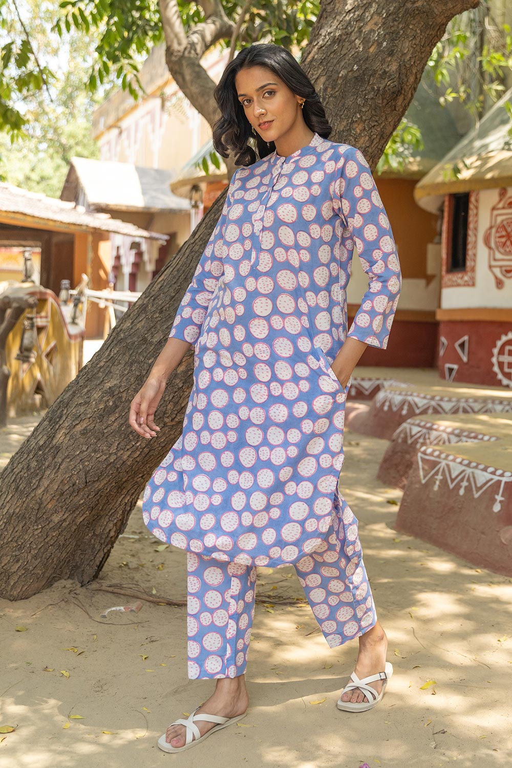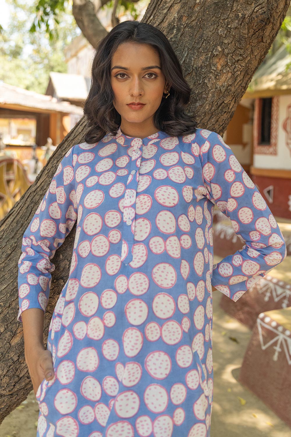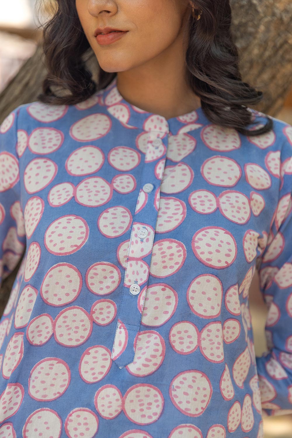 Fabric: Soft Cotton with Dobby Texture – lightweight and breathableDesign: Hand-Blocked Prints – crafted by skilled artisansFit: Easy & Relaxed – ideal for all body types Colors: Blue and Pink – vibrant, fresh, and feminine