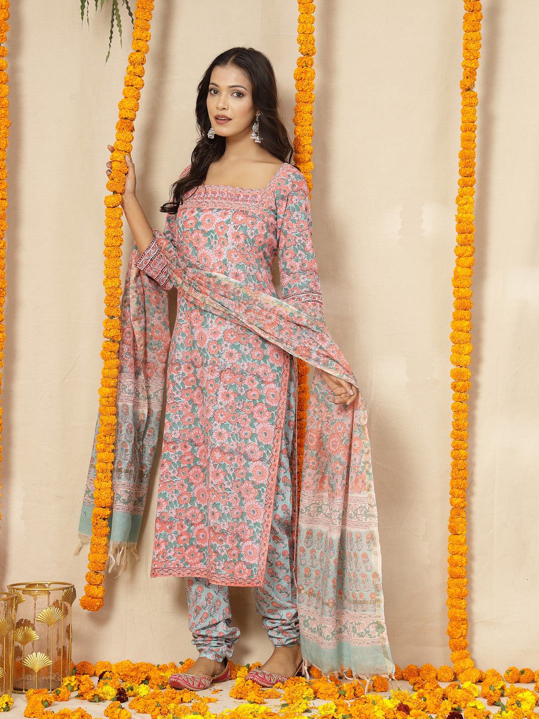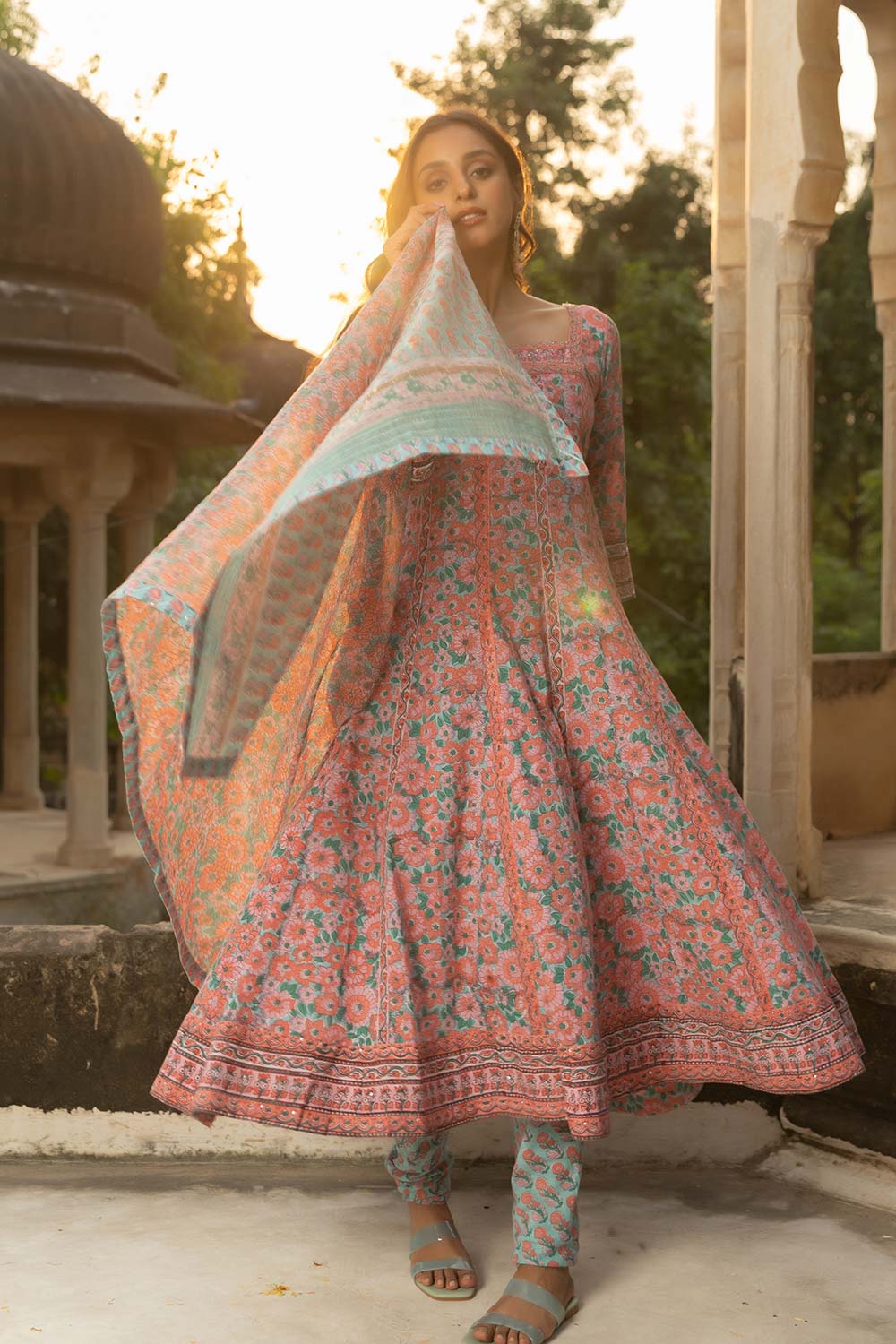 Peach & Sea Green Hand Block Print chanderi Dupatta