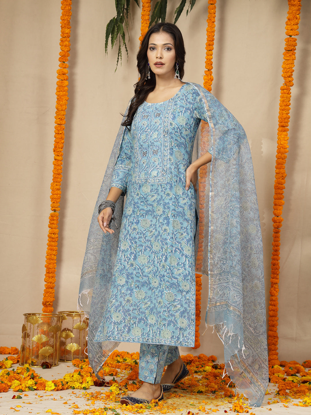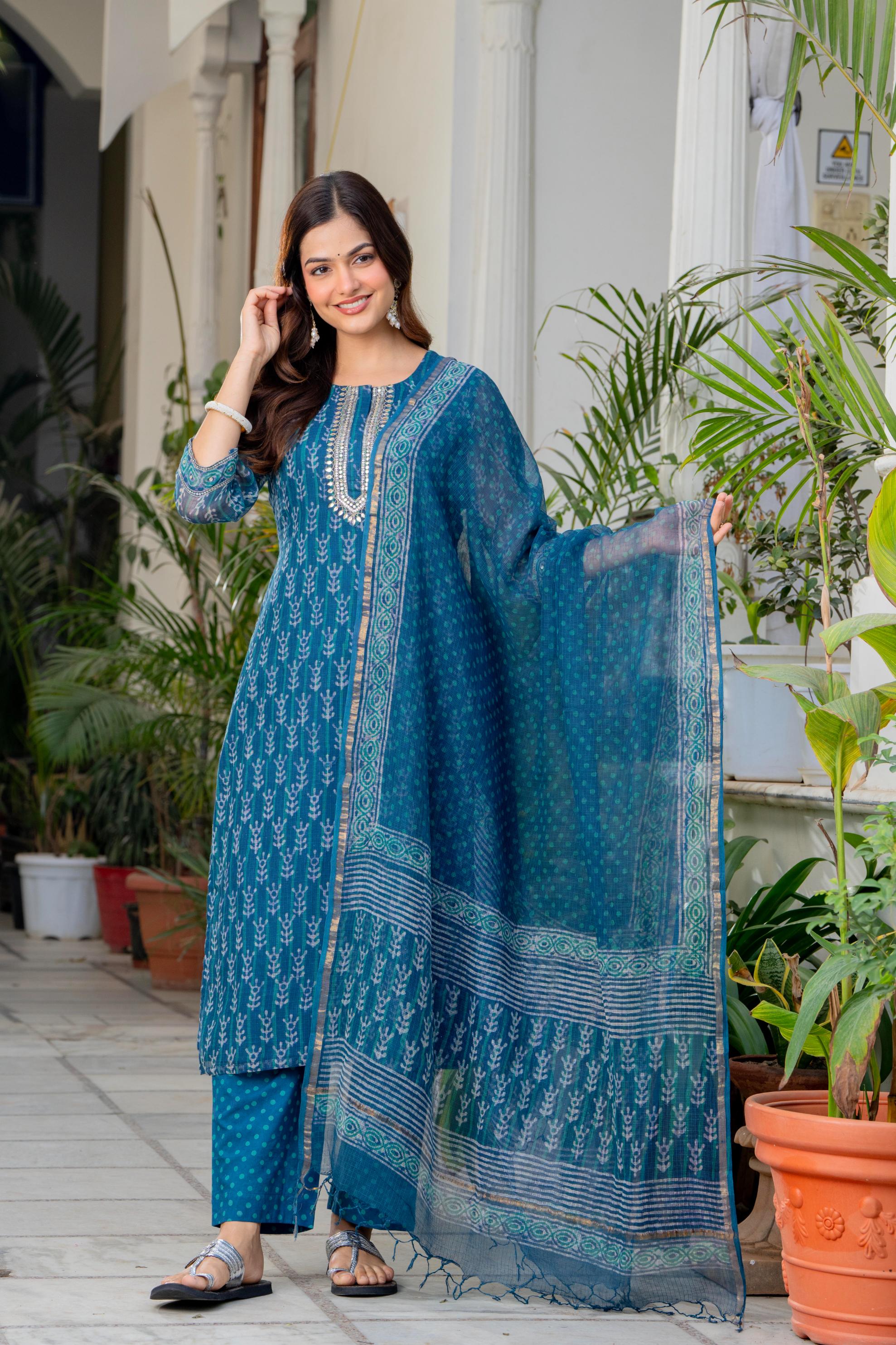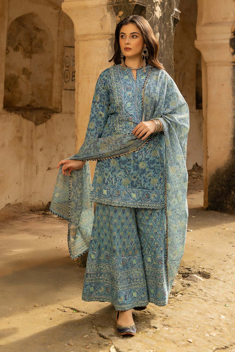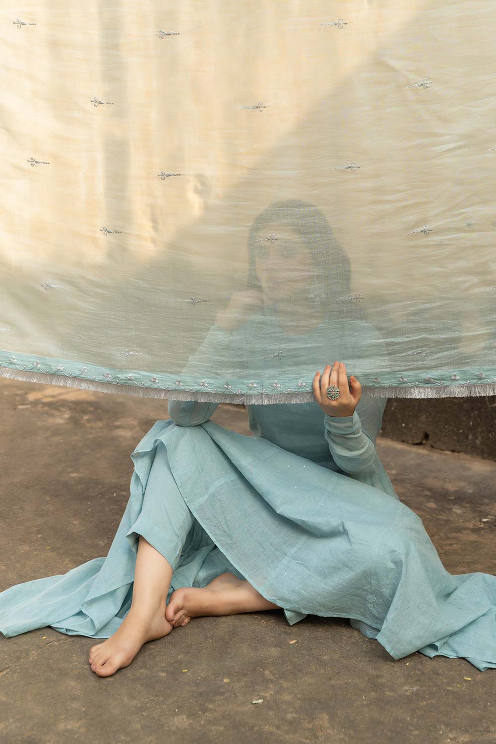 AZURE BLUE HAND BLOCK CHANDERI DUPATTA