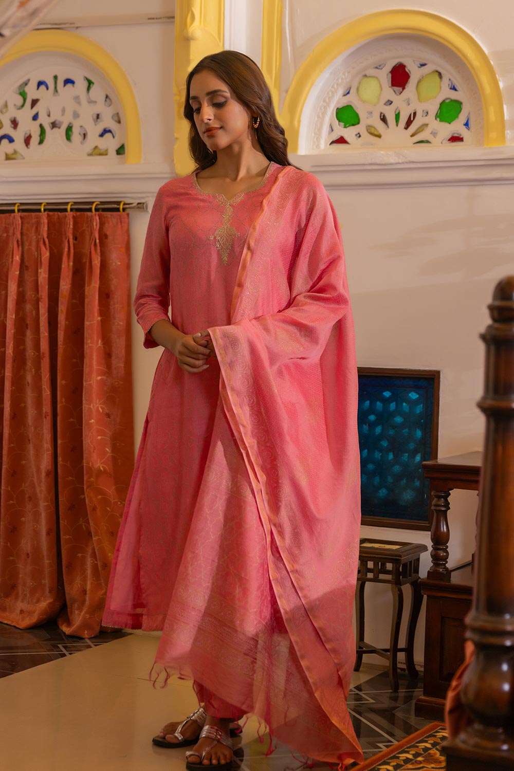 DUPATTA- A flamingo pink pure Chanderi Dupatta, beautifully adorned with traditional gold and khari hand block prints. The premium-quality dupatta, hand-stamped by skilled artisans, the ensemble reflects fine craftsmanship and lends an effortlessly elegant and graceful look.