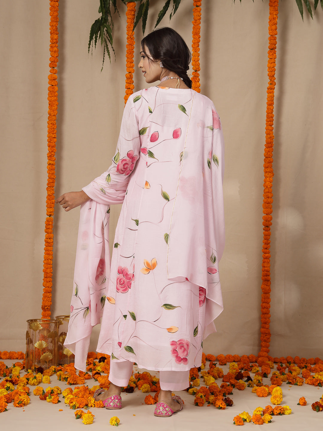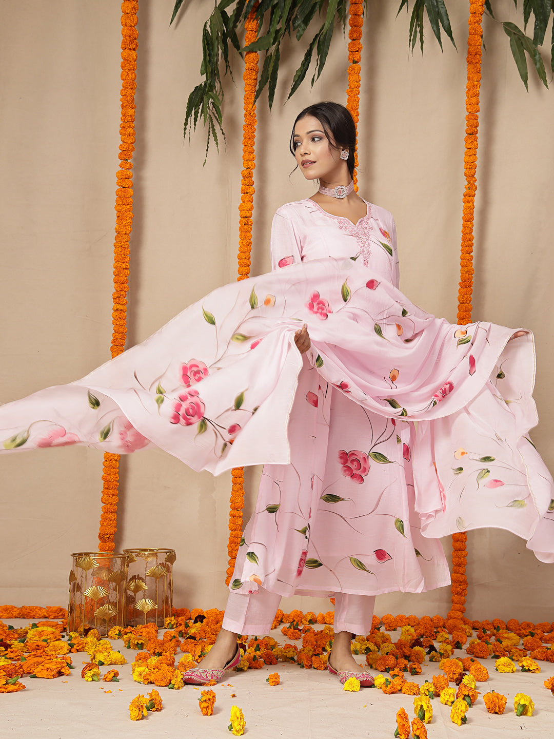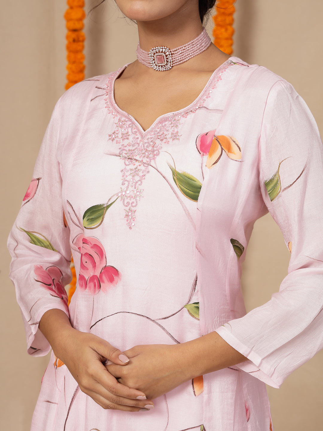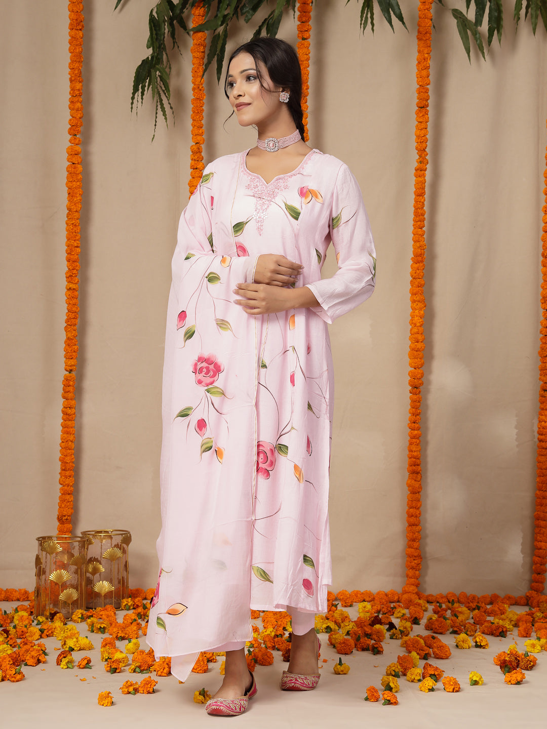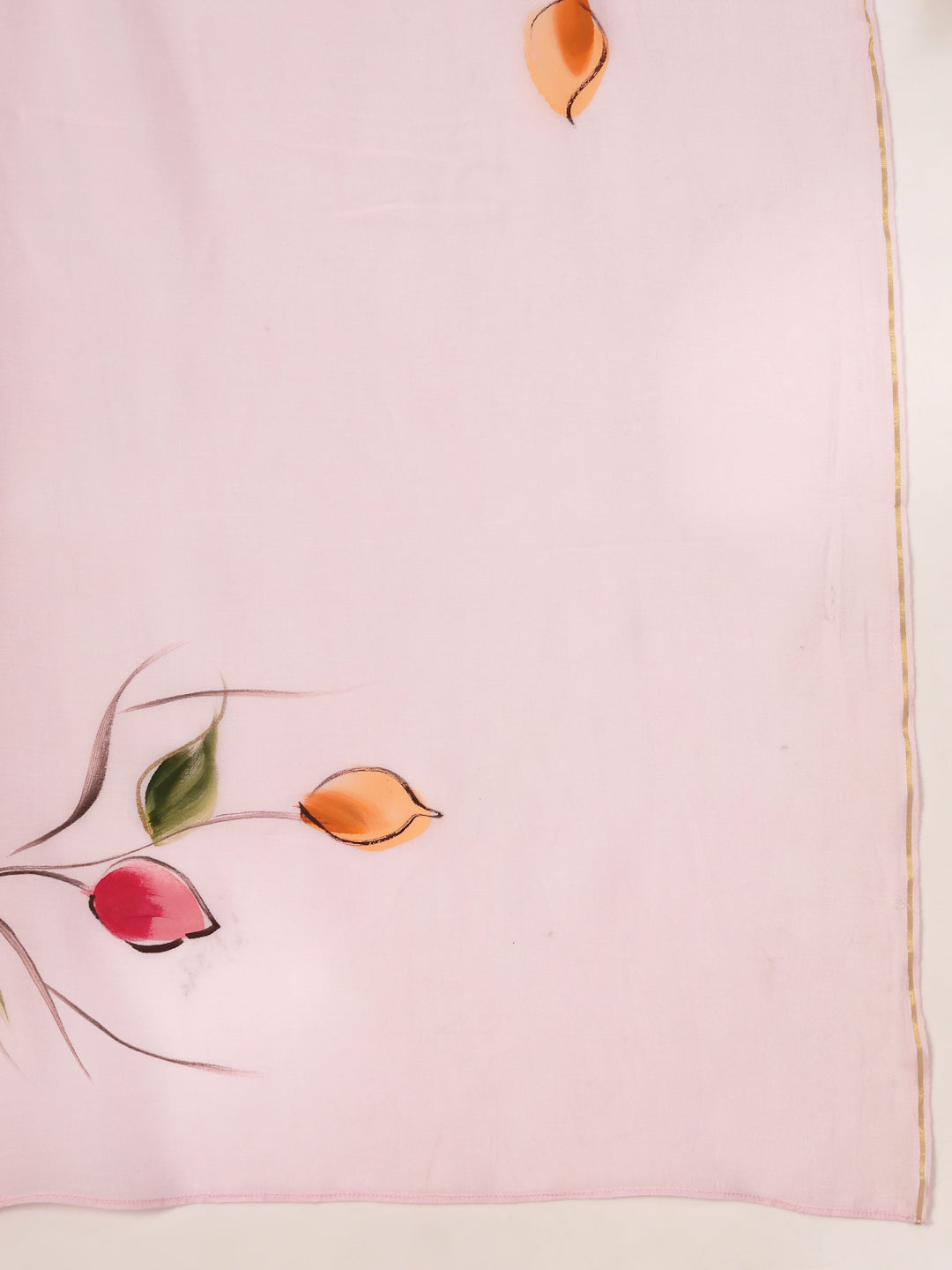 Pink Hand Painted Muslin 3Pcs Suit Set