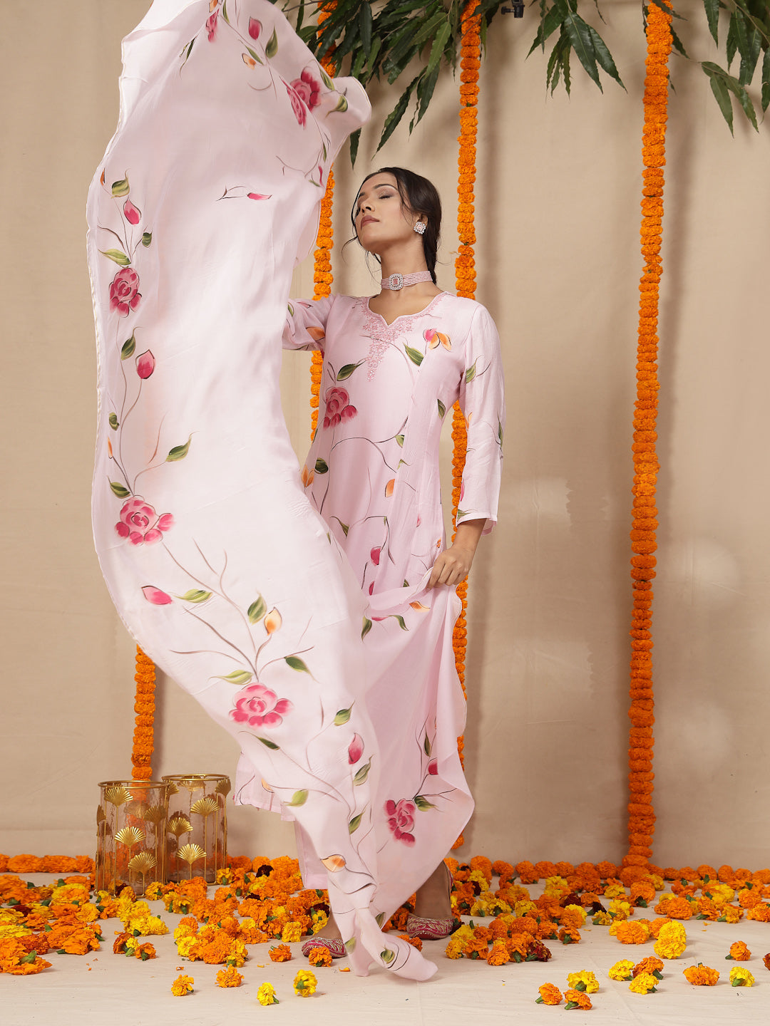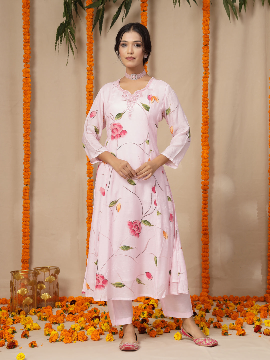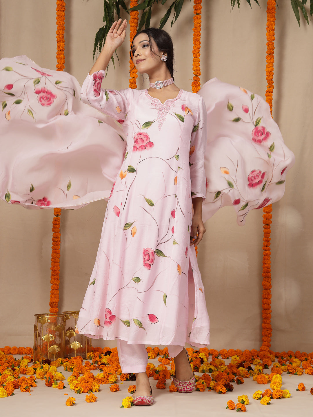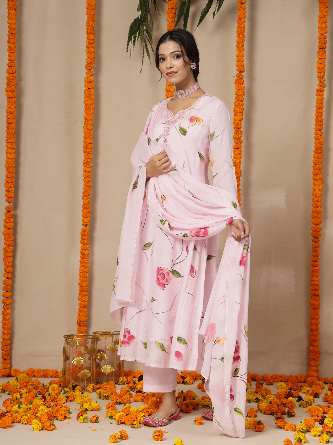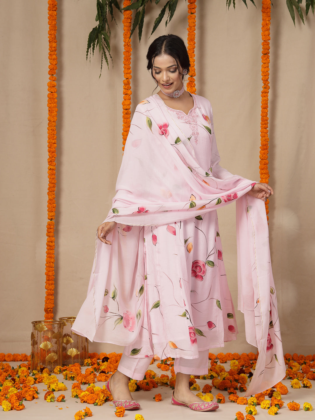 Pink Hand Painted Muslin 3Pcs Suit Set