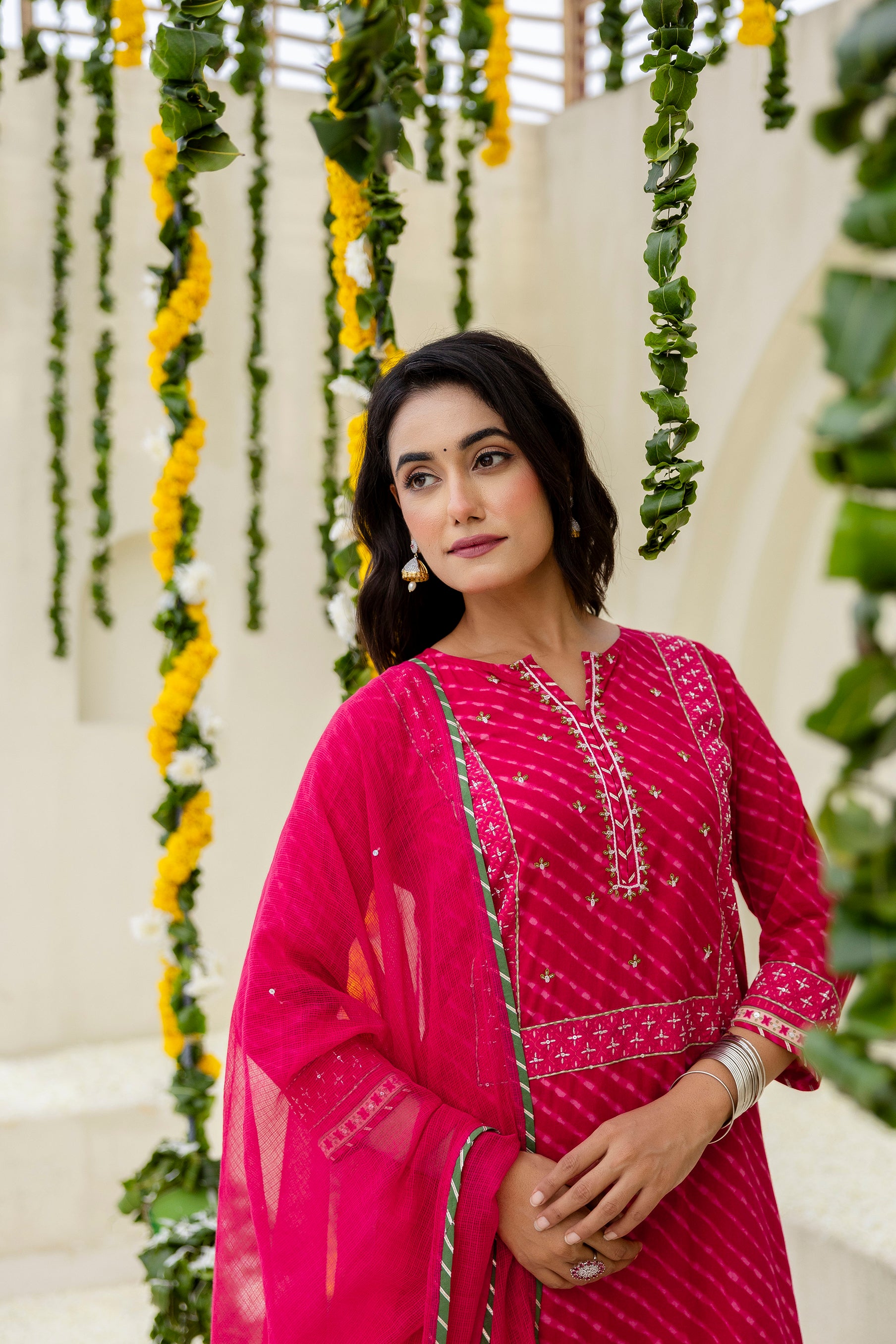Hot Pink Festive Cotton Leheriya Kurta Set | Short Length & Flared Pants | Detailed Handwork
