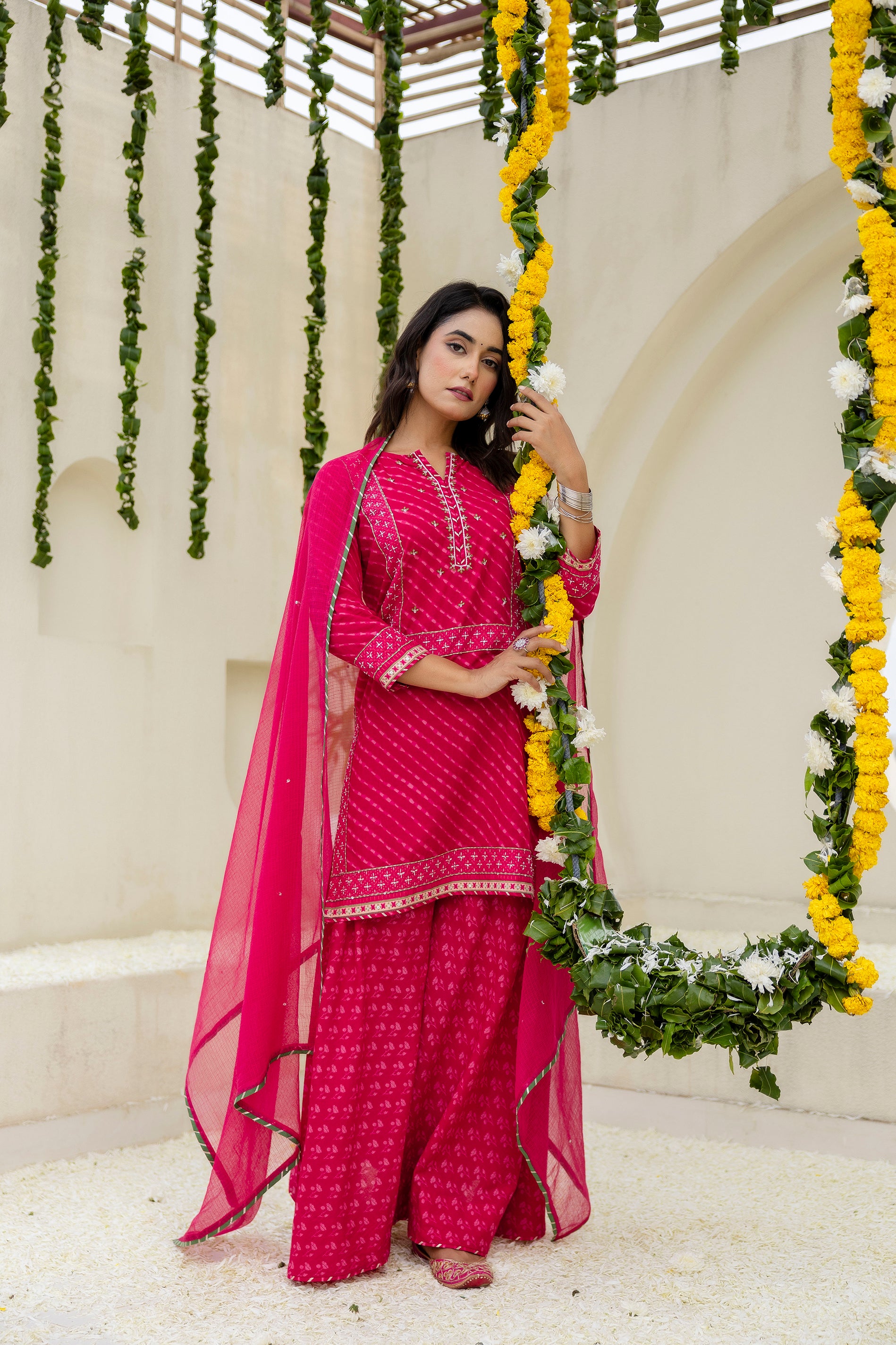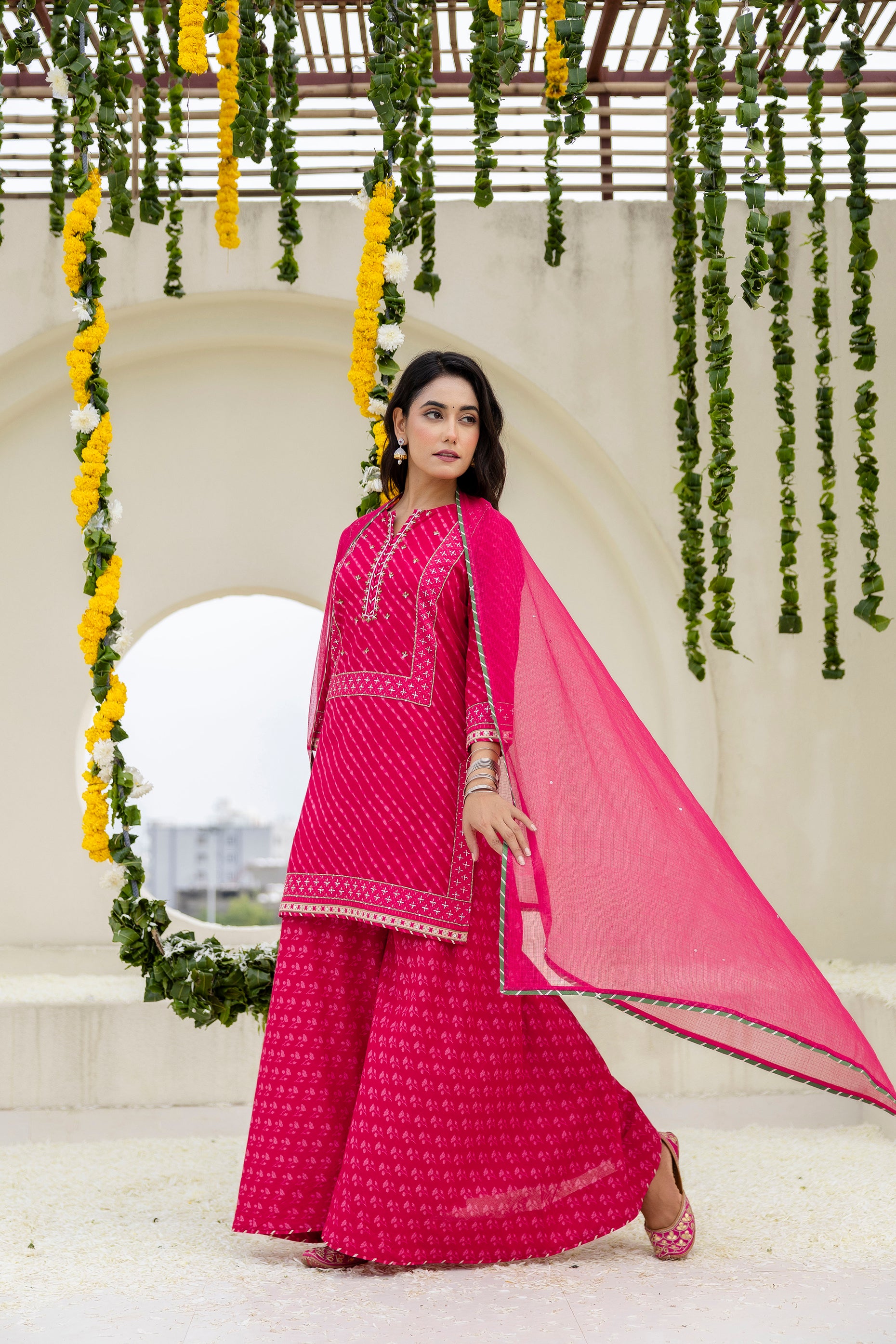 Stunning hot pink leheriya short kurta with intricate handwork, wide leg palazzo, and contrast gota-trim Kota Doria dupatta.