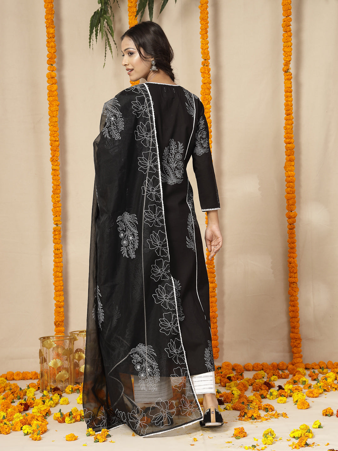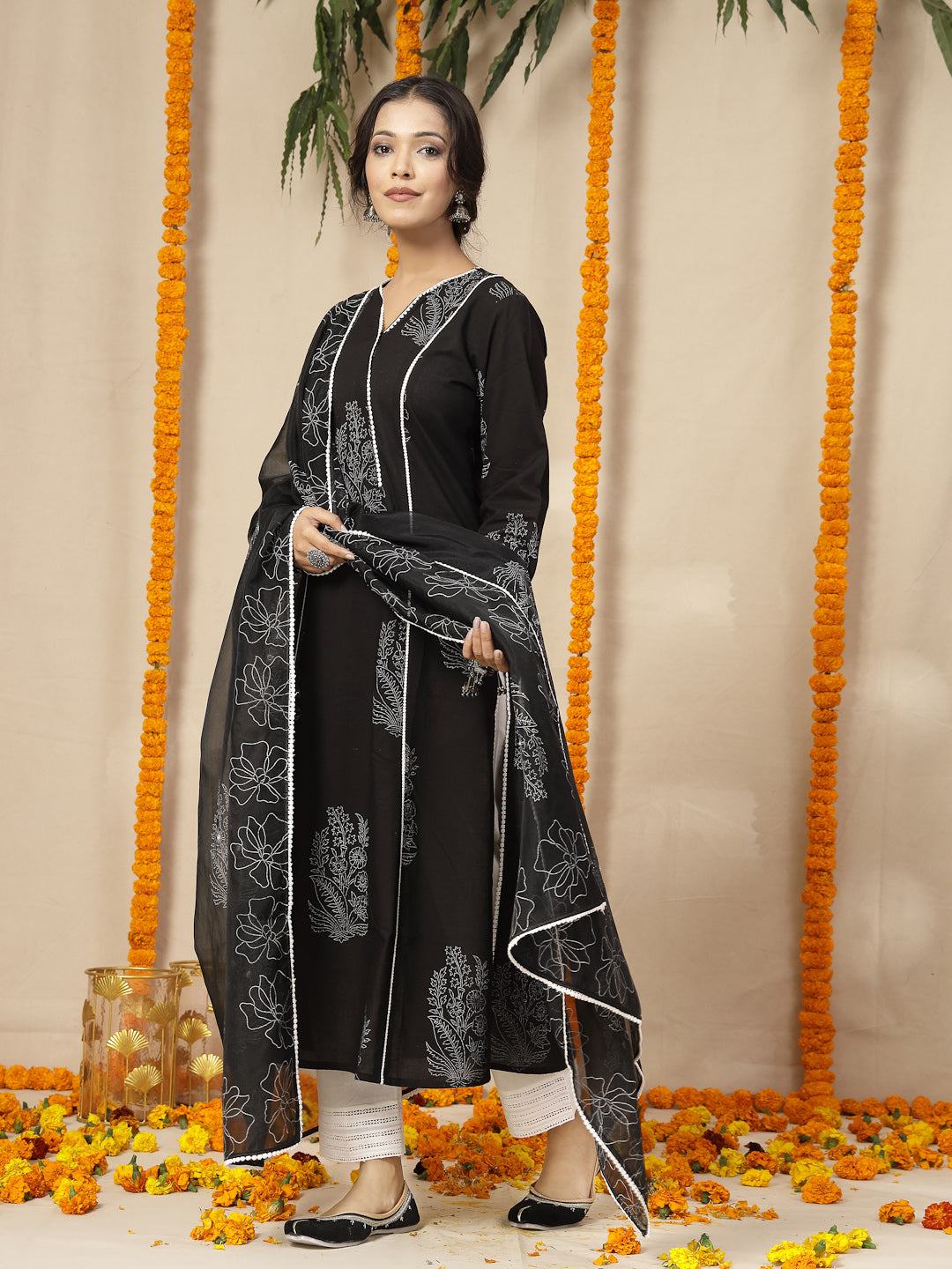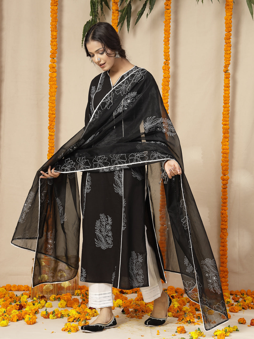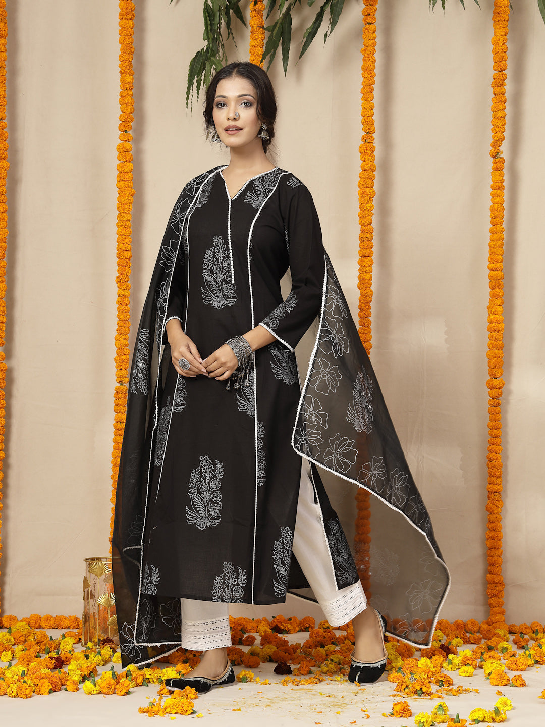 Black And White Hand Block Cotton Kurta & Pants With Hand Work Organza Dupatta
