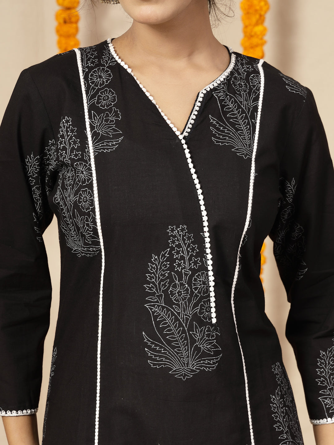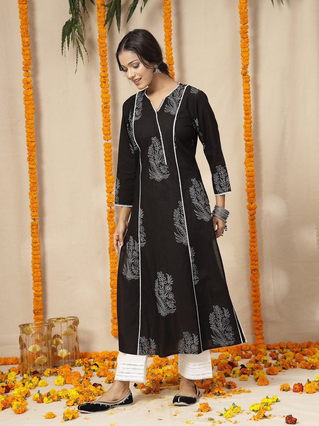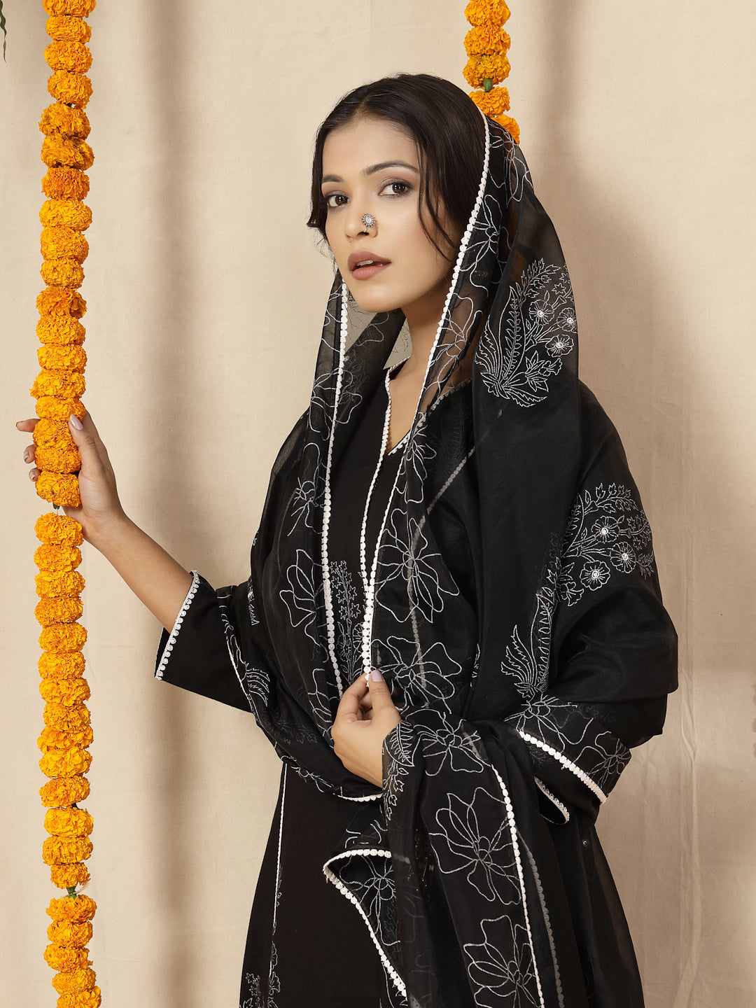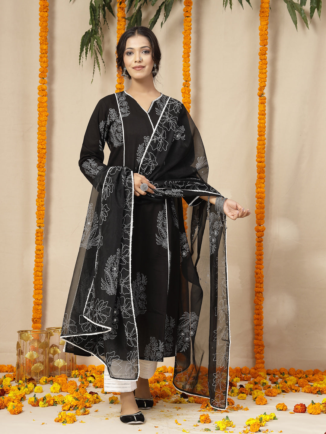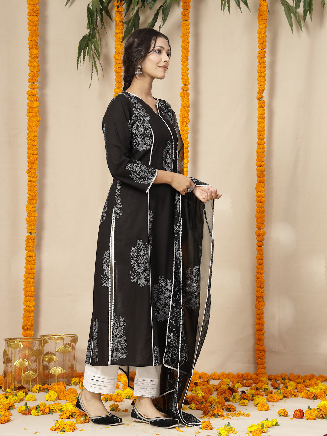 Black And White Hand Block Cotton Kurta & Pants With Hand Work Organza Dupatta