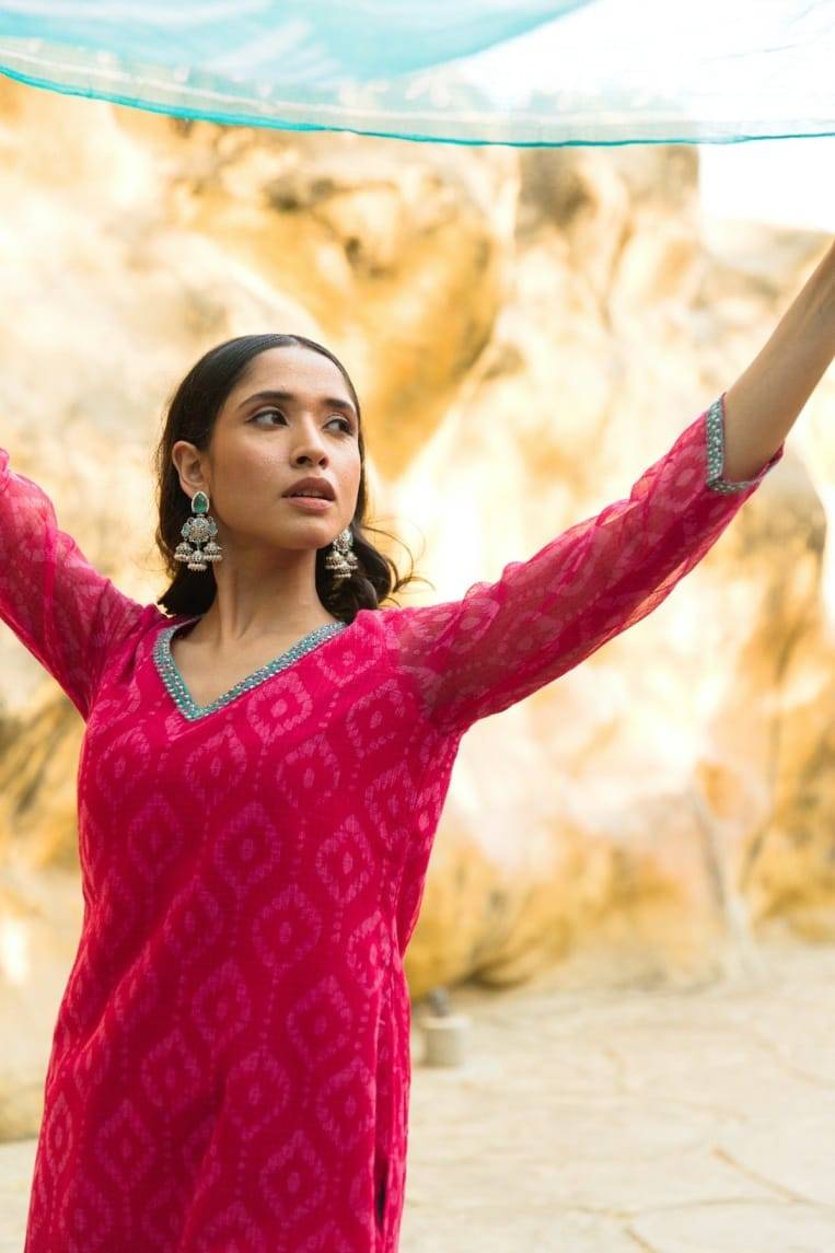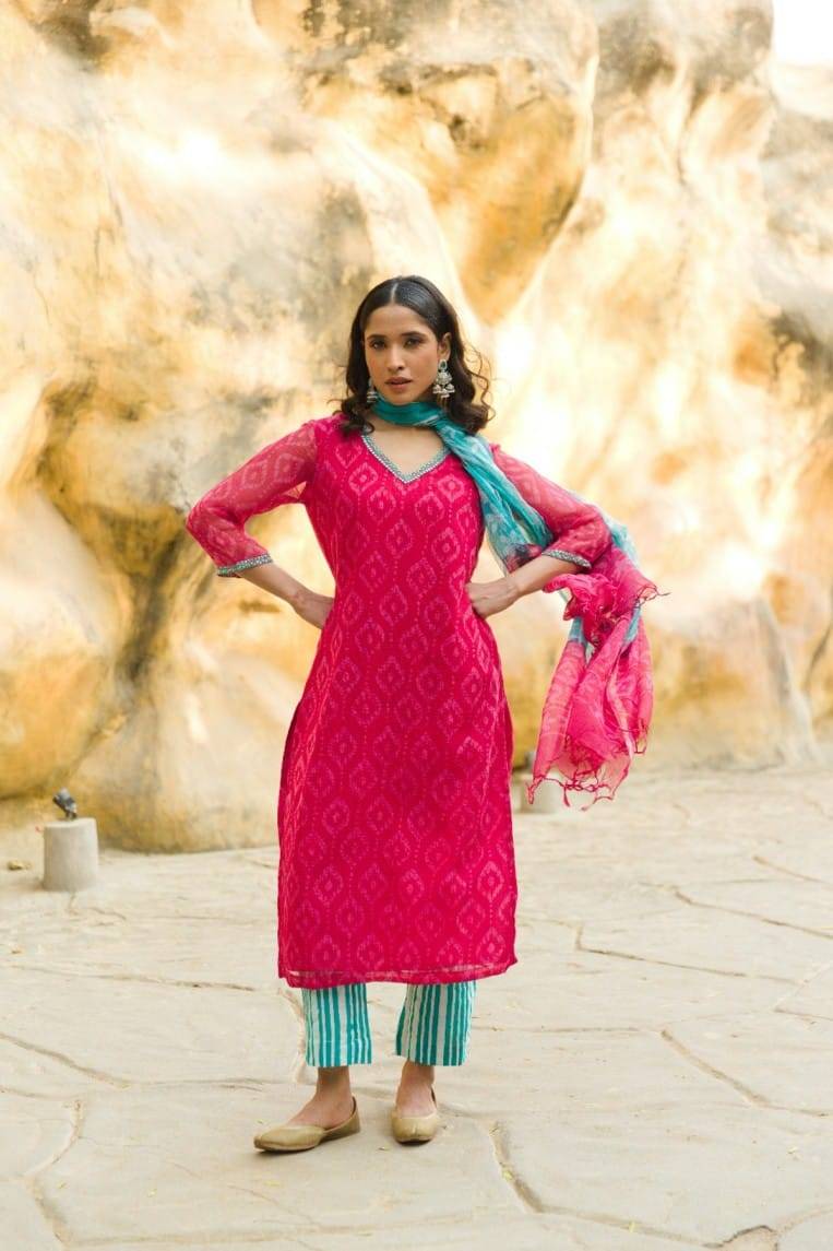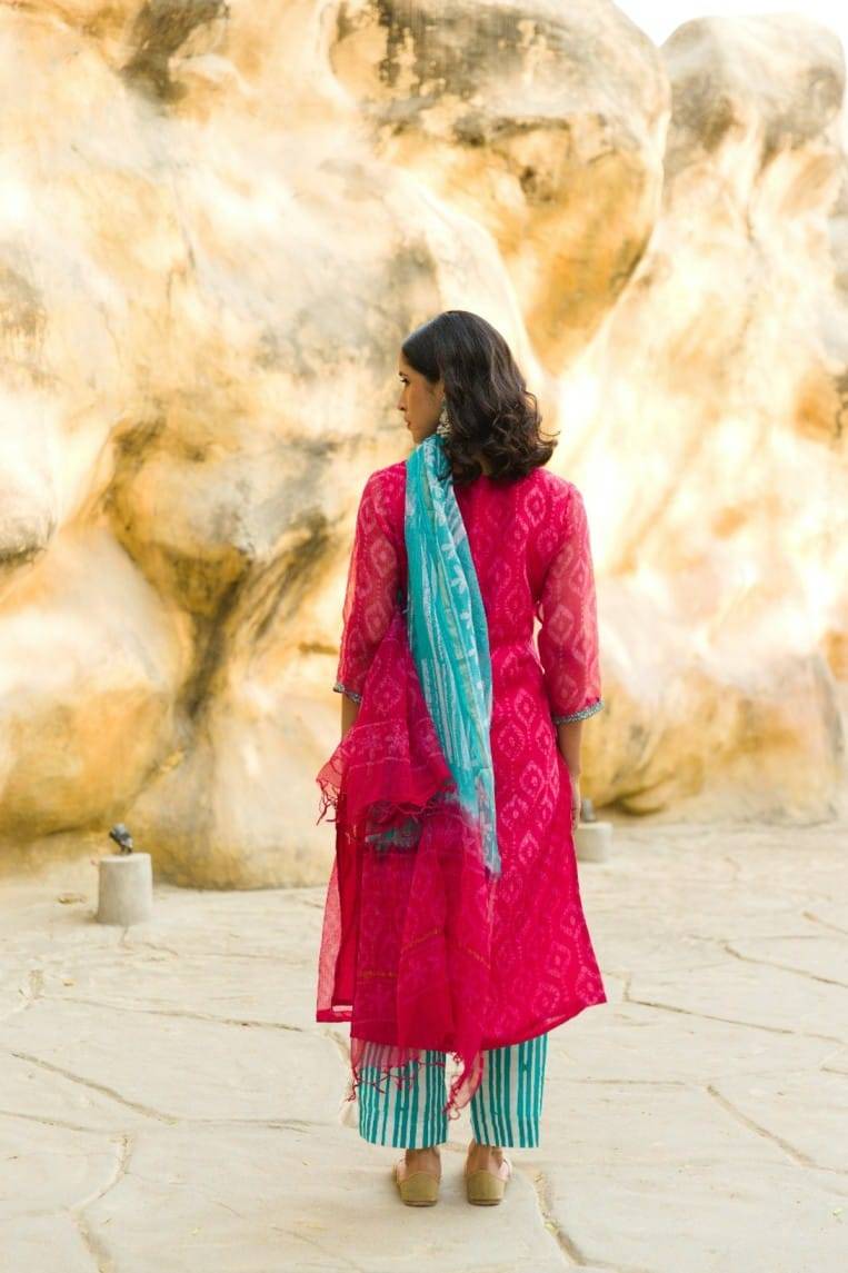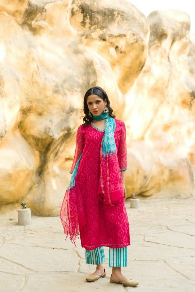 Deep Pink Dabu Print Kota Doria Suit with Turquoise Cotton Pants & Dual-Shade Dupatta