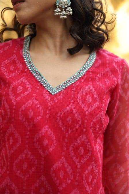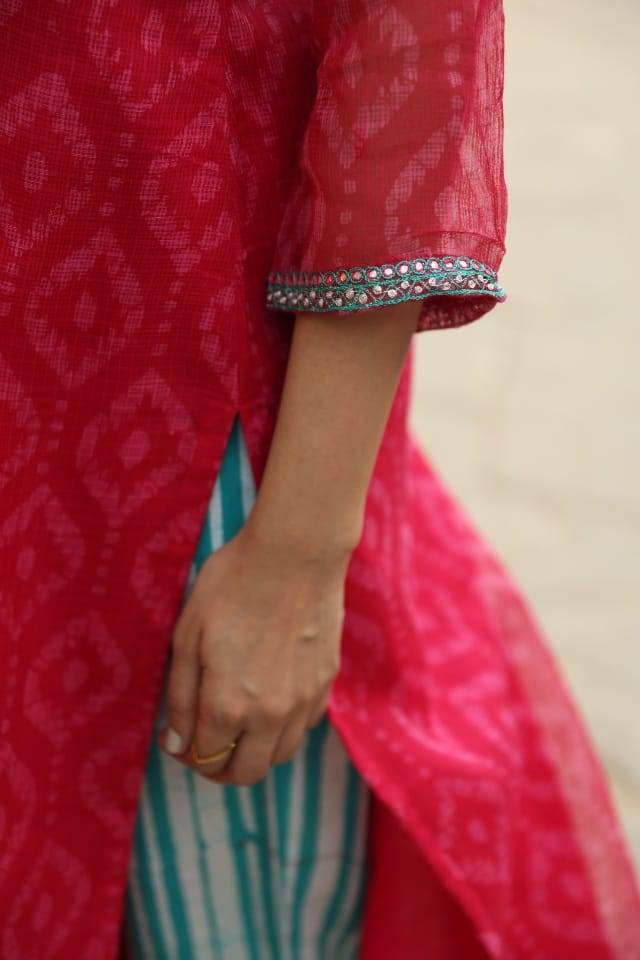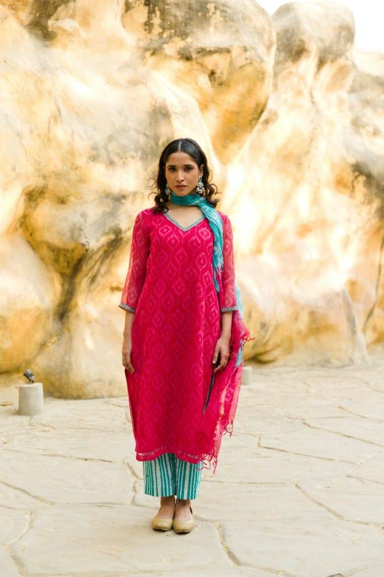 Add timeless elegance to your wardrobe with this Deep Pink Dabu Print Kota Doria Suit. Handcrafted in breathable Kota fabric suit features a beautiful V-neck design with delicate embroidery on the neck and sleeves. The straight-fit silhouette comes with attached the lining for extra comfort and is paired with turquoise cotton pants for a striking contrast. Completing the look is a two-shade dupatta that adds a touch of versatility and sophistication. Perfect for festive gatherings, office wear, or casual outings, this suit blends traditional craftsmanship with.