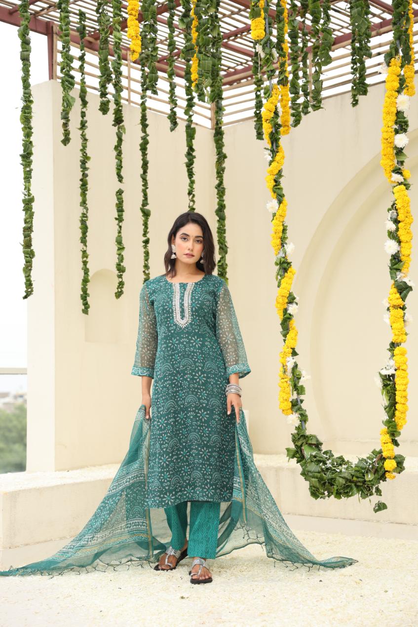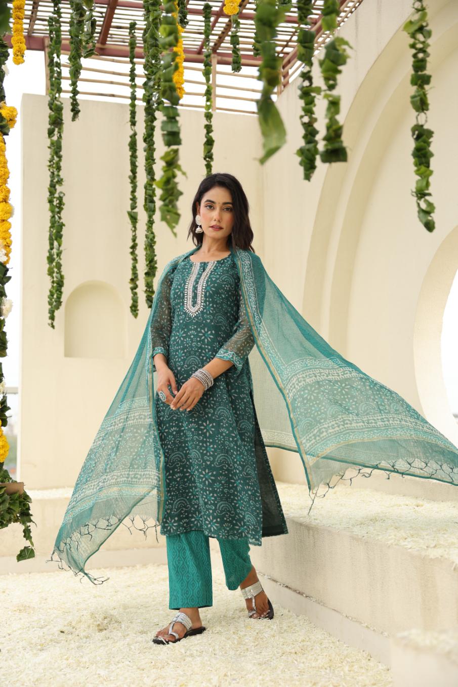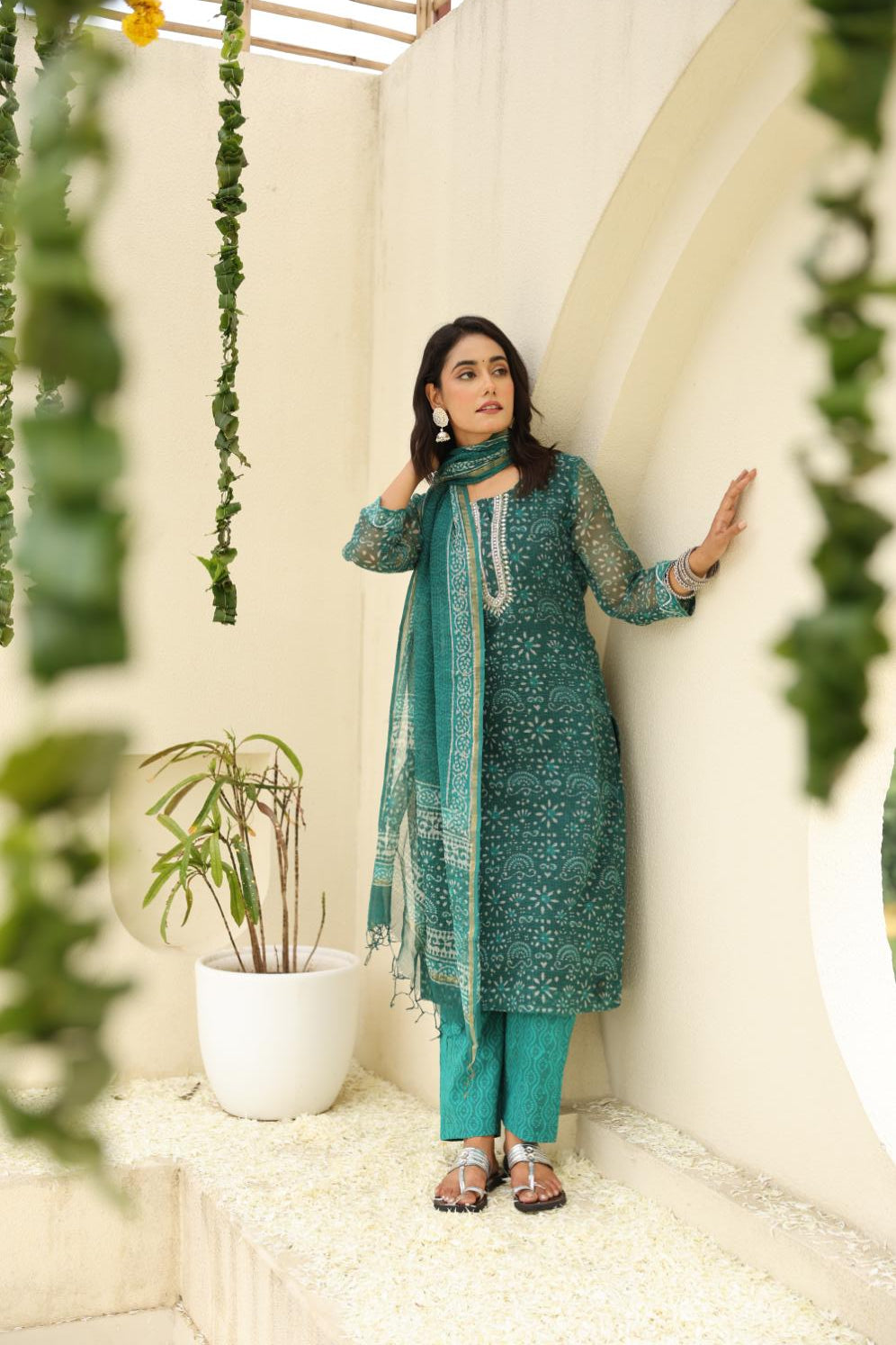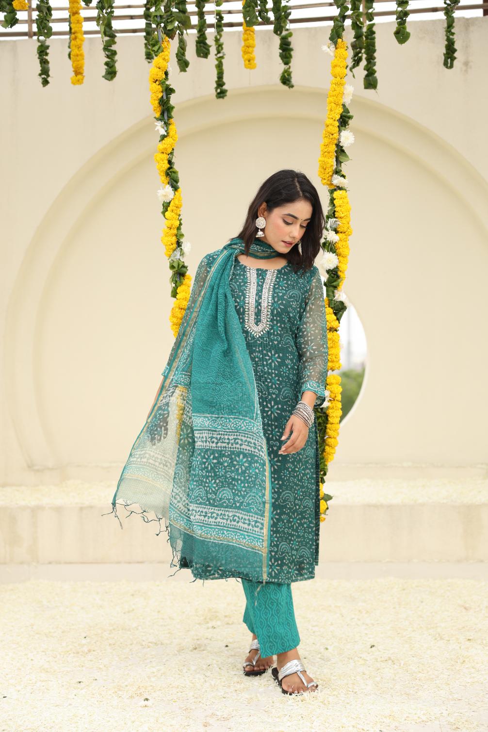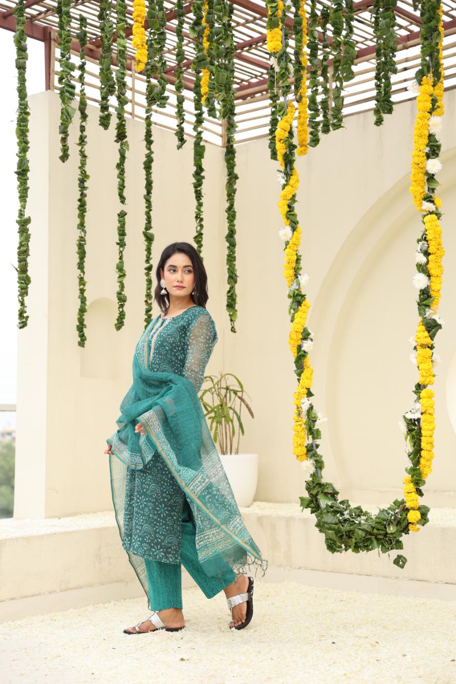 Forest Green Kota Doria Dabu Print Suit Set with Cotton Pants & Kota Dupatta