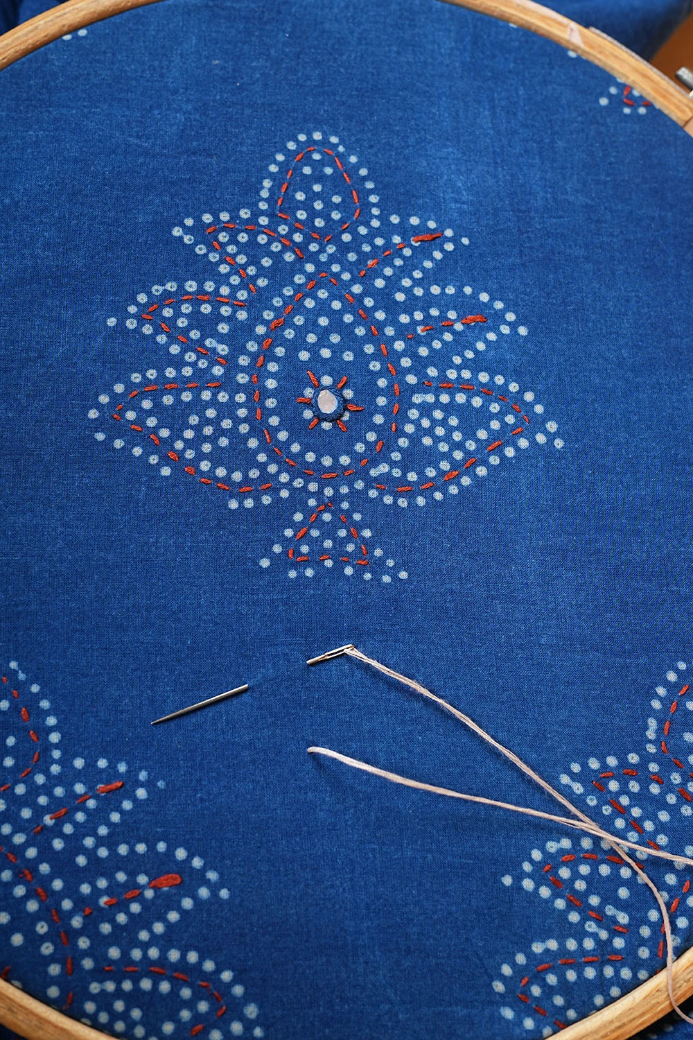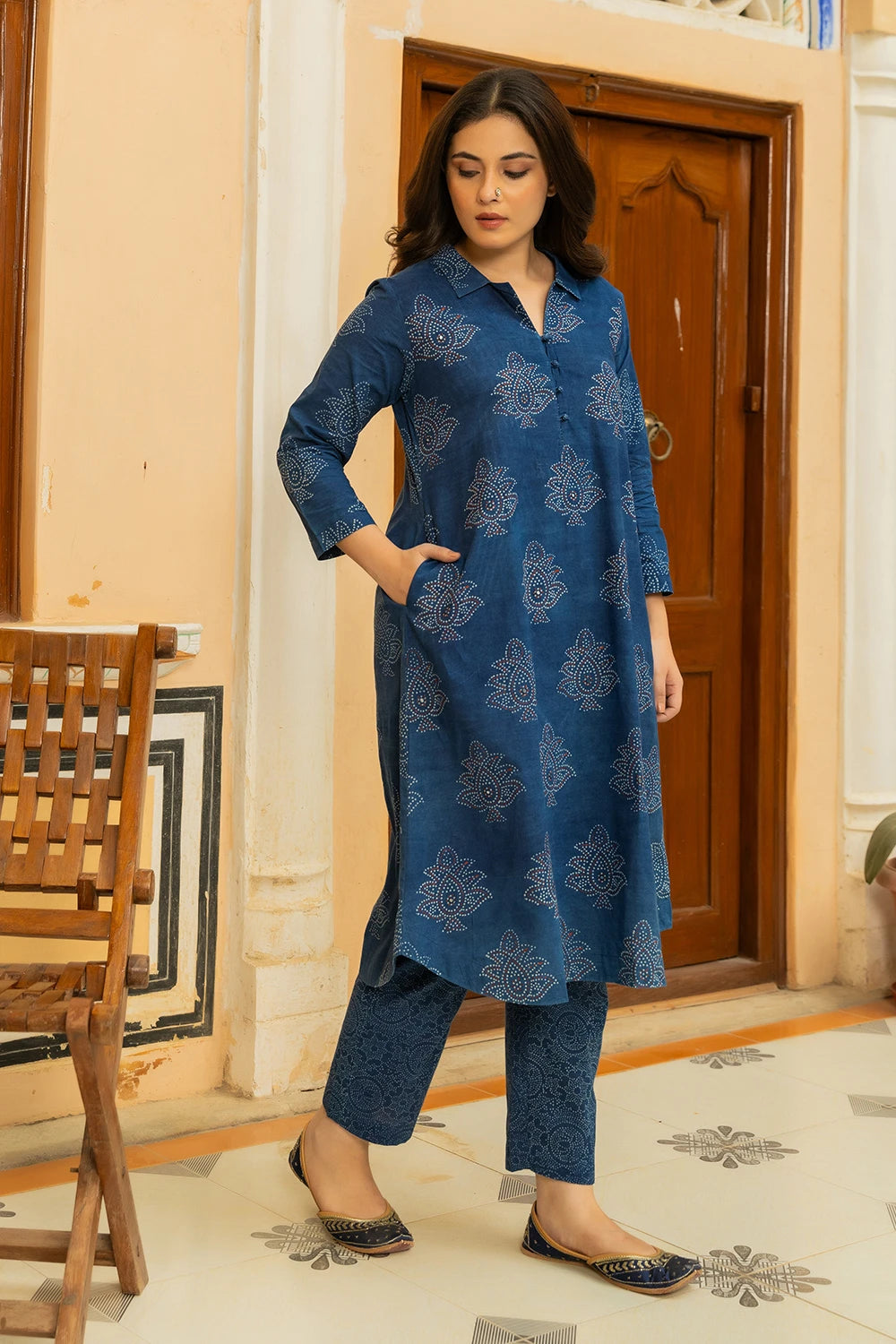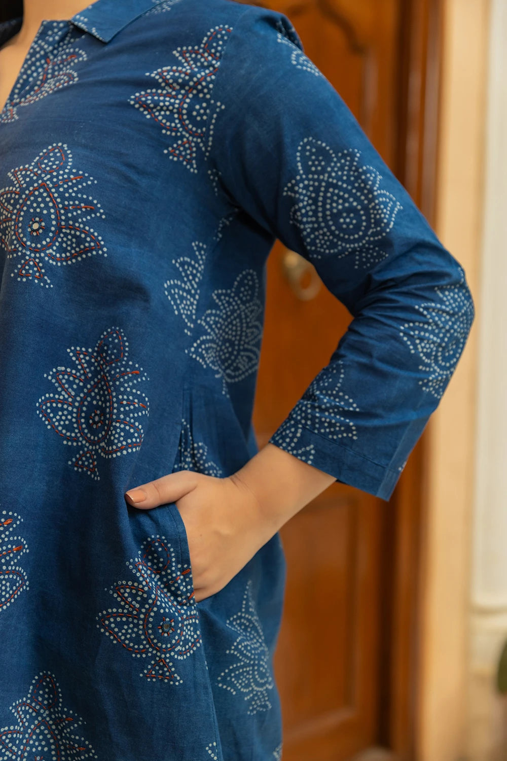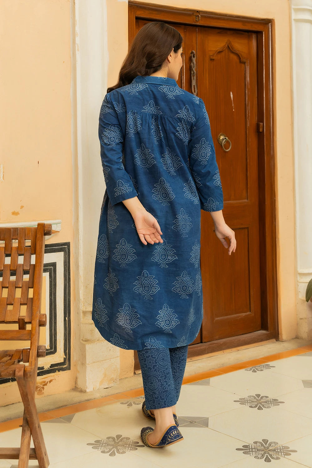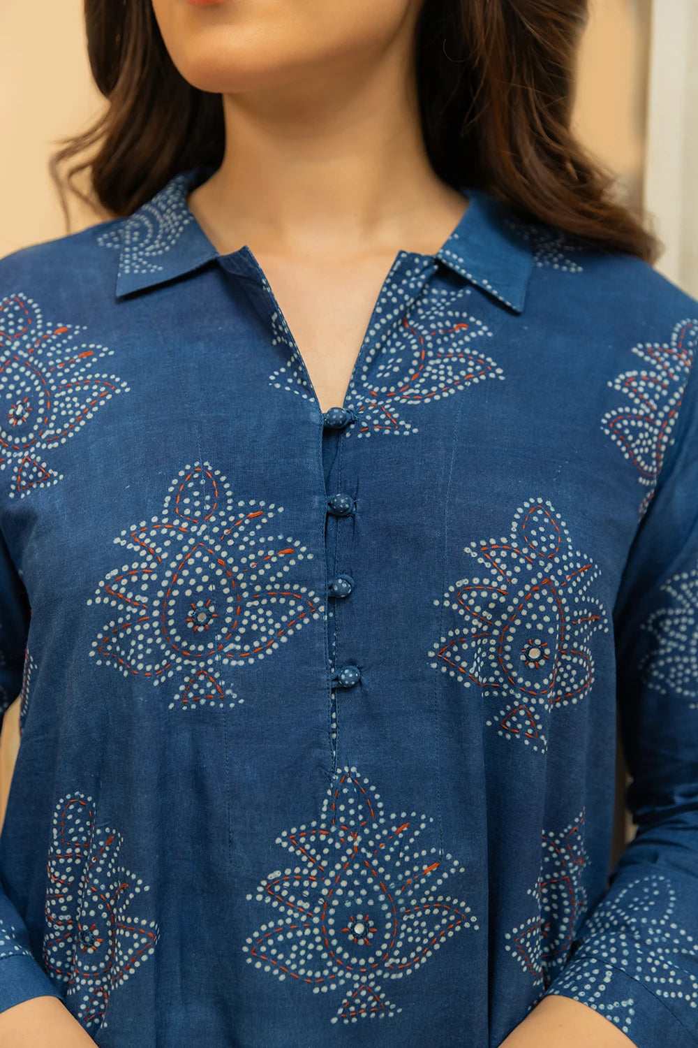 Indigo Cotton Block Print Katha Mirror Work Co-Ord Set - Set Of 2