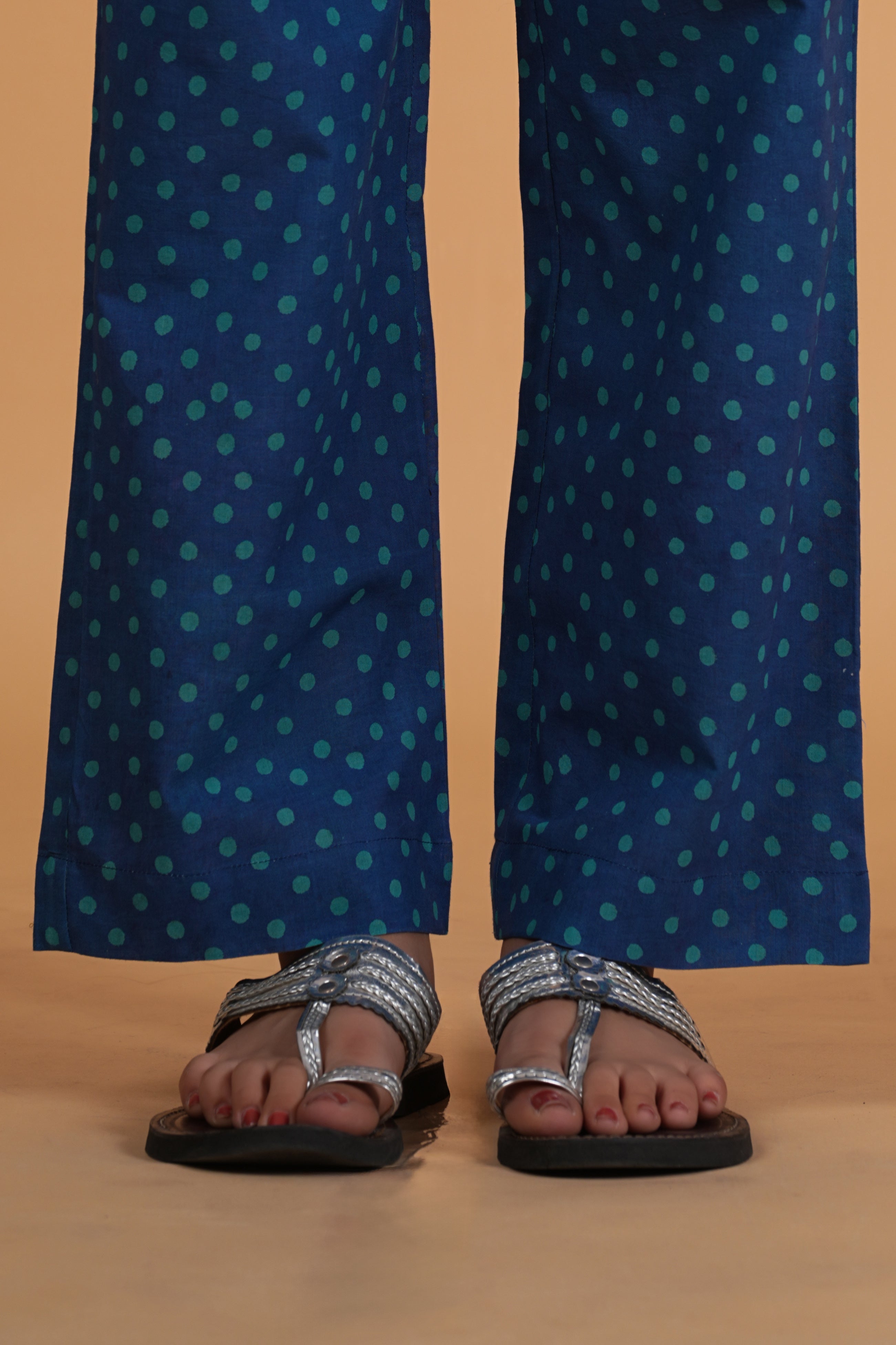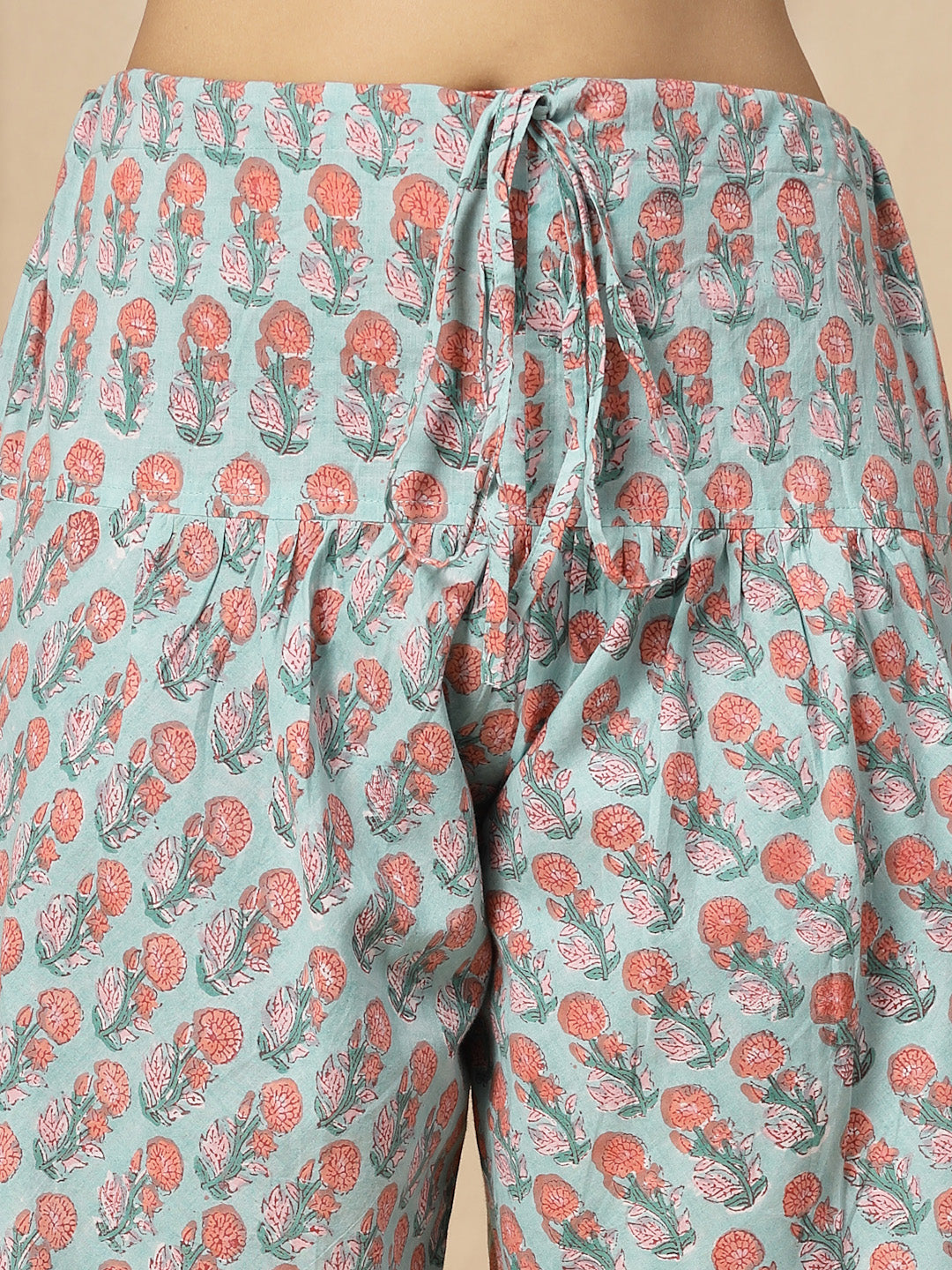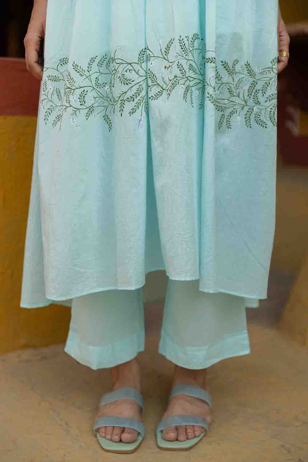Aqua Blue Chanderi Block Print A Line Kurta With Pants - Set Of 2