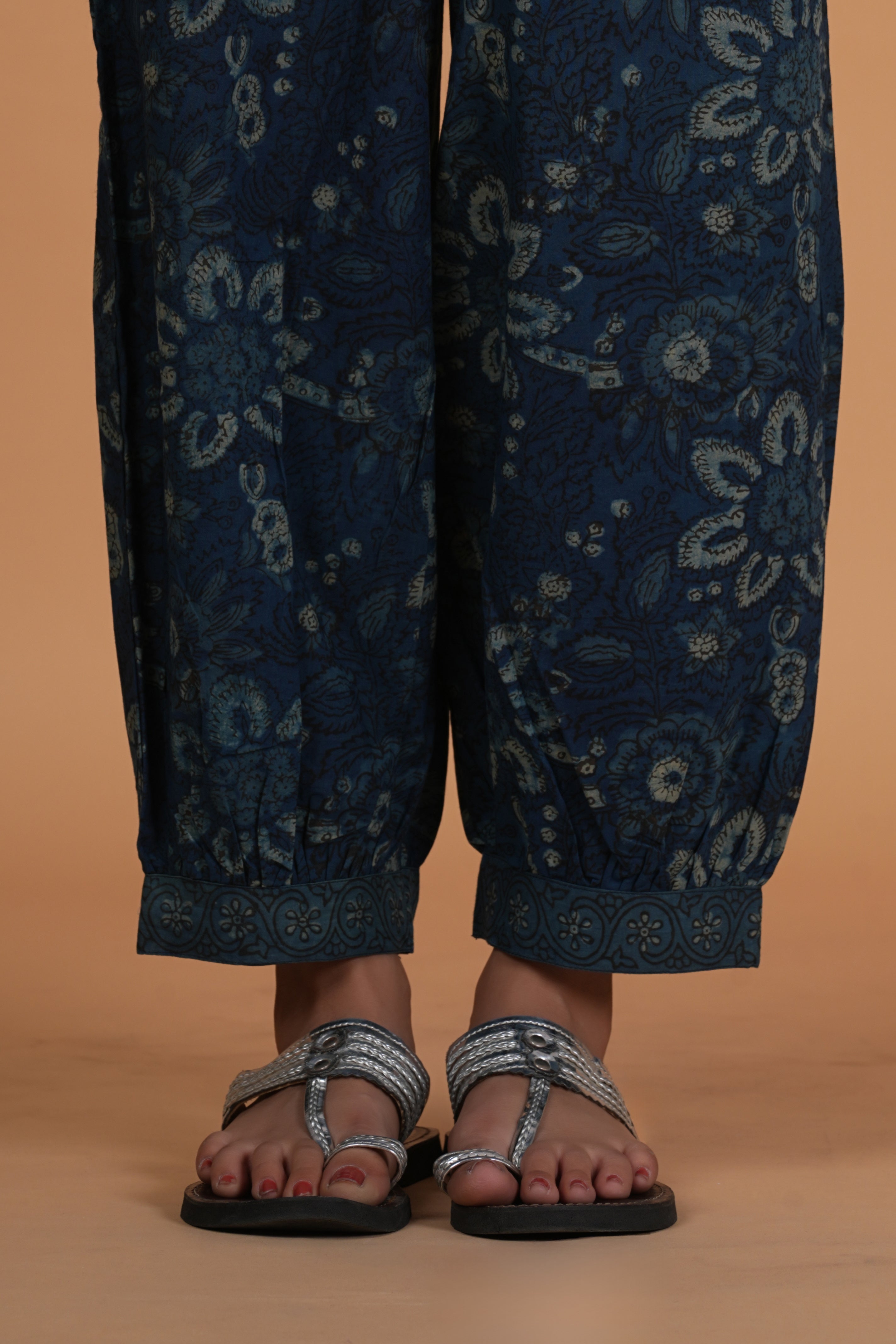 Natural Indigo Dobby Print Overlap Kurta with Pants – Handwoven Cotton Set