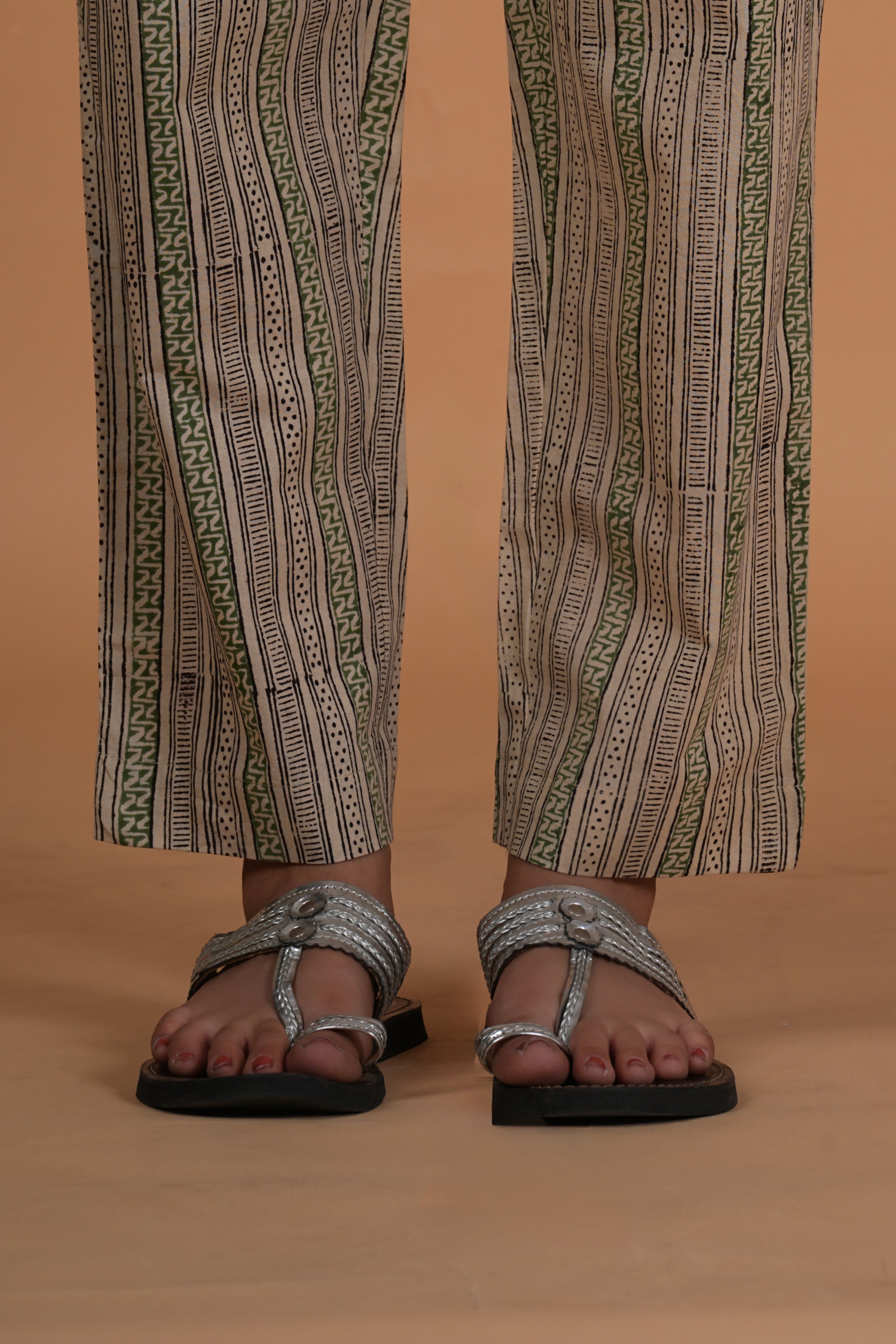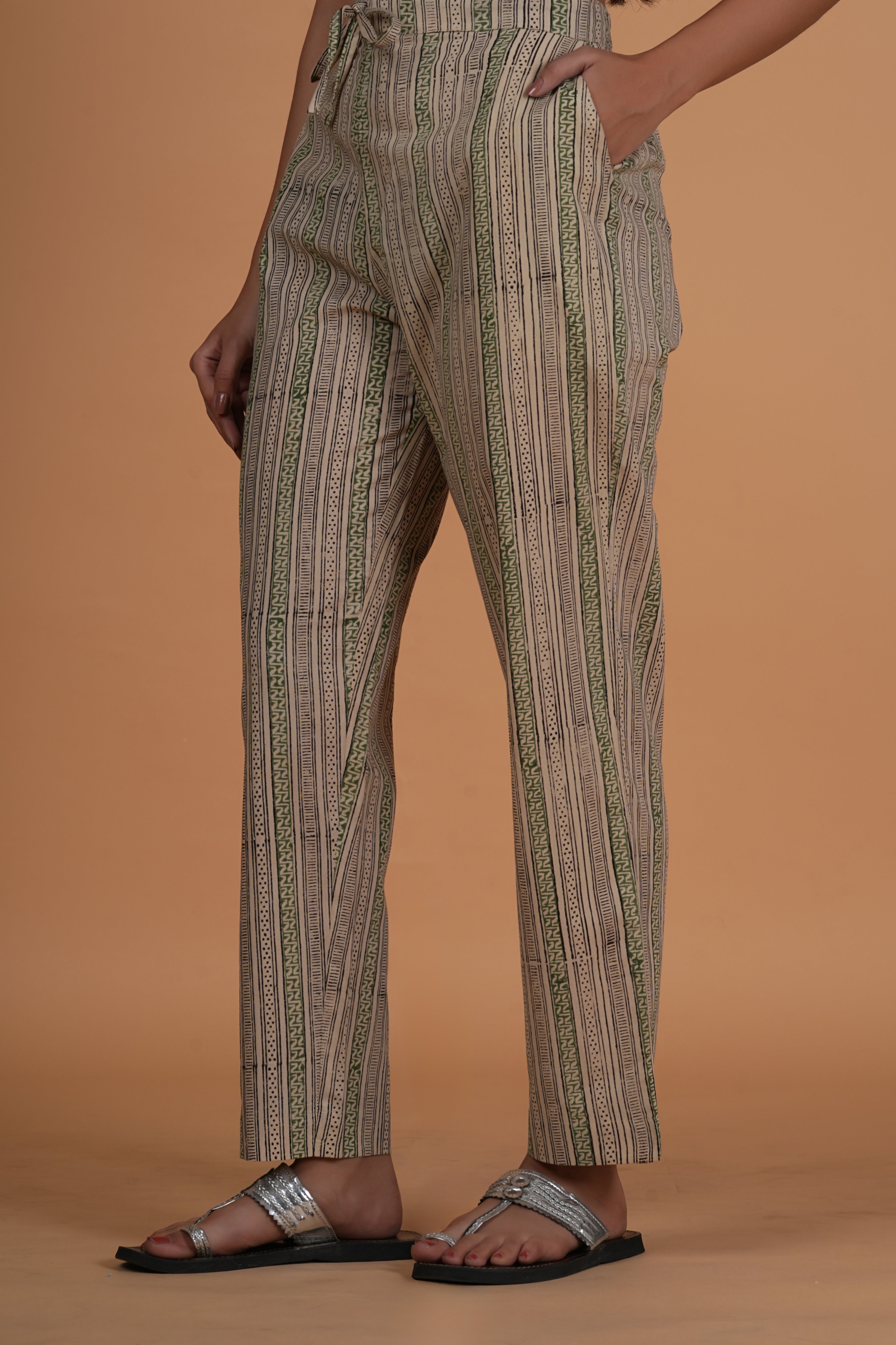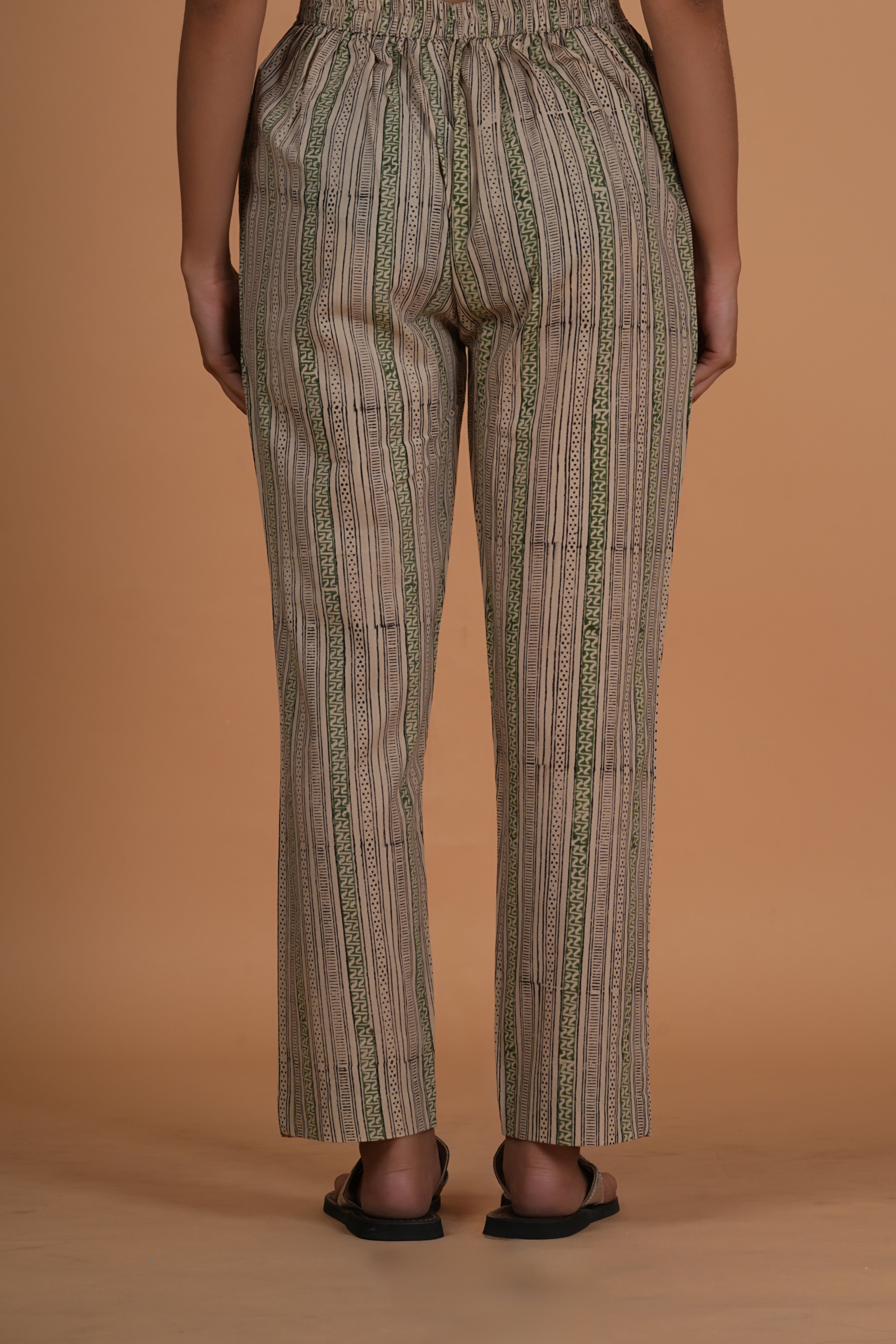 BOTTOM- These straight fit Bagru print cotton pants feature two side pockets and a semi-elasticated waistband with drawstring for adjustable comfort. fabric- cotton colour- natural bagru earthy tone