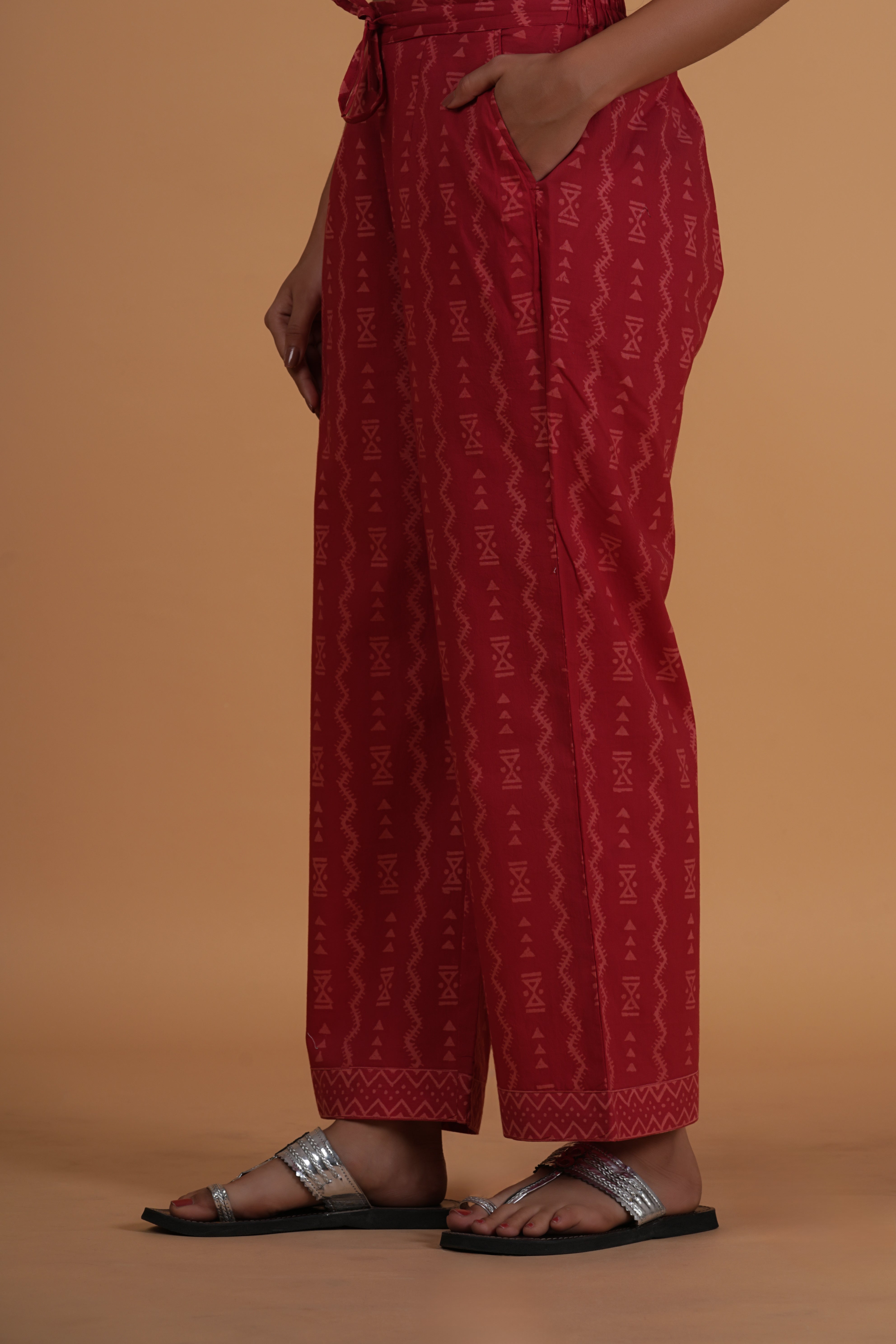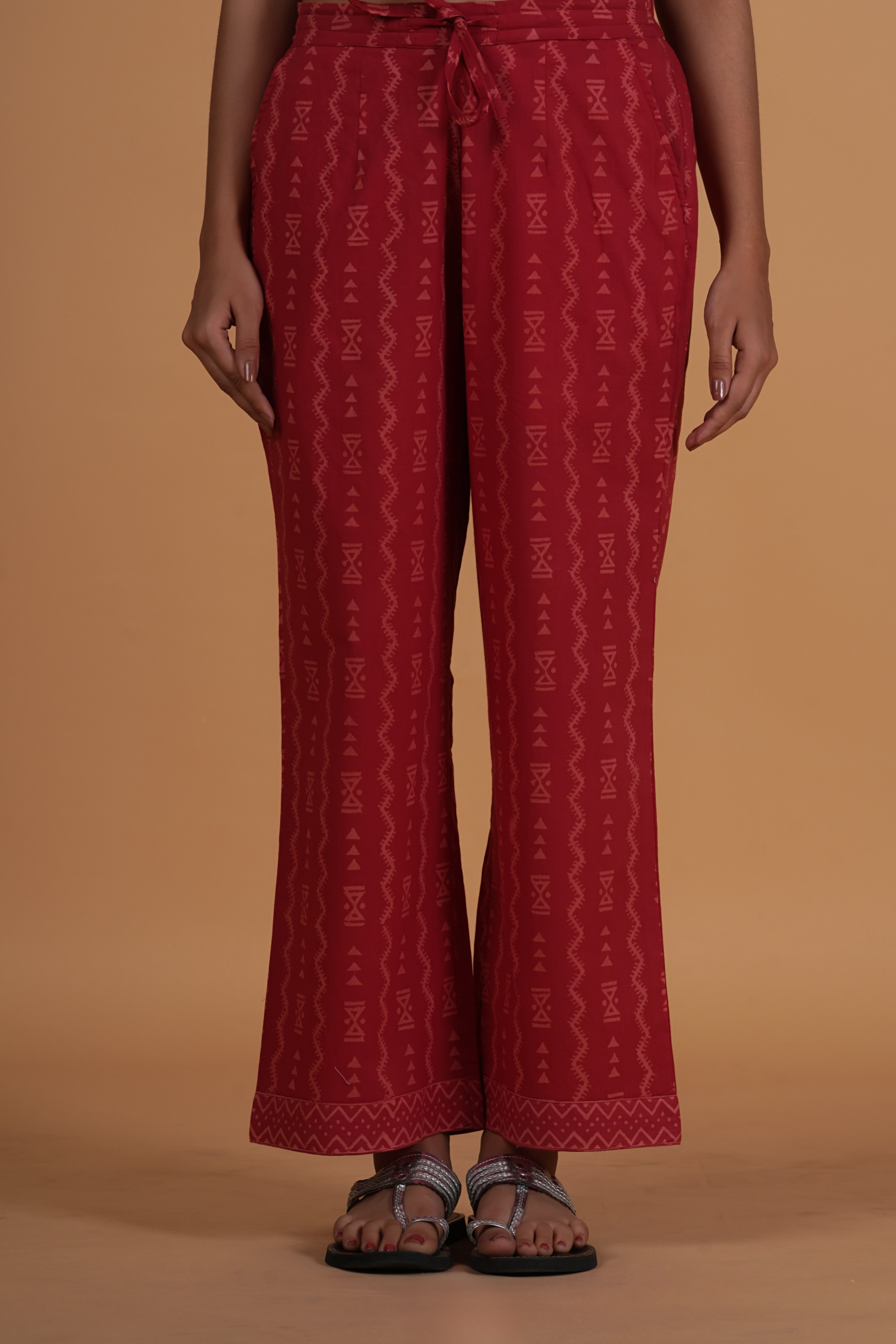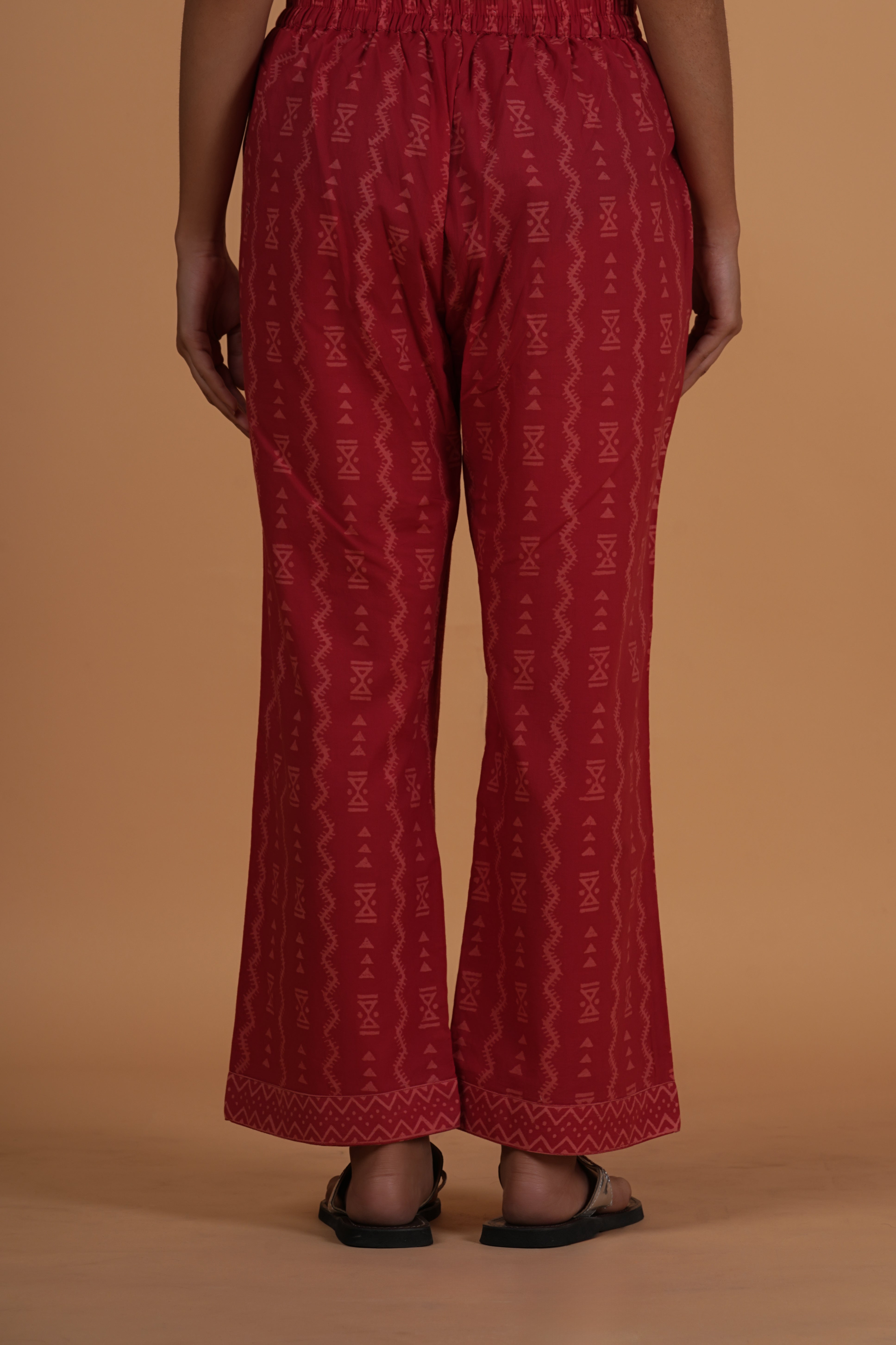 This red cotton straight-fit pants feature a classic Dabu print with a half-elasticated waistband and adjustable drawstring for everyday comfort. Finished with two functional pockets, they’re easy, breathable, and versatile for daily wear