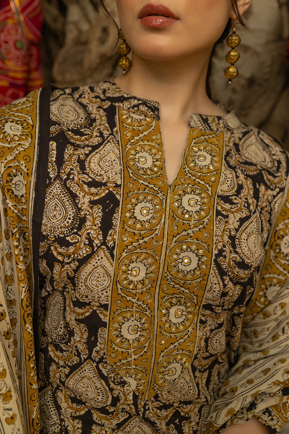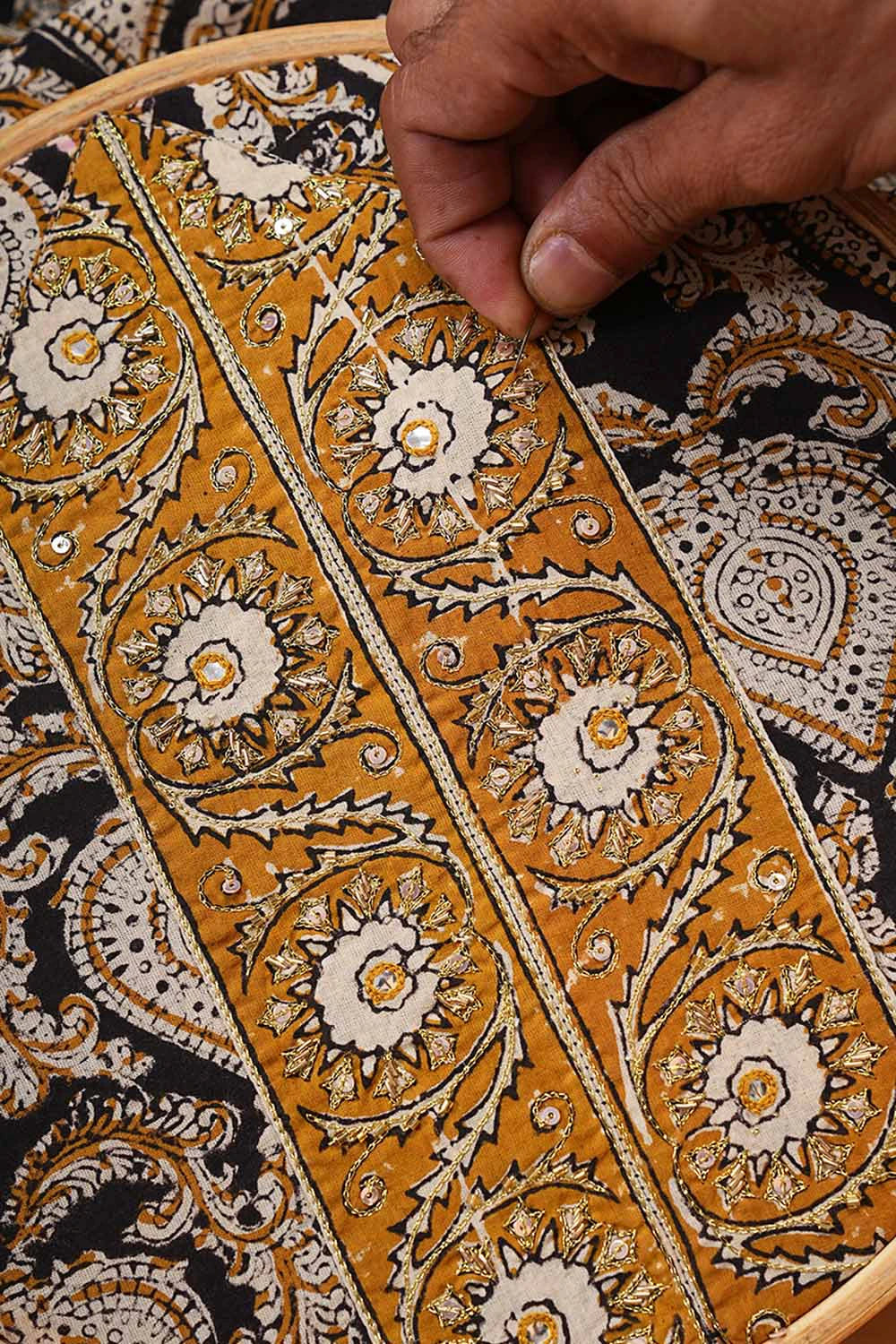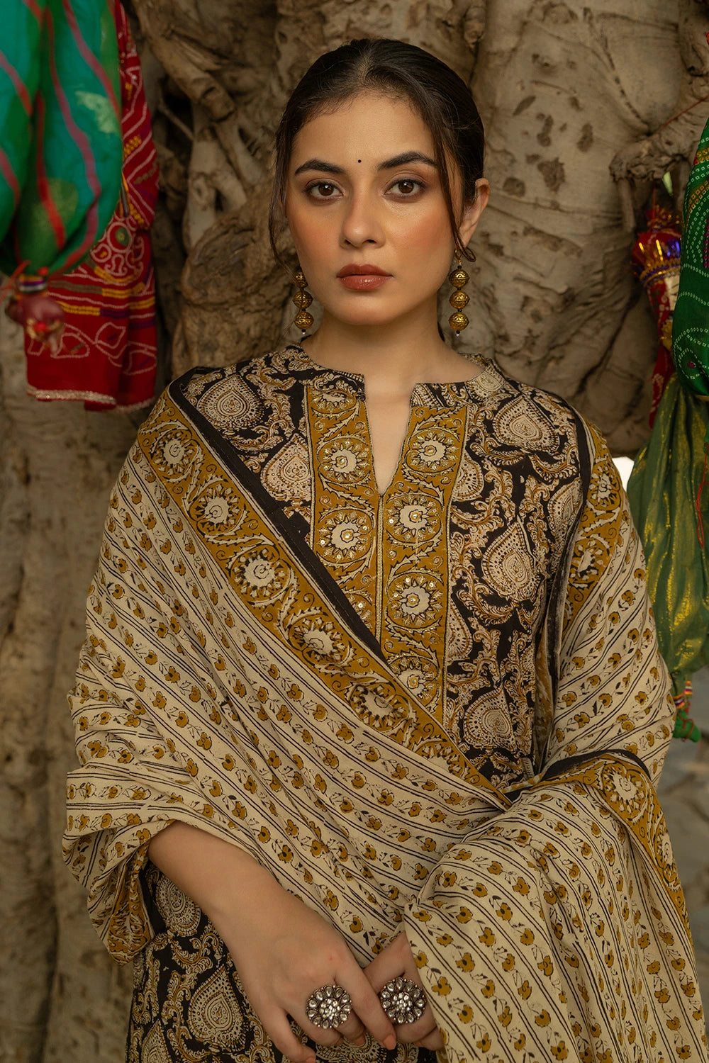 • This Stunning Cotton Bagru Print Straight Suit In Black And Mustard Is Designed For Elegance And Comfort. Adorned With Intricate Zari Needle Work On The Placket And Sleeves, This Ensemble Radiates Traditional Charm. Paired With A Matching Bagru Print Malmal Dupatta. A Beautiful Fusion Of Traditional Bagru Print And Fine Zari Needle Work. O Ideal For Those Looking For An Ethnic Yet Contemporary Outfit With An Artisanal Touch. A Beautiful Fusion Of Traditional Bagru Print And Fine Zari Needle Work. O Ideal For Those Looking For An Ethnic Yet Contemporary Outfit With An Artisanal Touch.