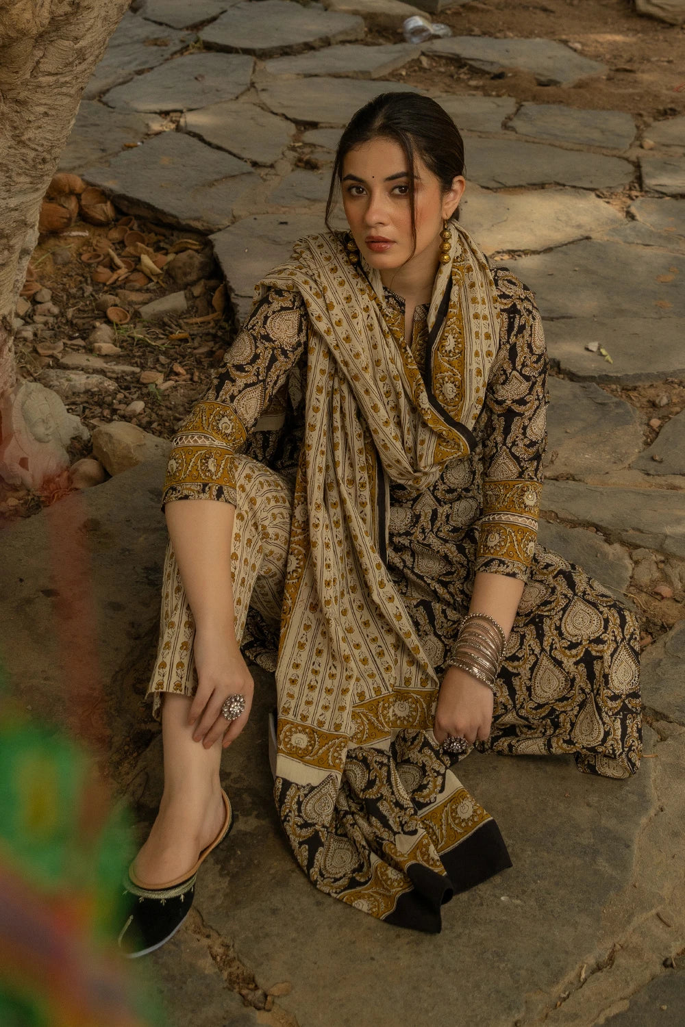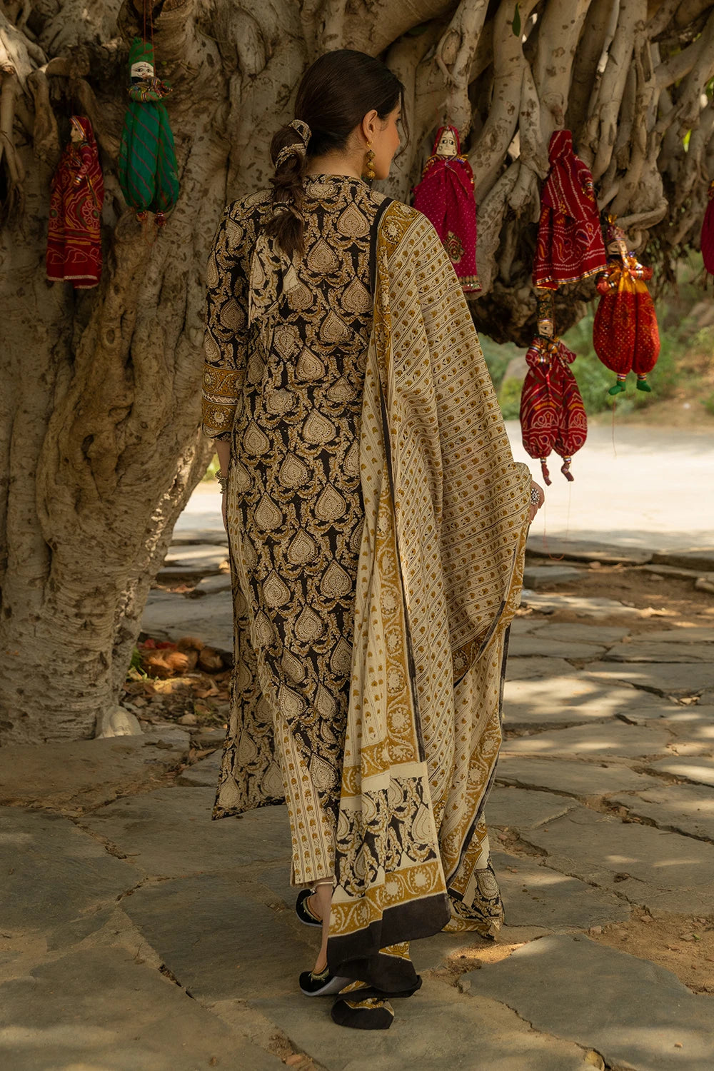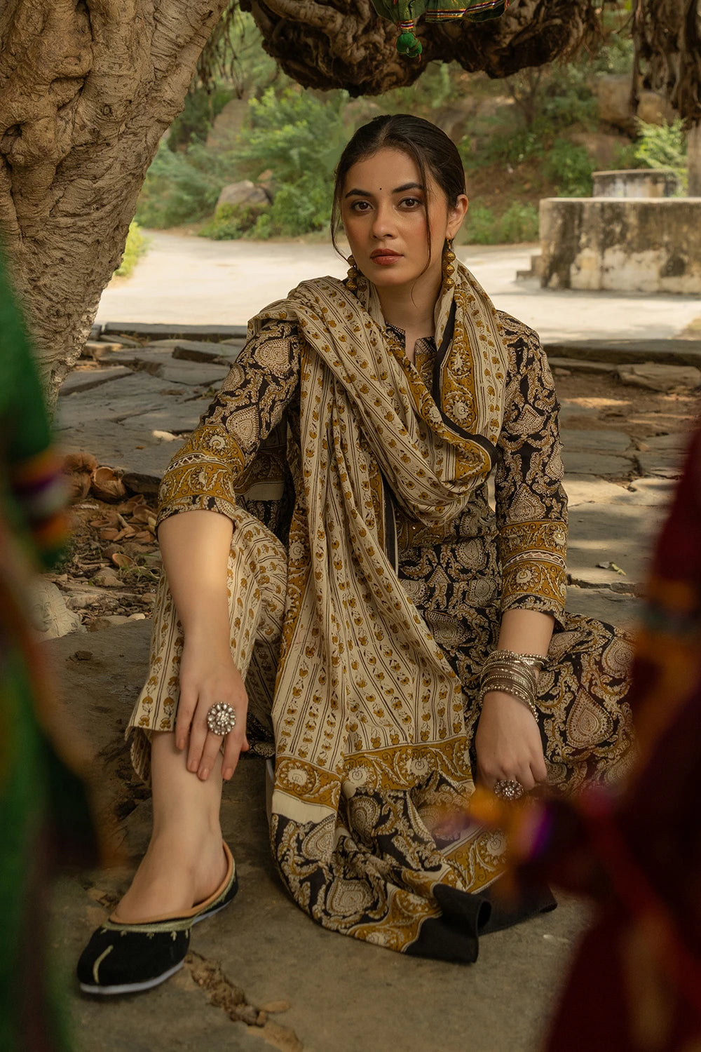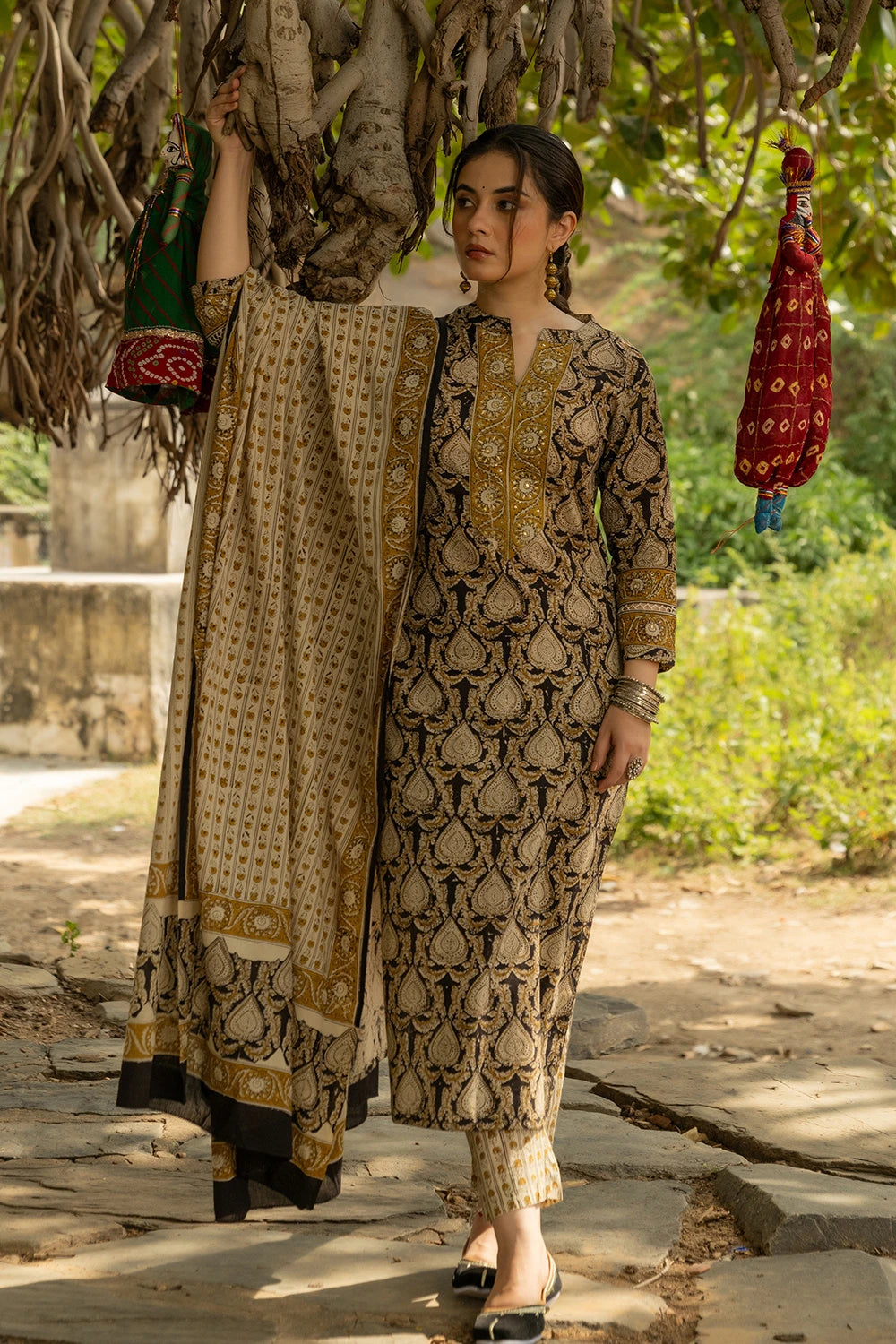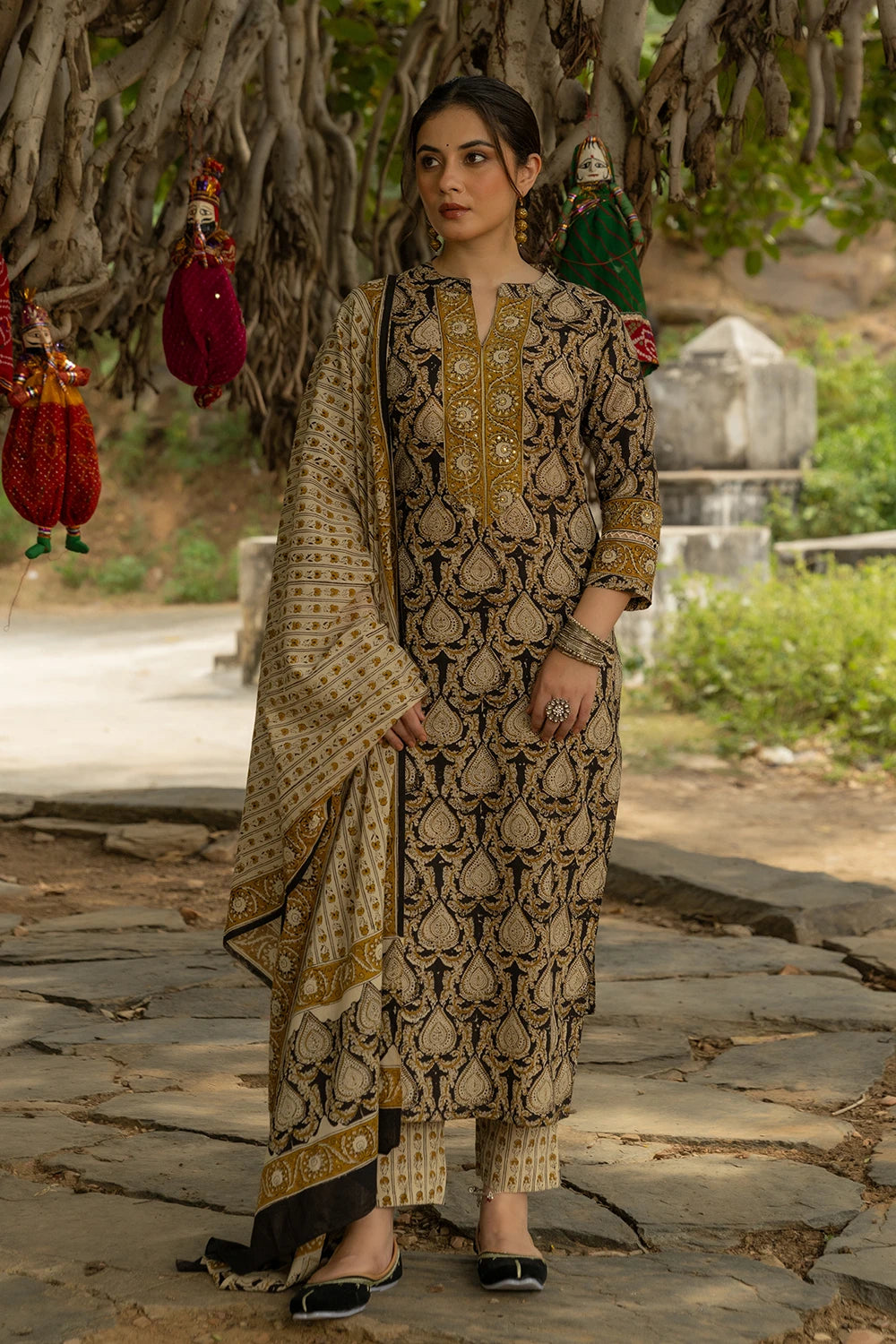 Black & Beige Bagru Print Cotton Adda Work Suit With Matching Bagru Print Malmal Dupatta - Set Of 3