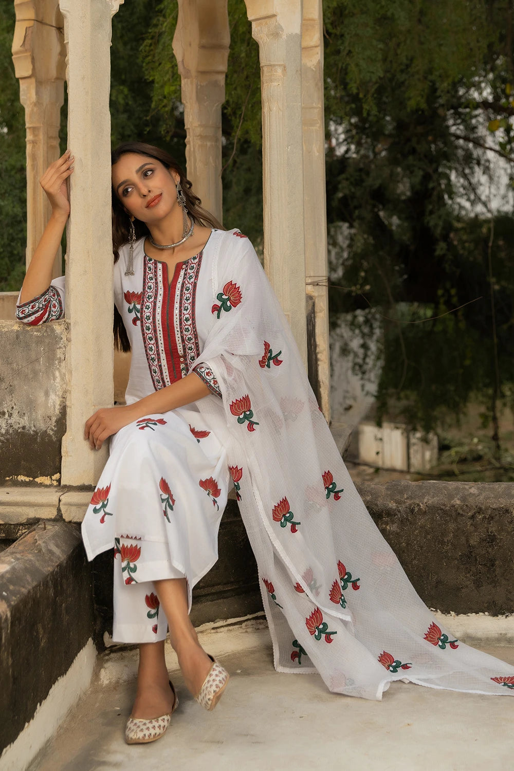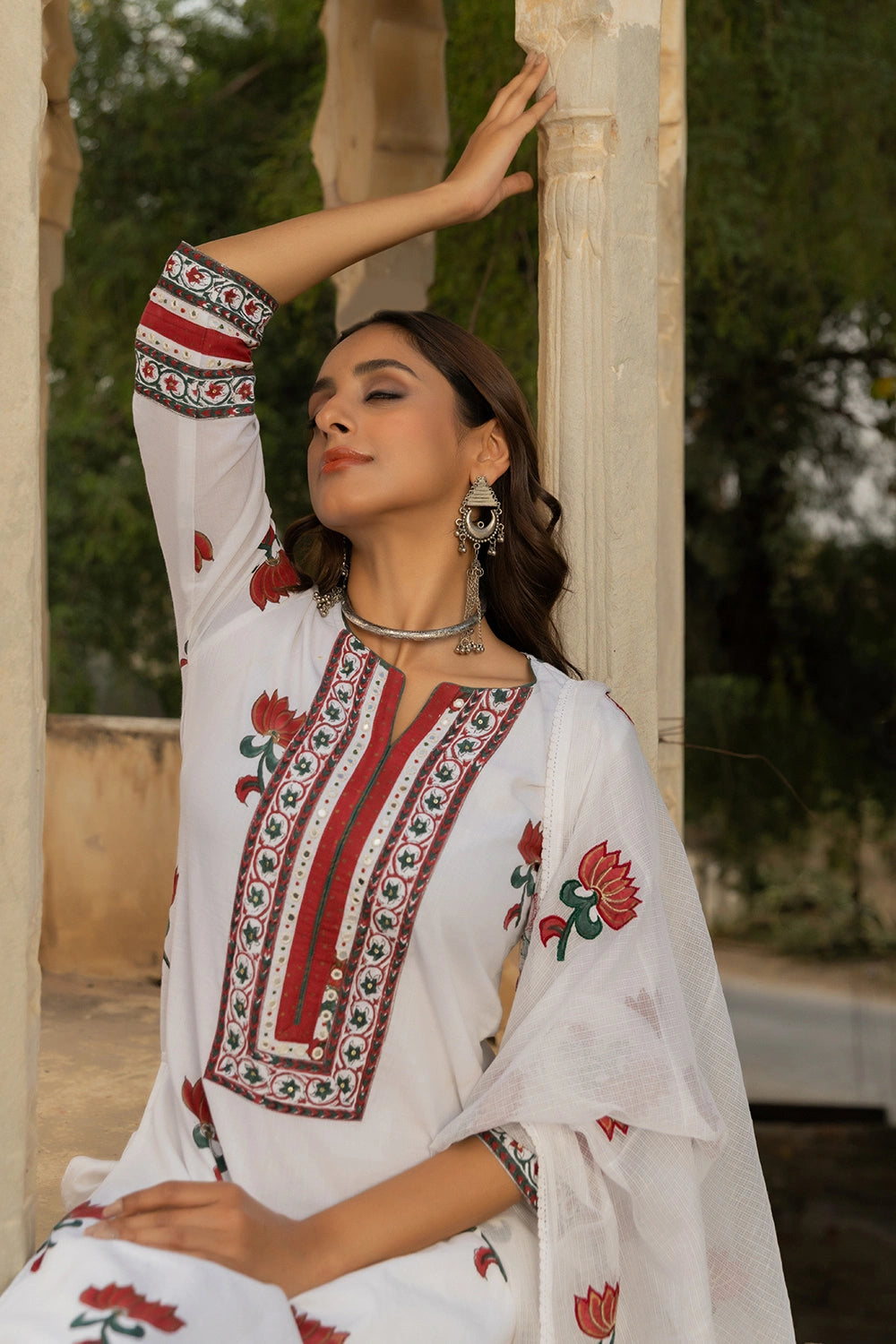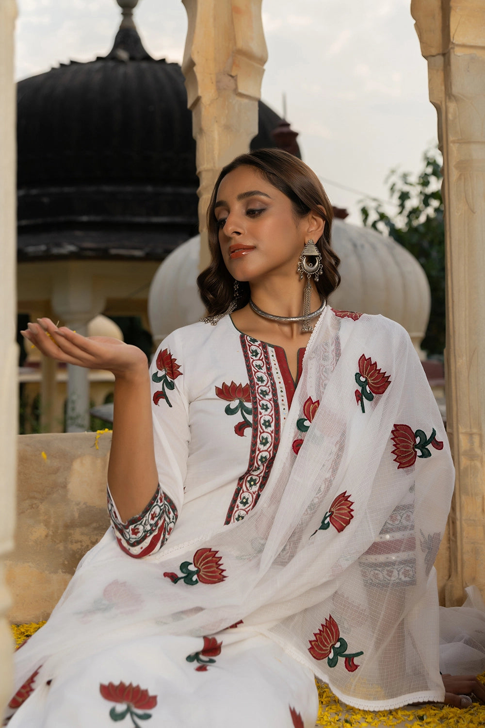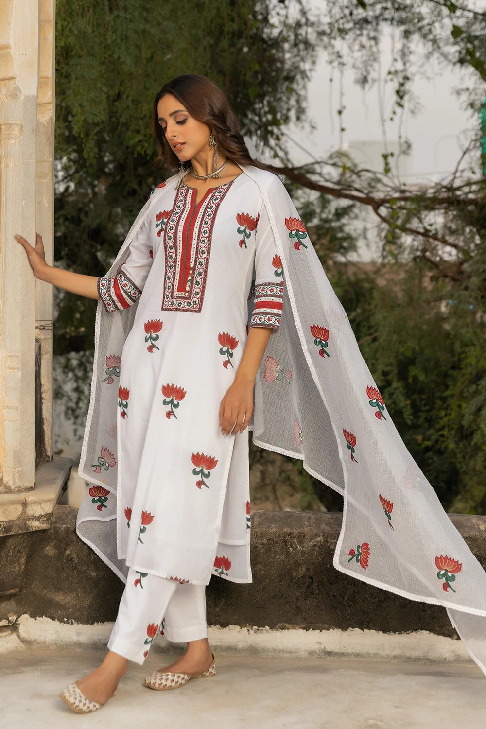 Opel White Cotton Chhappa Prin Suit With Aplique Dupatta - Set Of 3