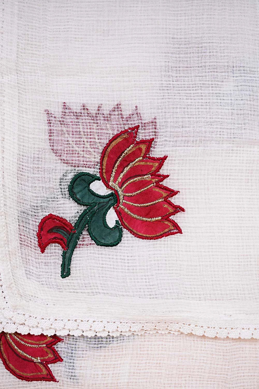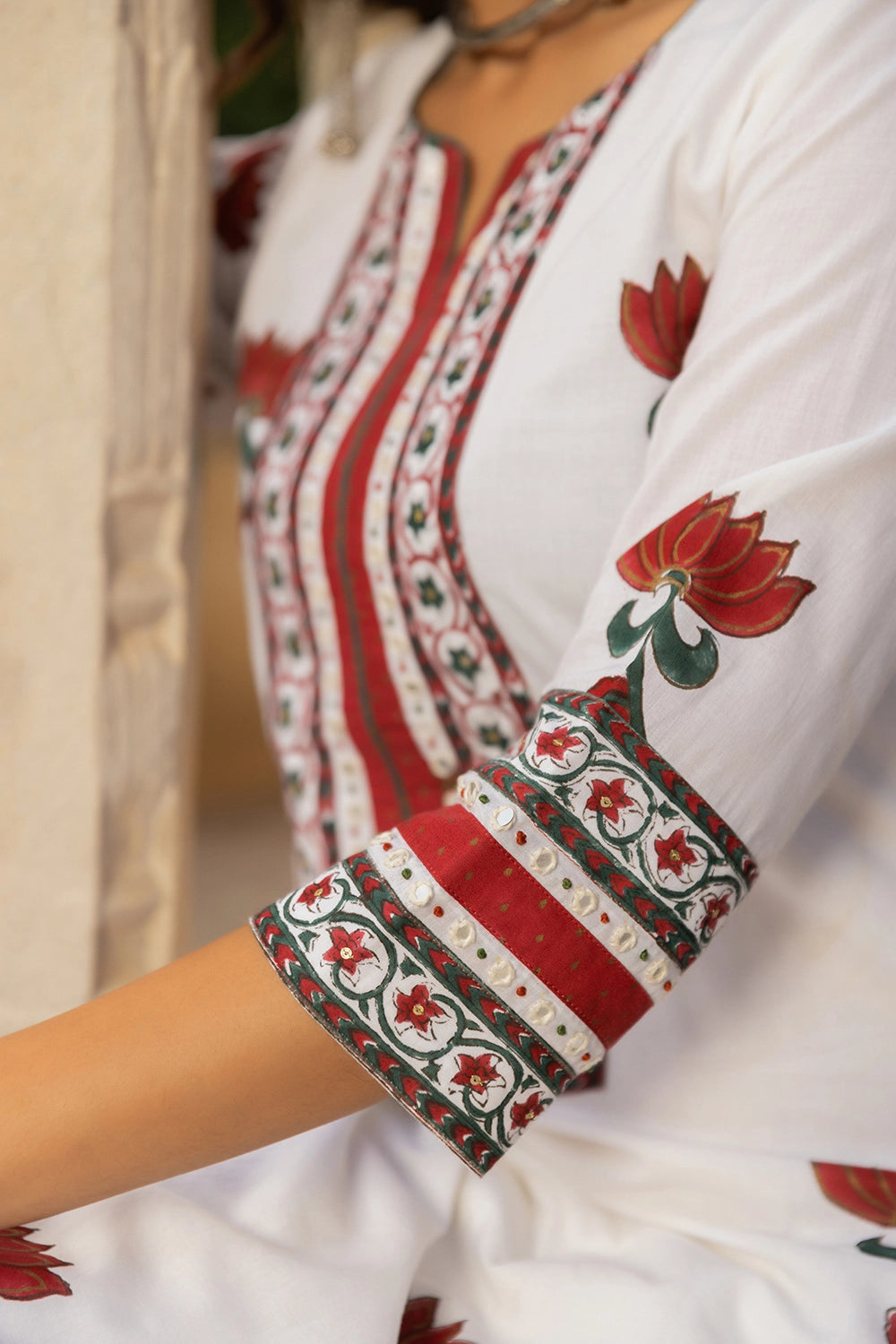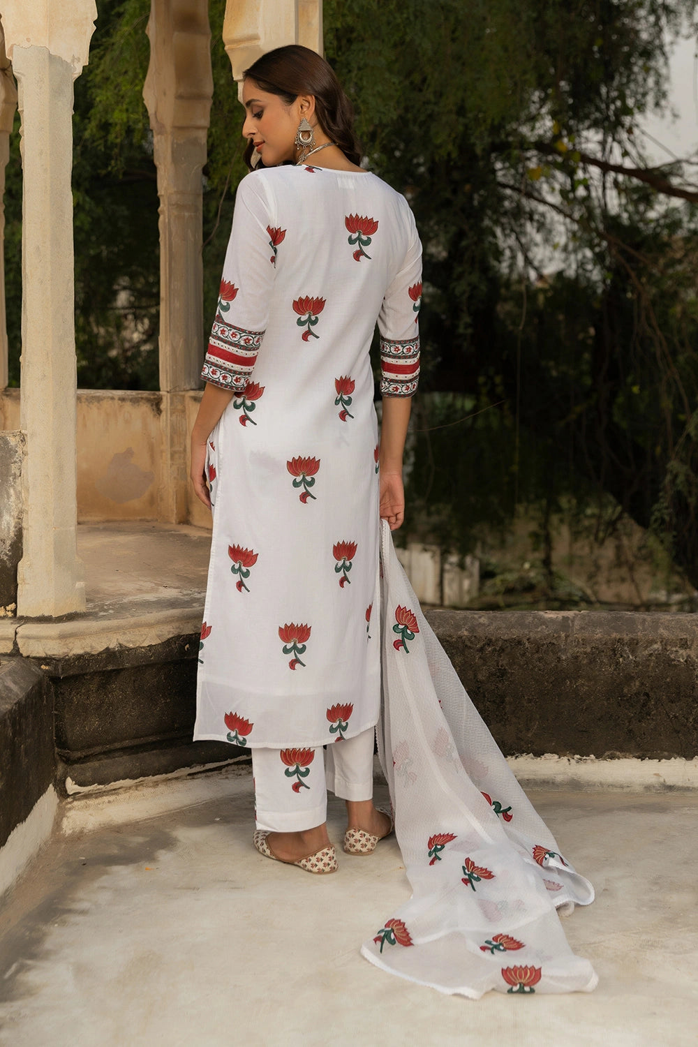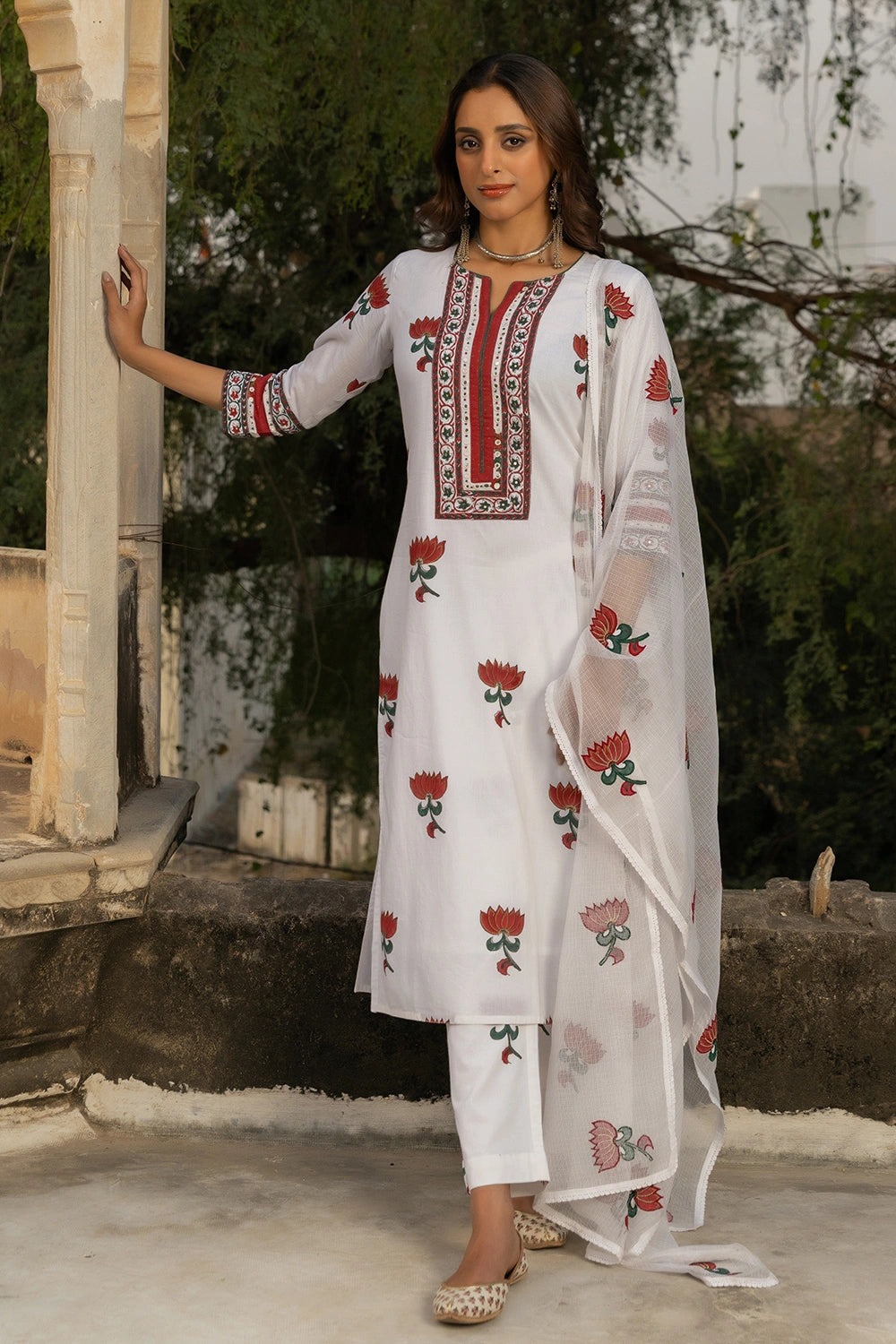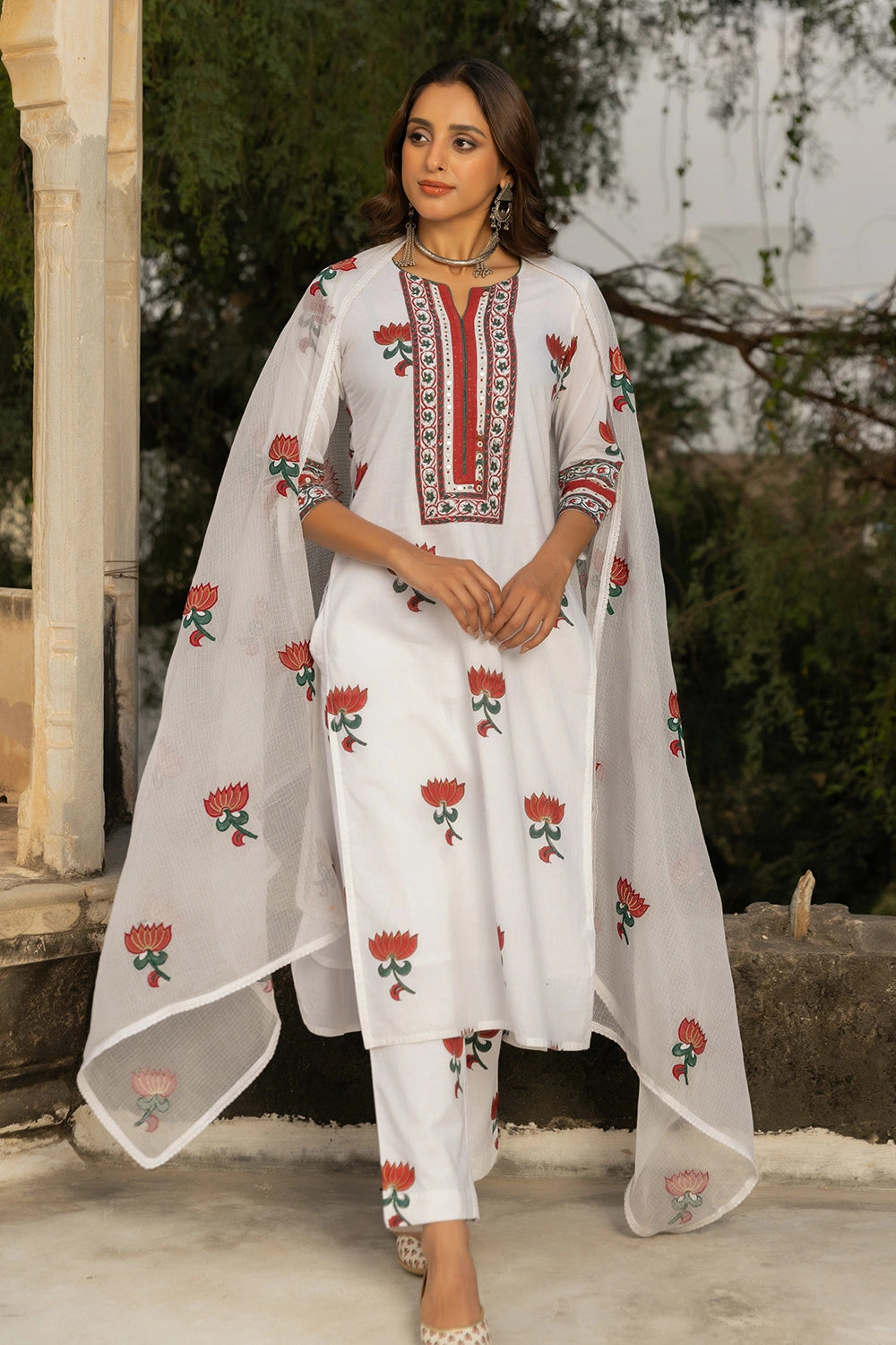 Opel White Cotton Chhappa Prin Suit With Aplique Dupatta - Set Of 3