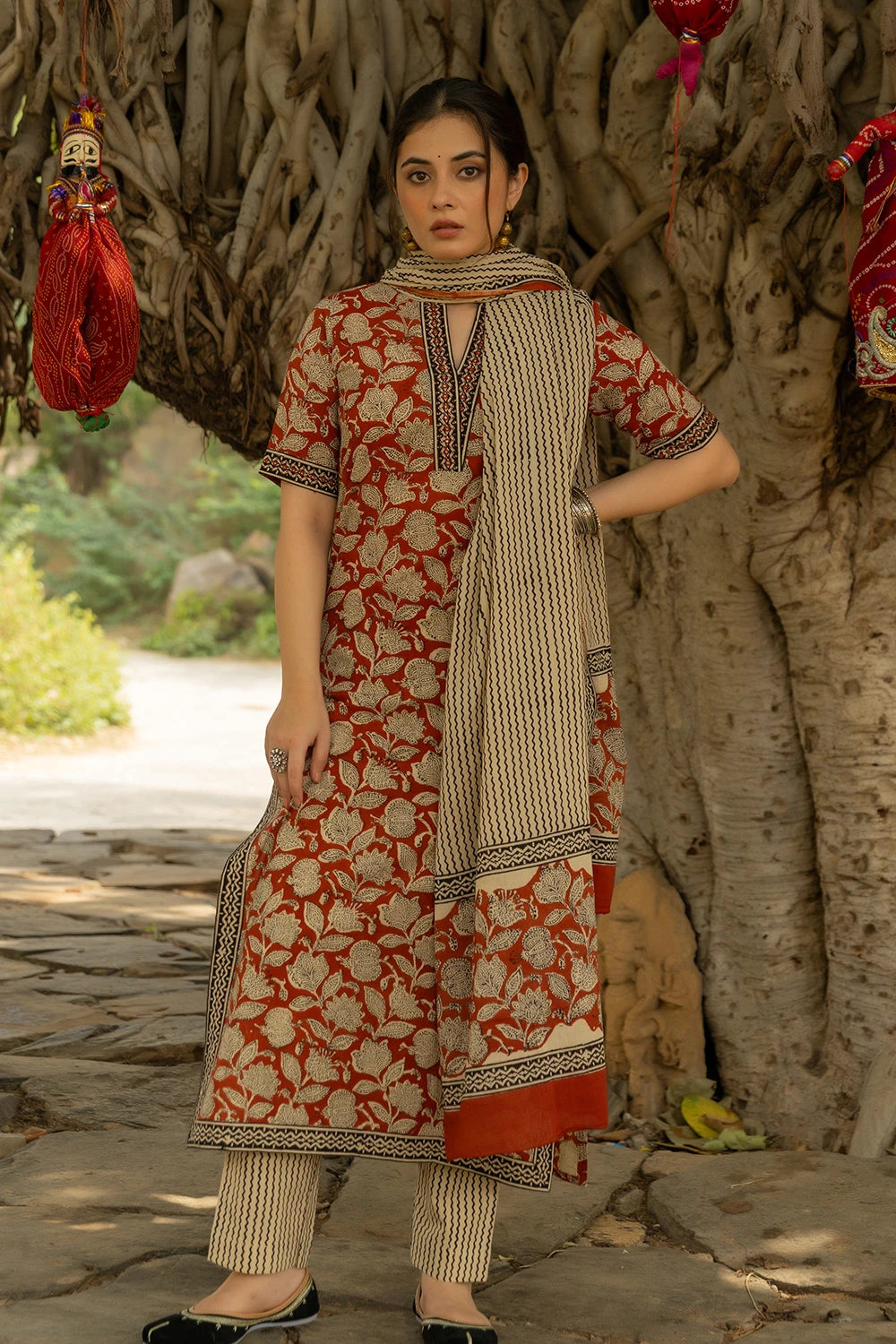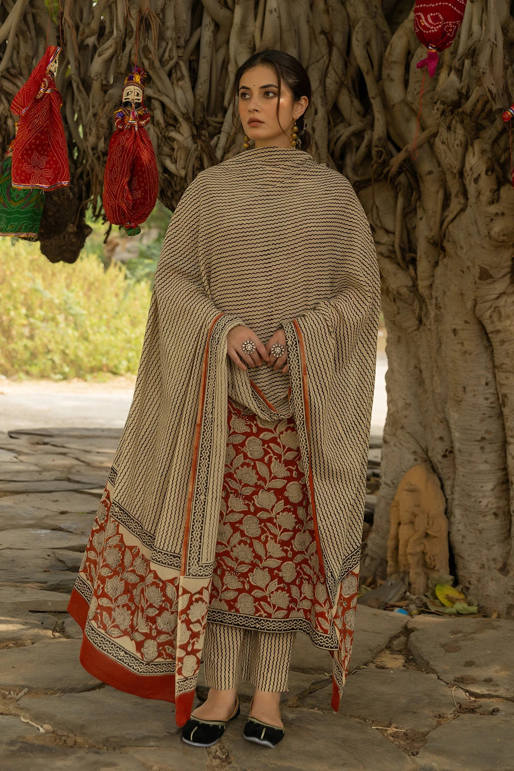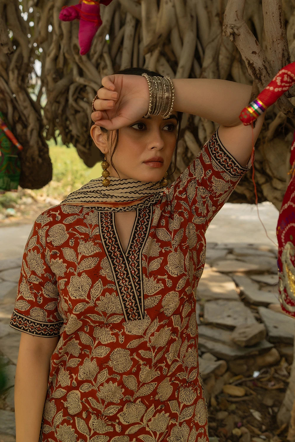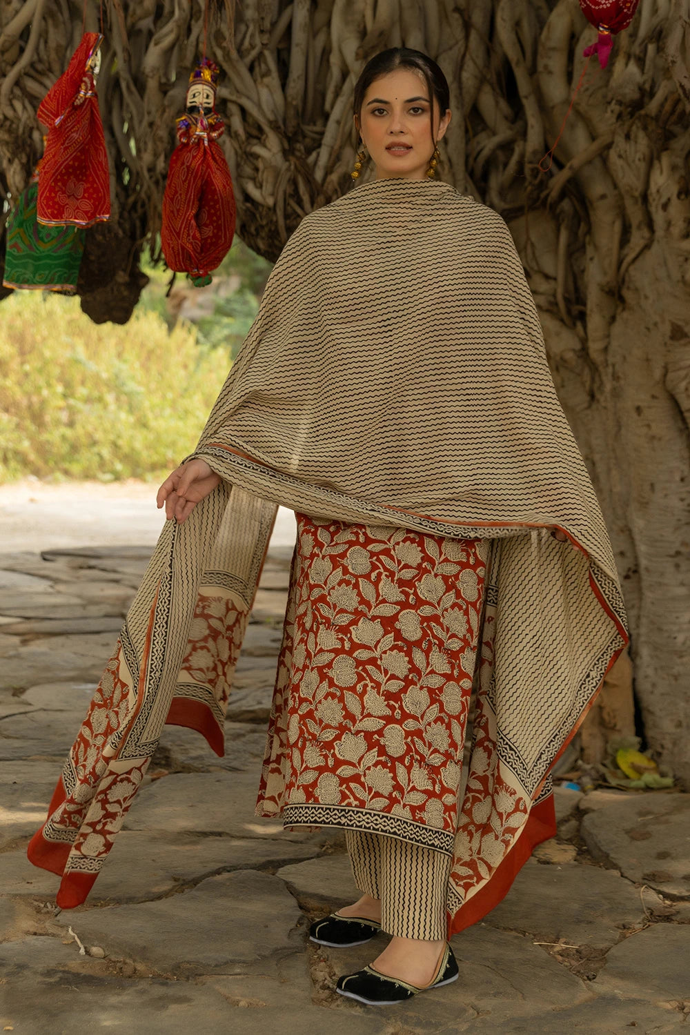 Rust & Beigebagru Print Thread Work Cotton Suti Paired With Matching Dupatta - Set Of 3