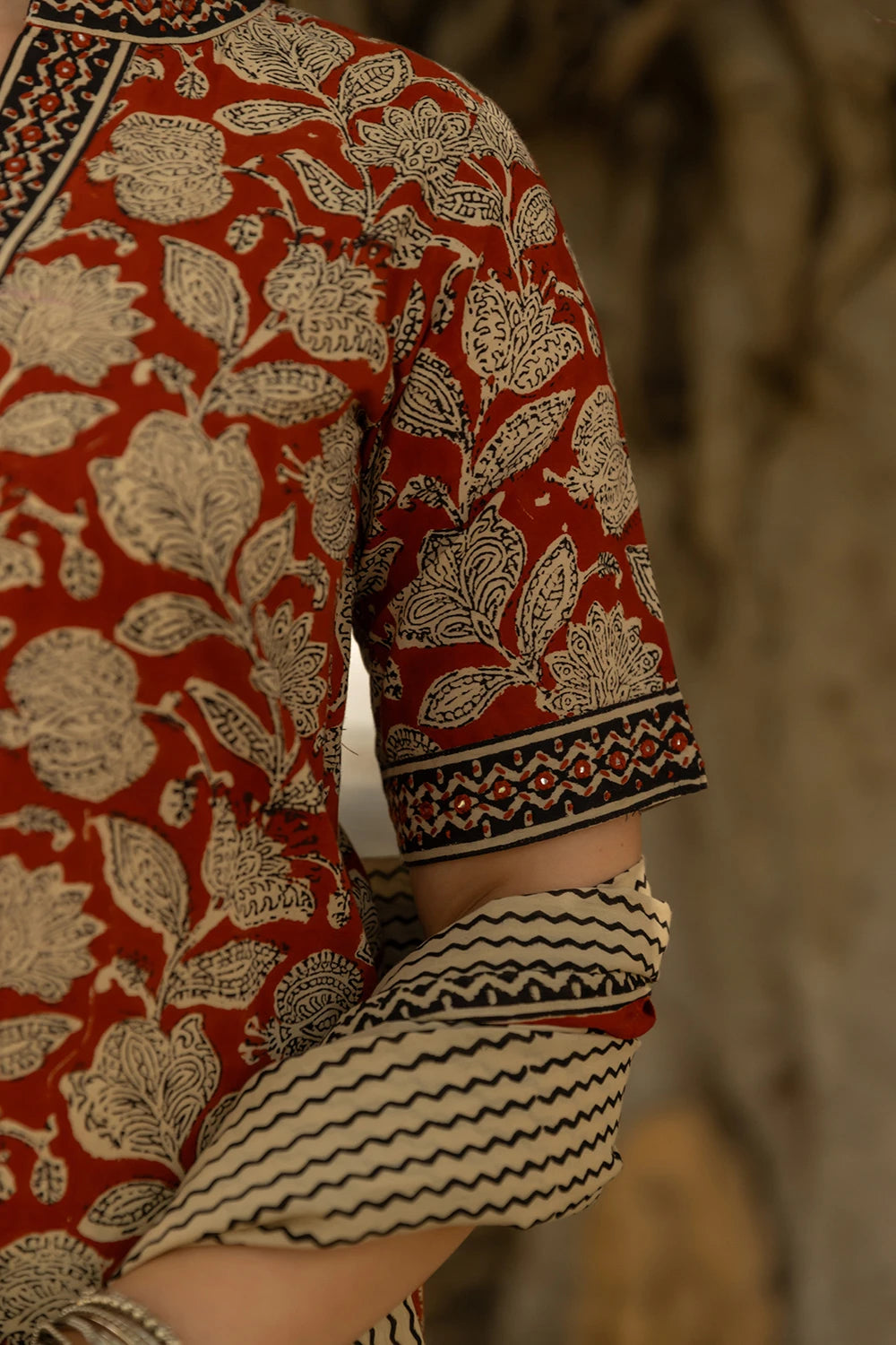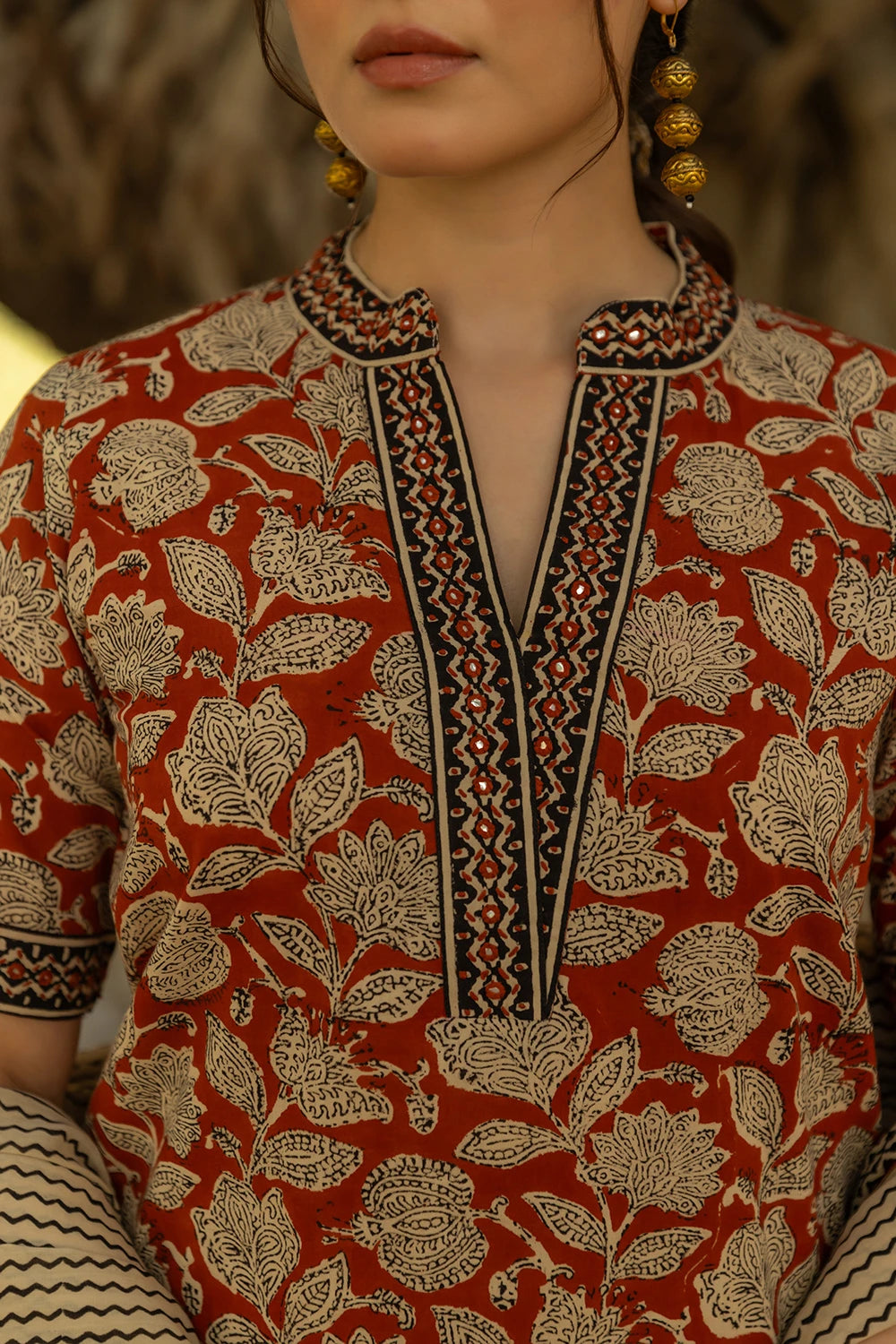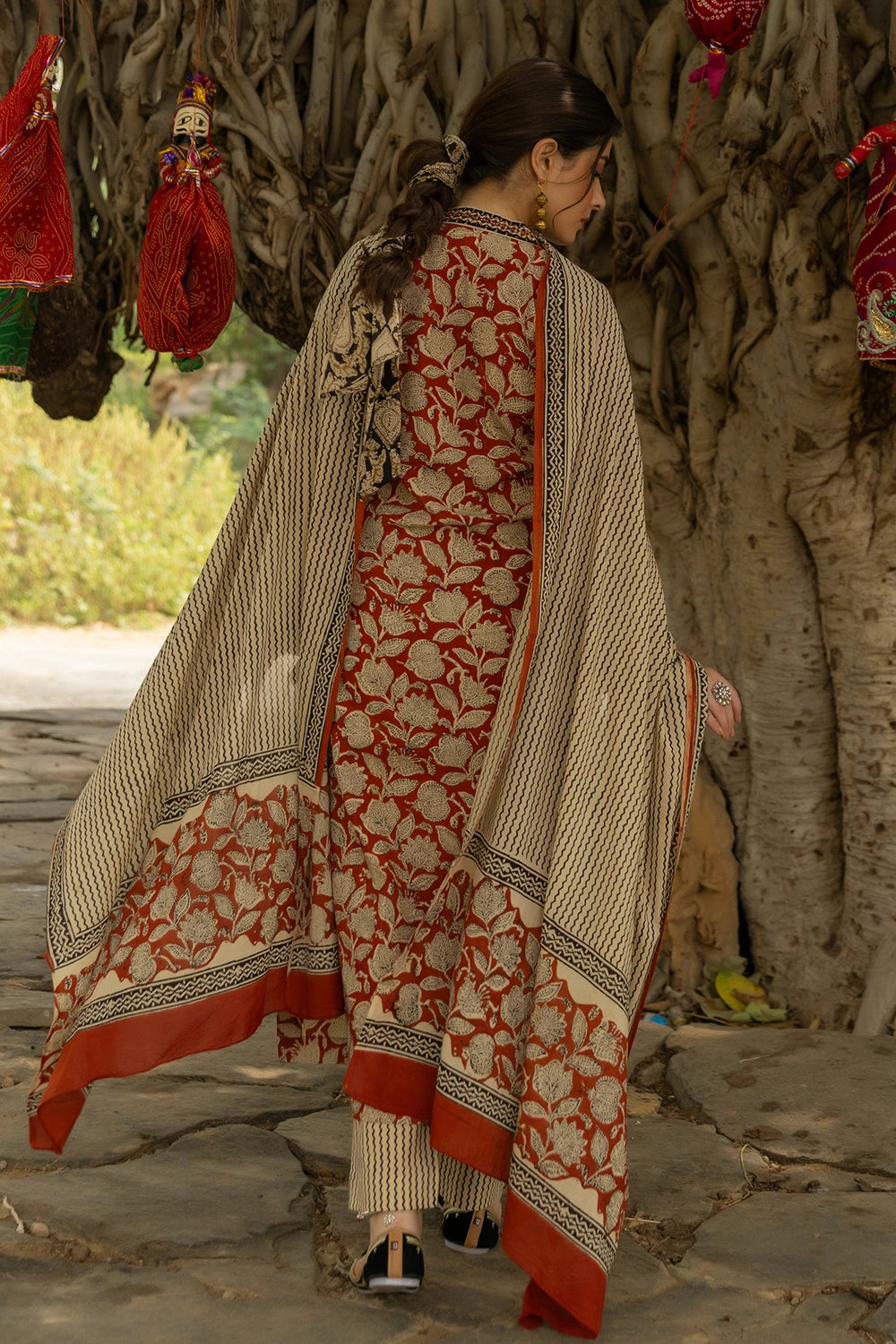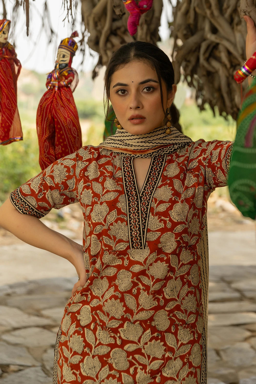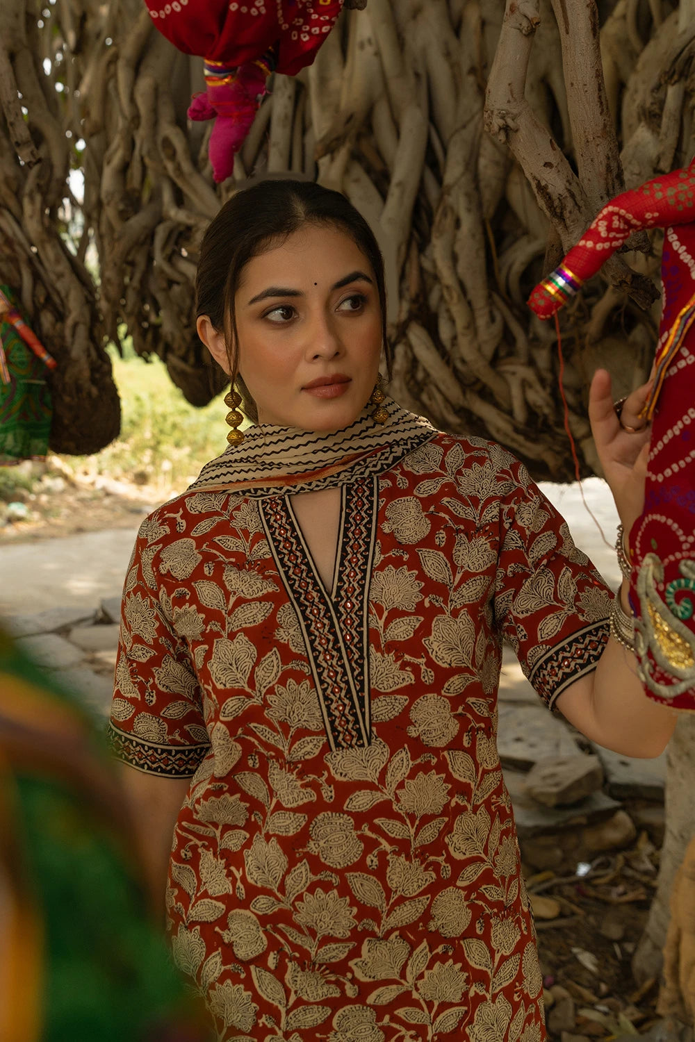 Rust & Beigebagru Print Thread Work Cotton Suti Paired With Matching Dupatta - Set Of 3