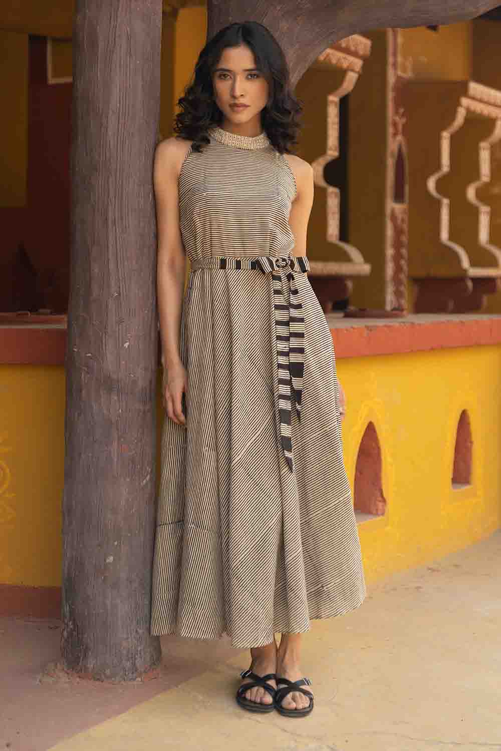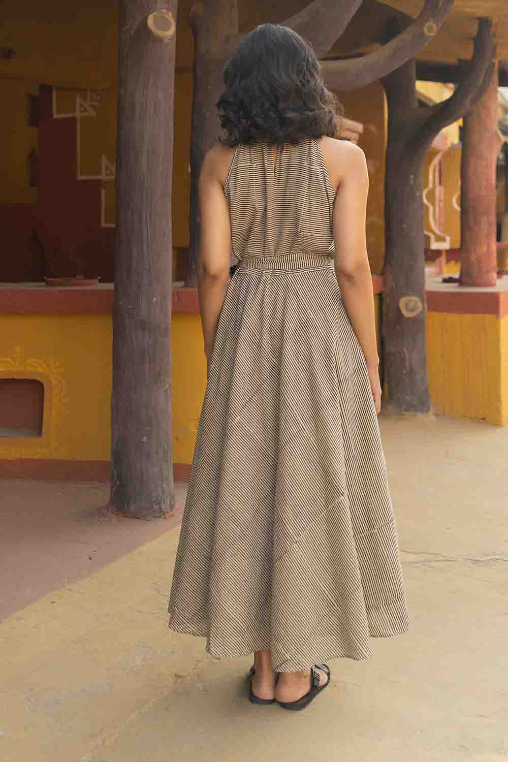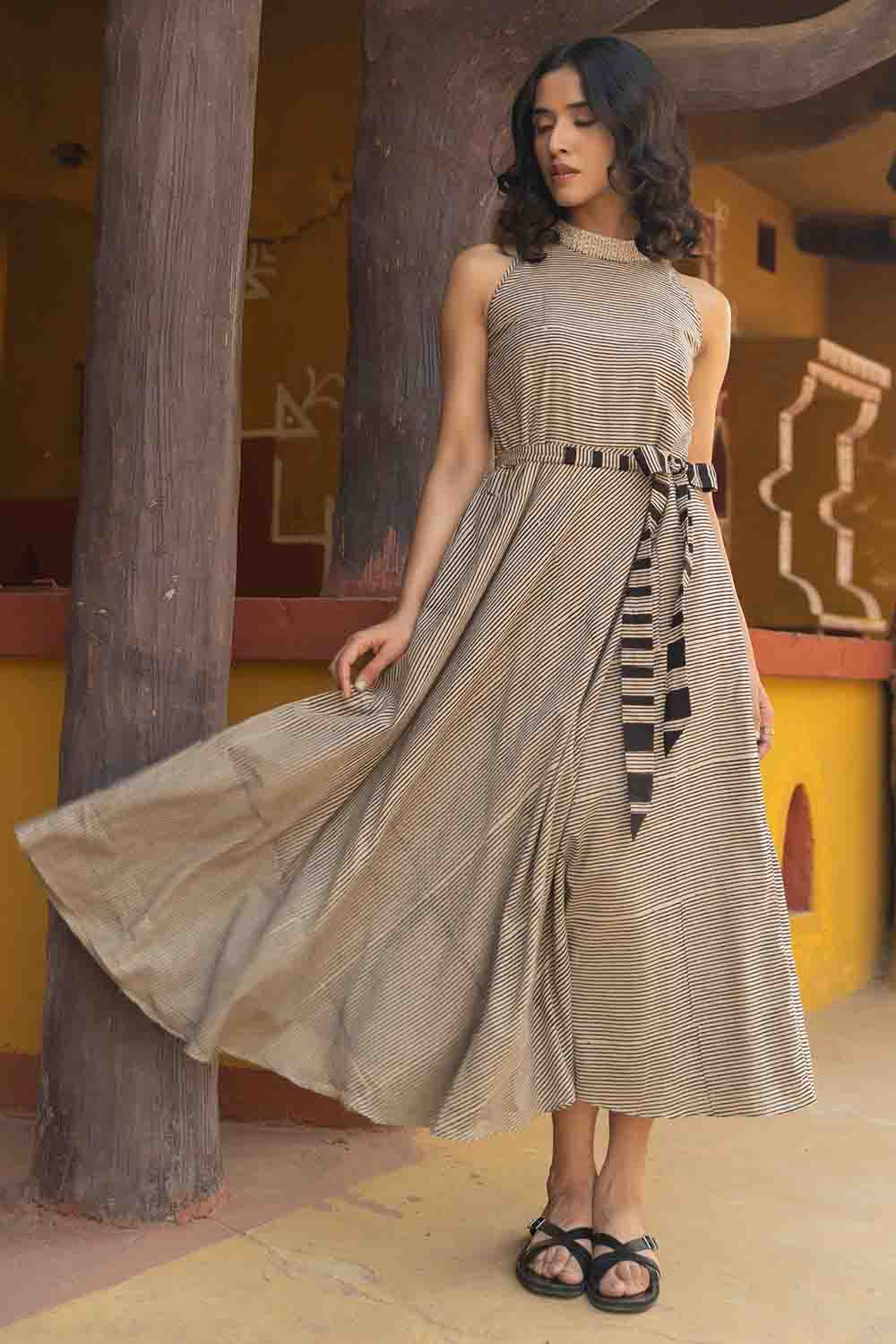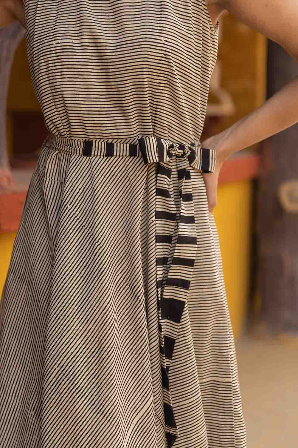 Step Into Timeless Elegance With Our Natural Bagru Stripe Print Flared Dress, Crafted From Pure Cotton And Dyed Using Traditional Natural Techniques. This Dress Features Exquisite Hand Work Detailing On The Neckline And Sleeves, Adding A Touch Of Artisanal Charm. The Soft Flared Silhouette Offers Comfort And Grace, Making It Perfect For Both Everyday Wear And Special Occasions. Ethically Made And Rooted In Heritage, This Piece Celebrates The Beauty Of Slow Fashion And Indian Craftsmanship.