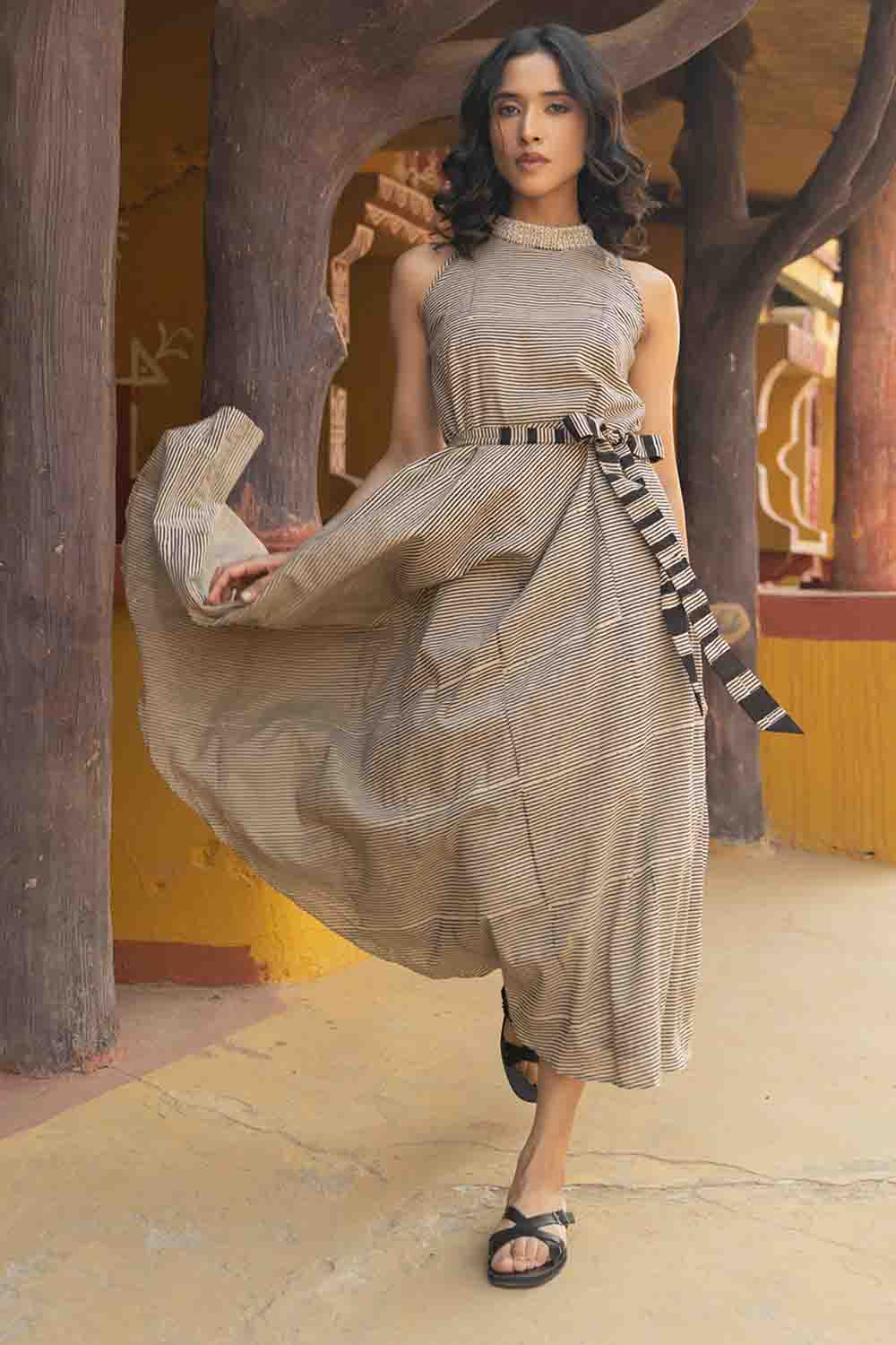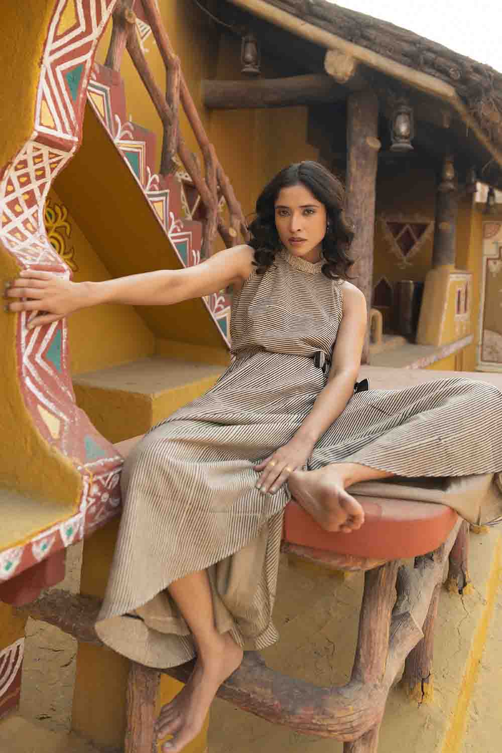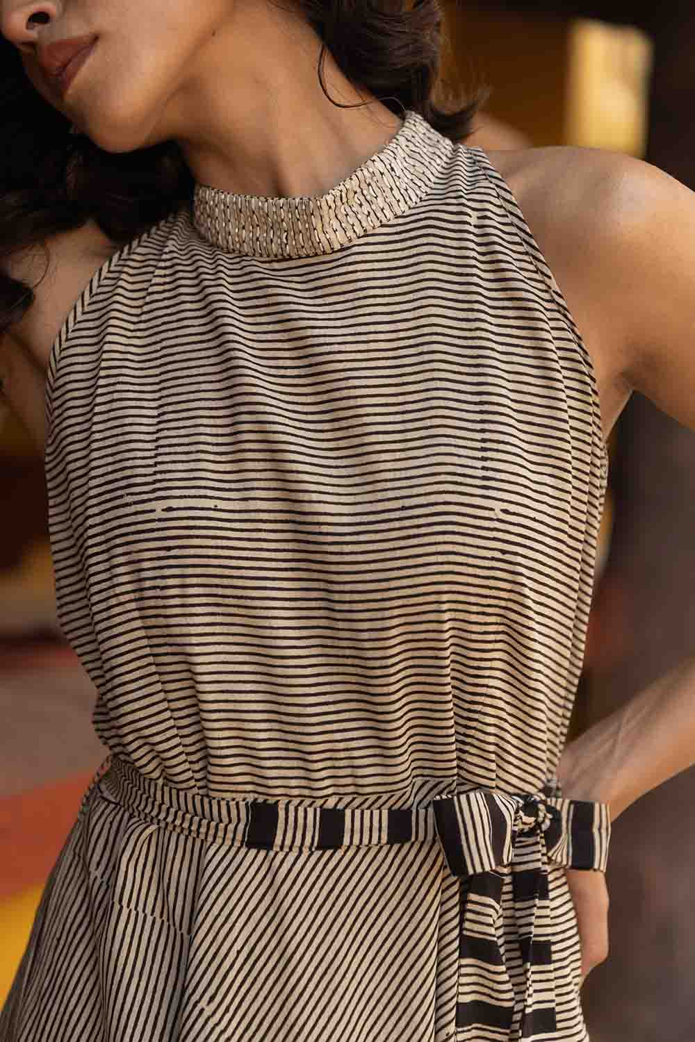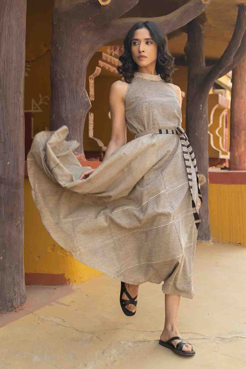 Step Into Timeless Elegance With Our Natural Bagru Stripe Print Flared Dress, Crafted From Pure Cotton And Dyed Using Traditional Natural Techniques. This Dress Features Exquisite Hand Work Detailing On The Neckline And Sleeves, Adding A Touch Of Artisanal Charm. The Soft Flared Silhouette Offers Comfort And Grace, Making It Perfect For Both Everyday Wear And Special Occasions. Ethically Made And Rooted In Heritage, This Piece Celebrates The Beauty Of Slow Fashion And Indian Craftsmanship.