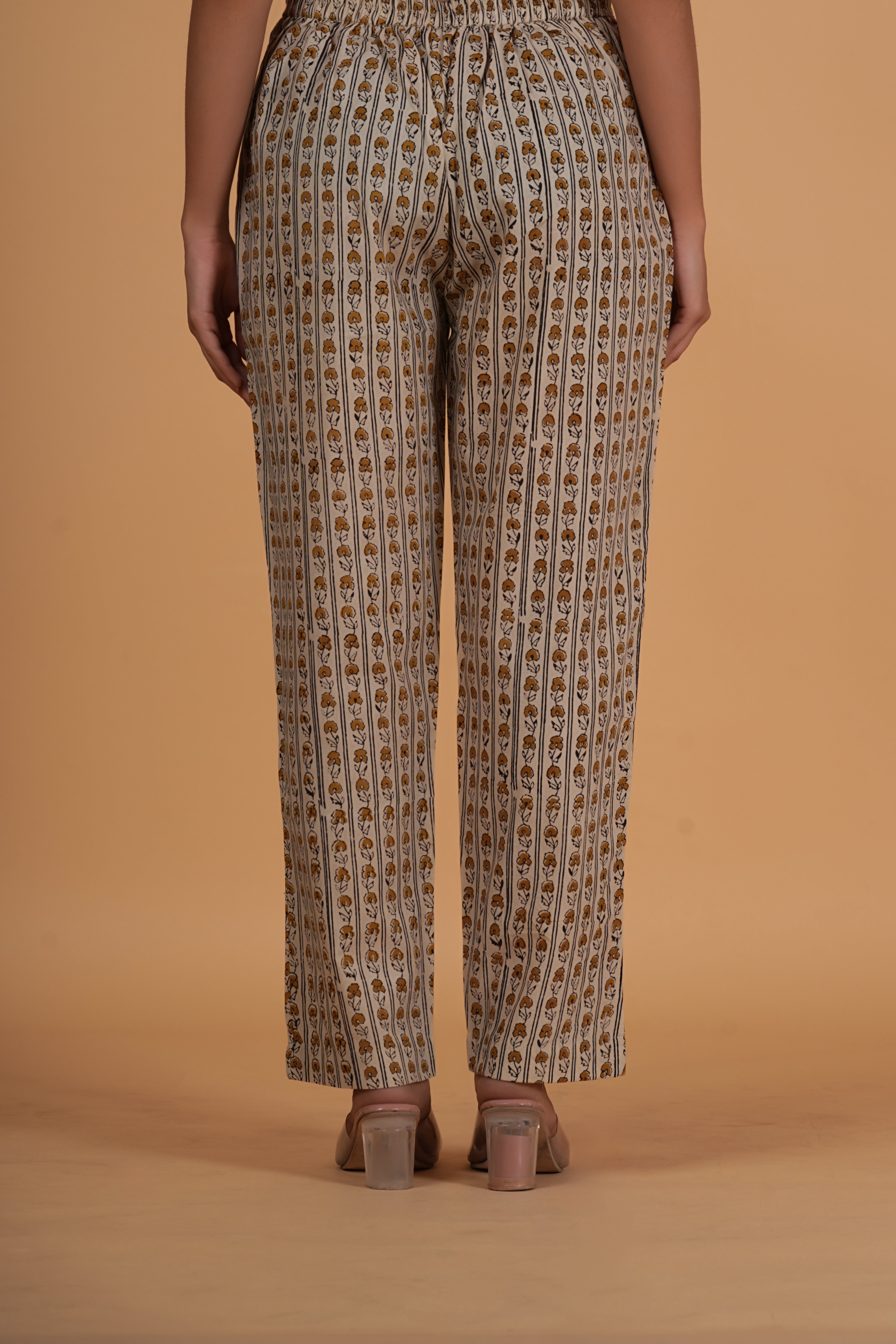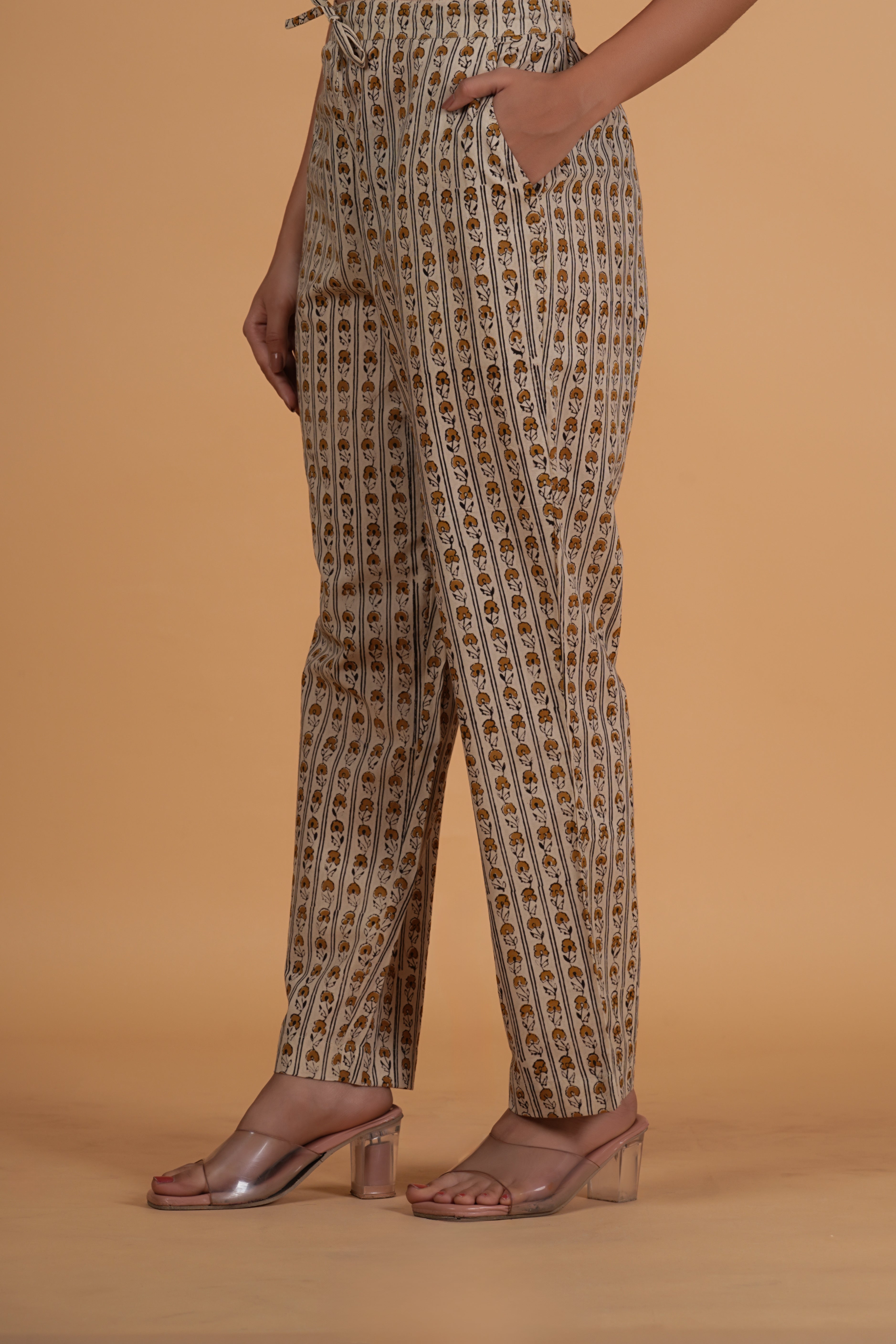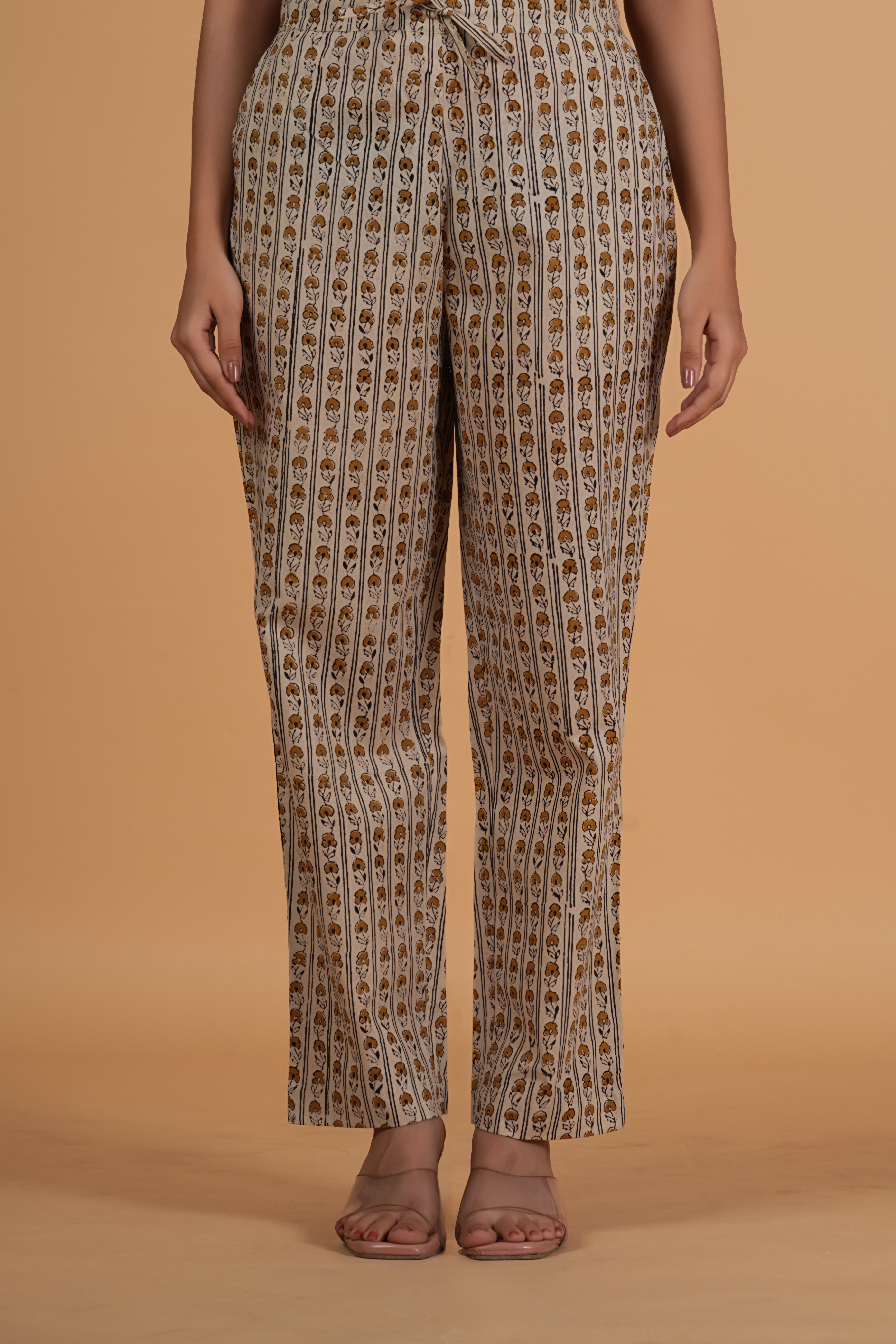BOTTOM- These straight fit Bagru print cotton pants feature two side pockets and a semi-elasticated waistband with drawstring for adjustable comfort. fabric- cotton colour- natural bagru earthy tone