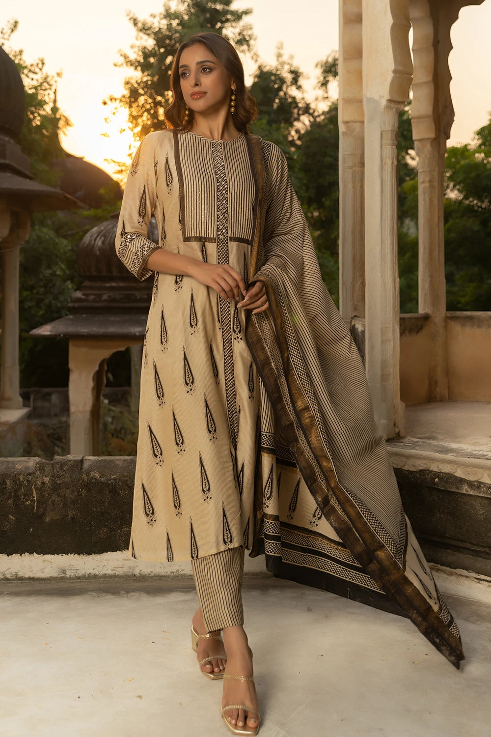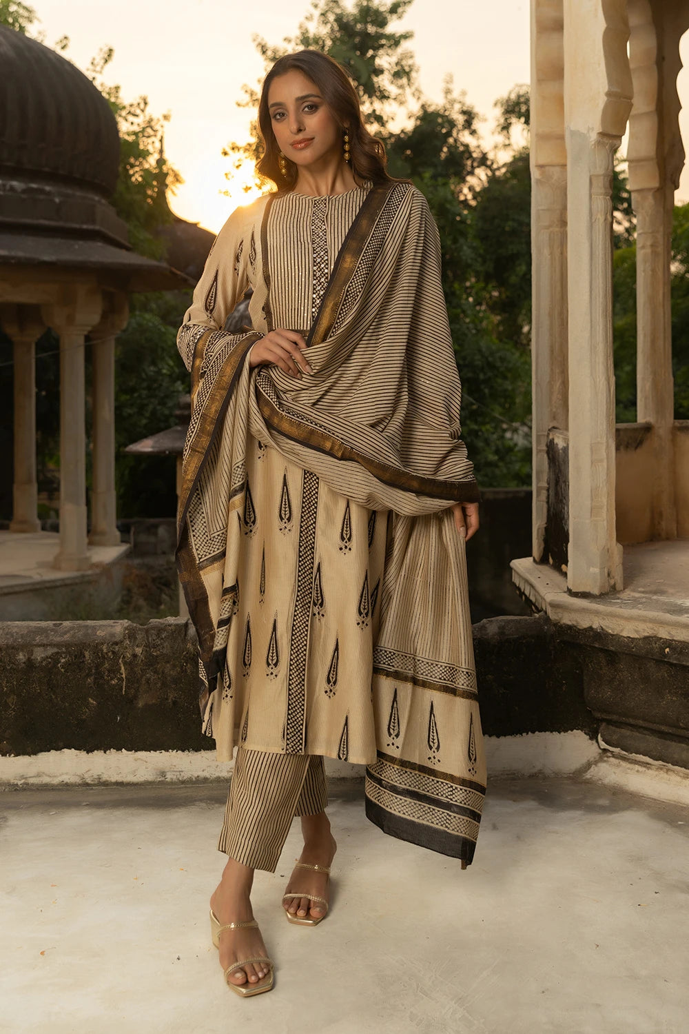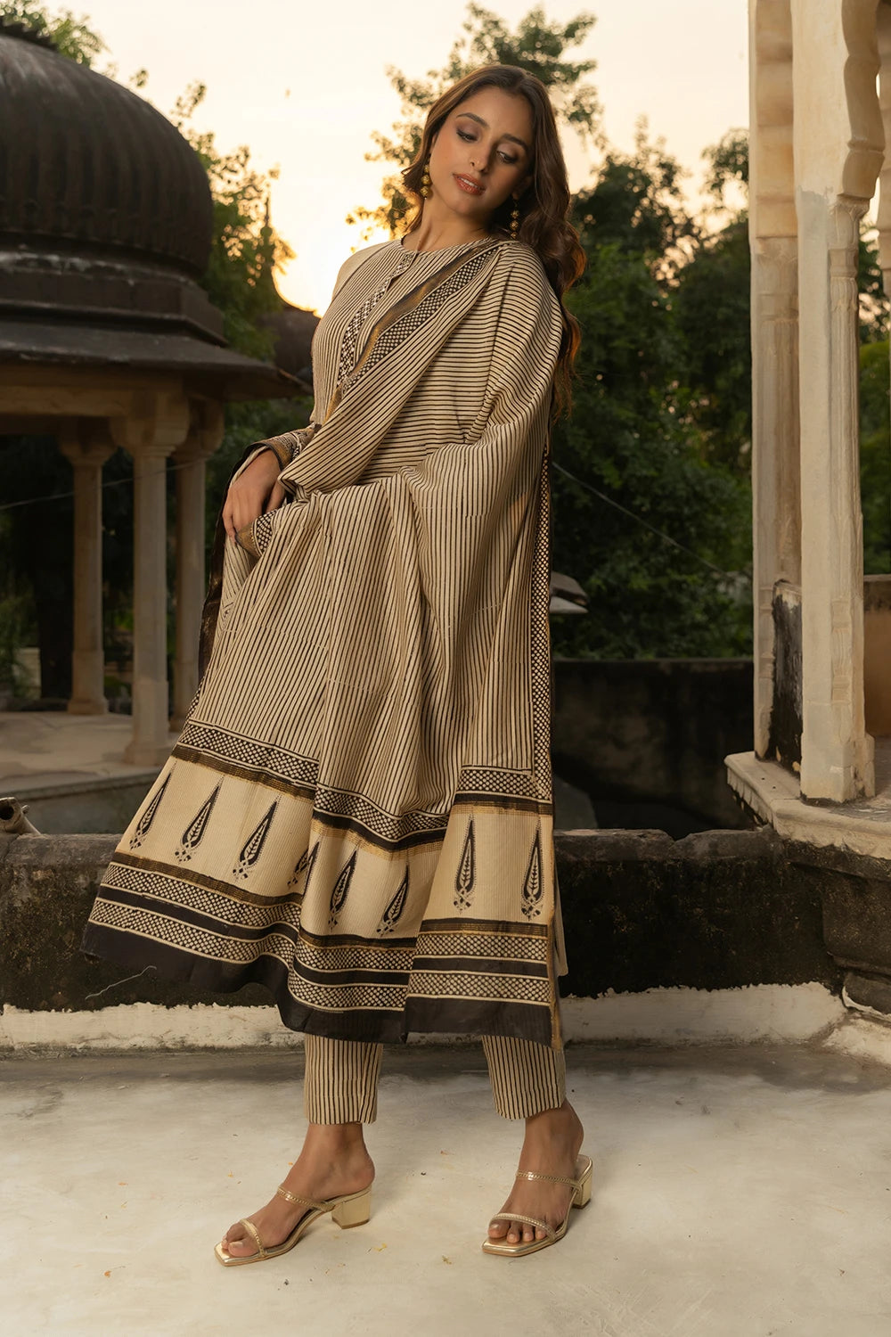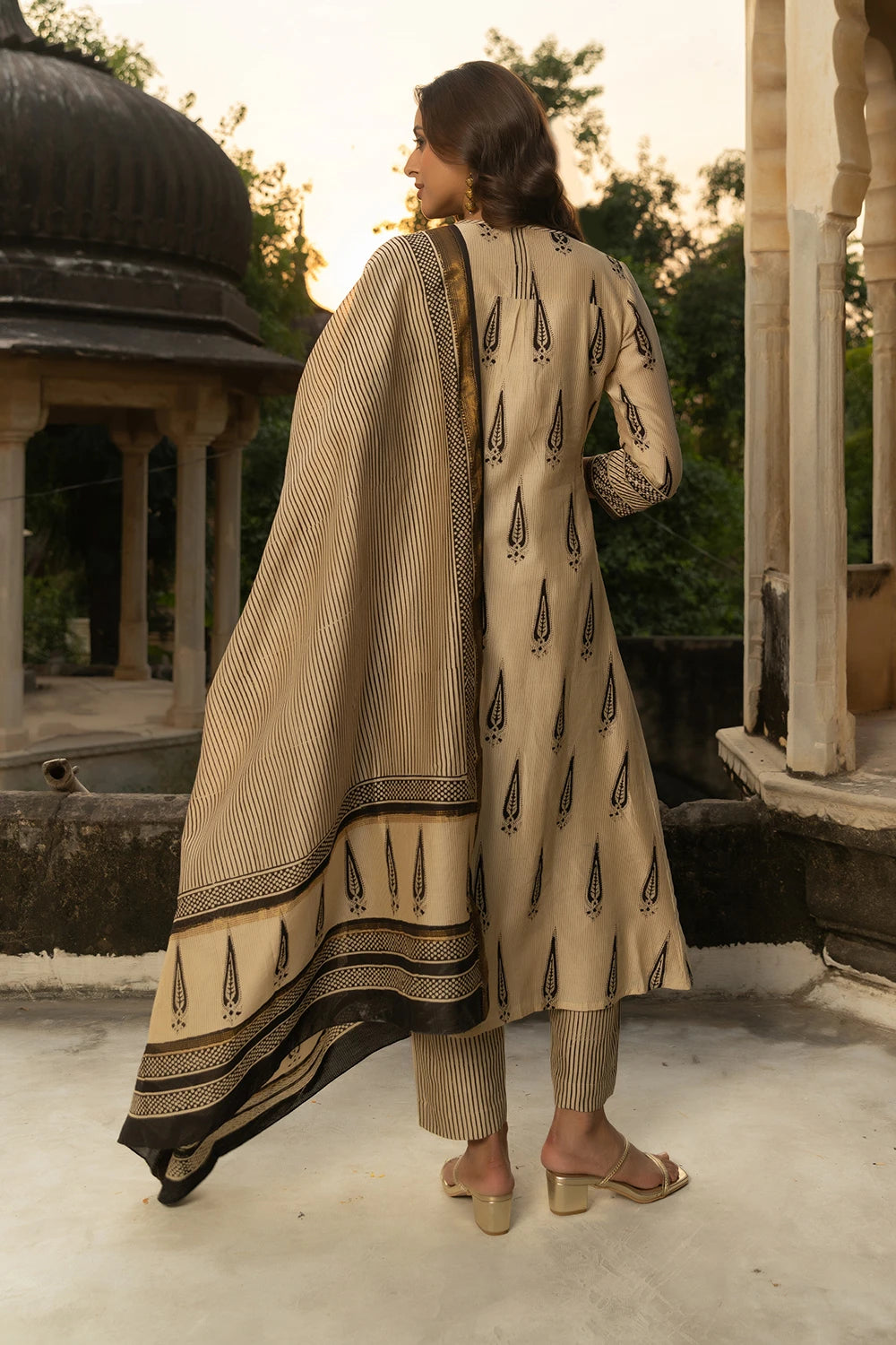 Black & Beige Maheshwari Silk Bagru Print Adda Work Suit - 3 Piece Set