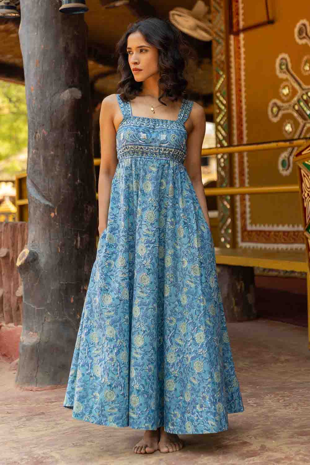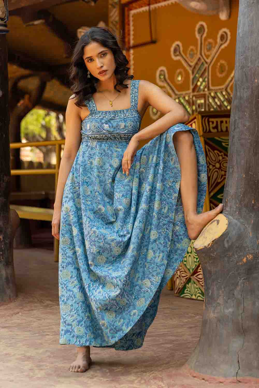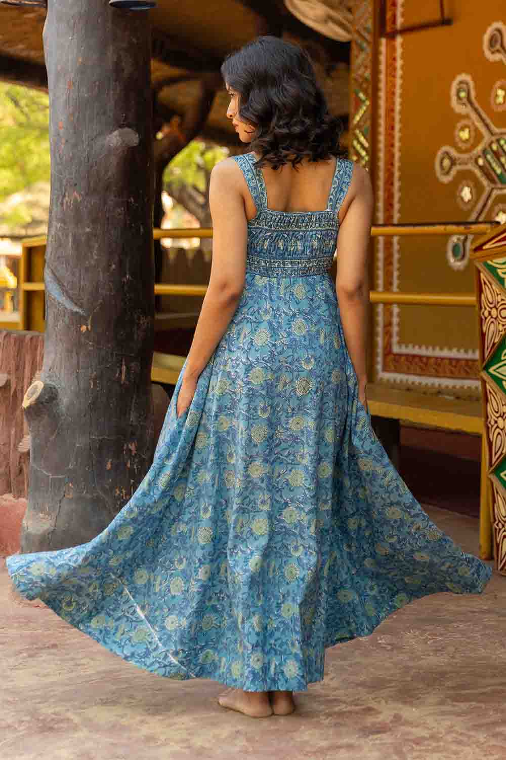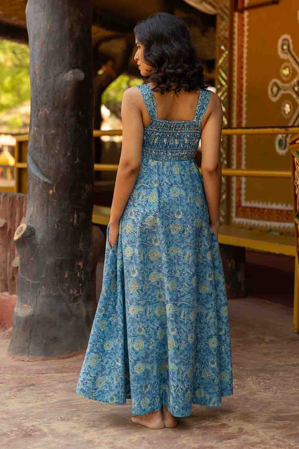 Blue Hand Block Cotton Dress – Full Flair & Timeless Craft