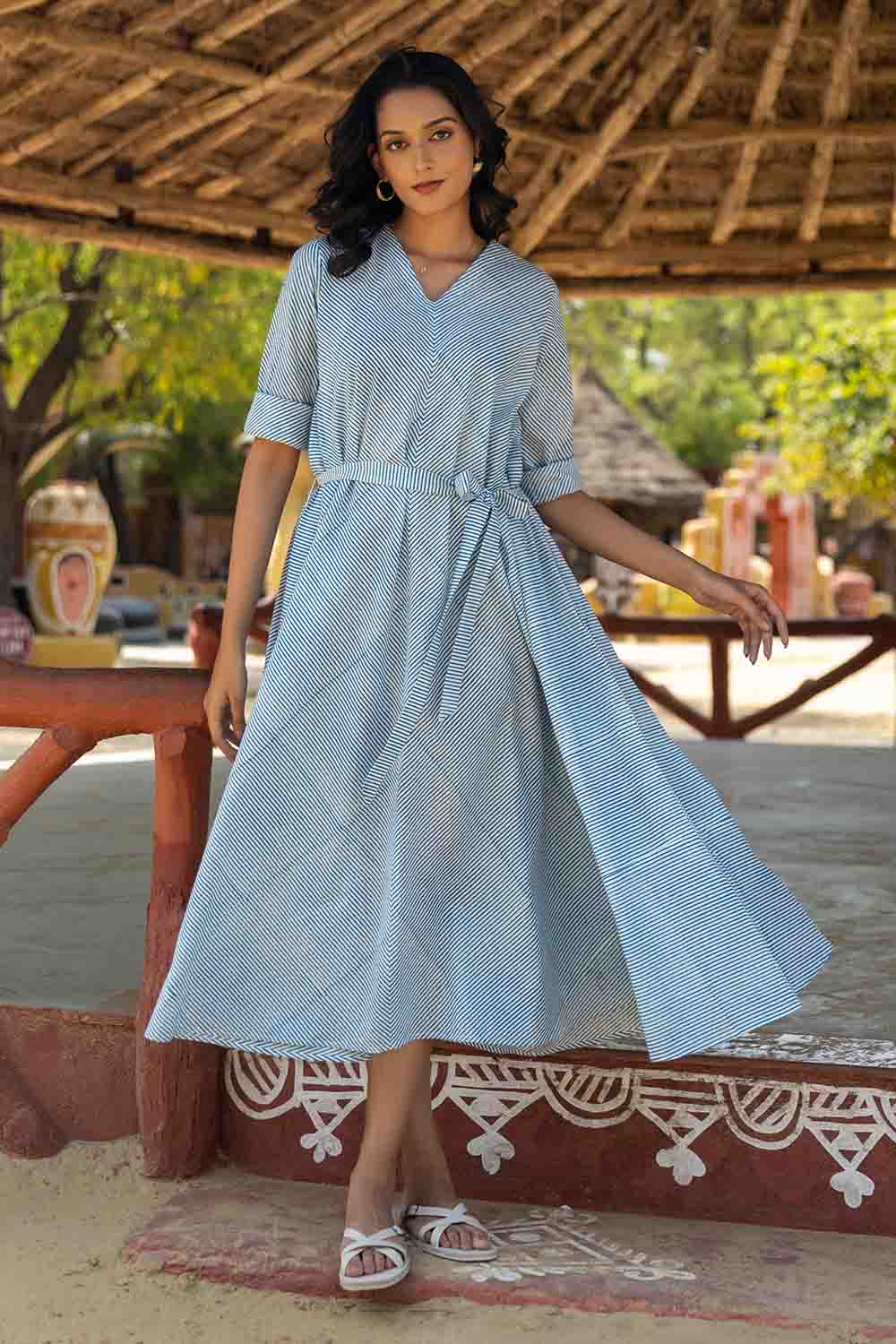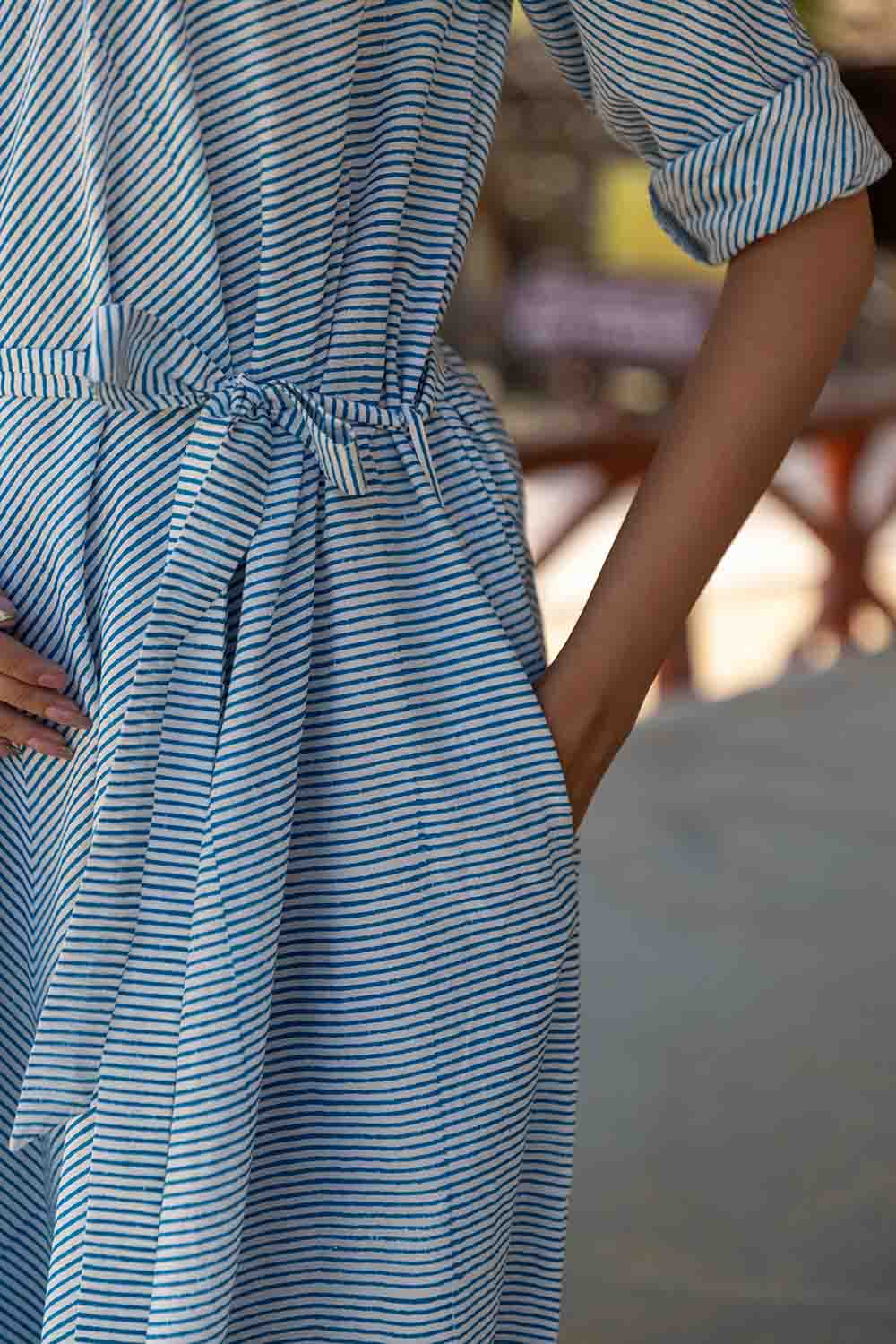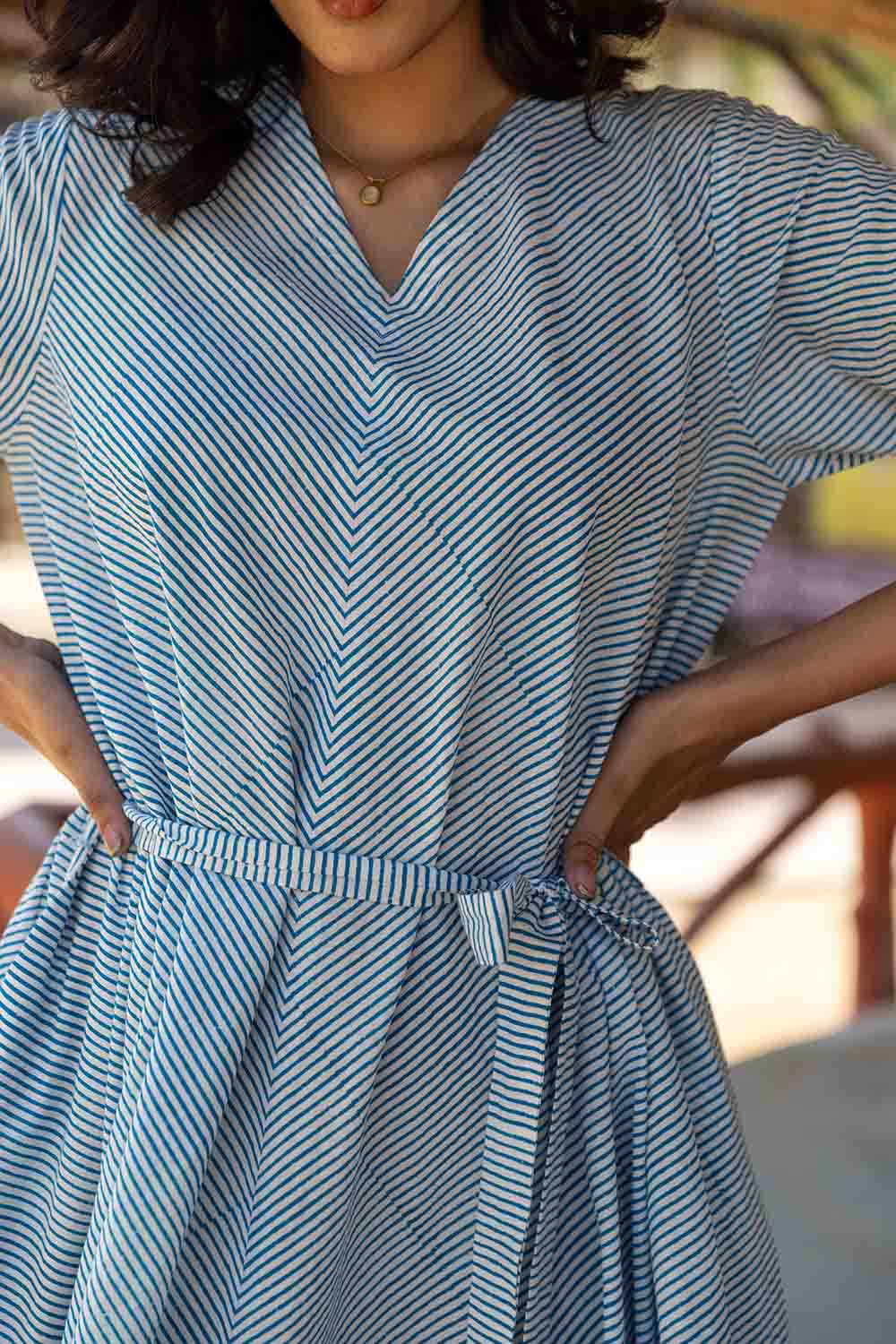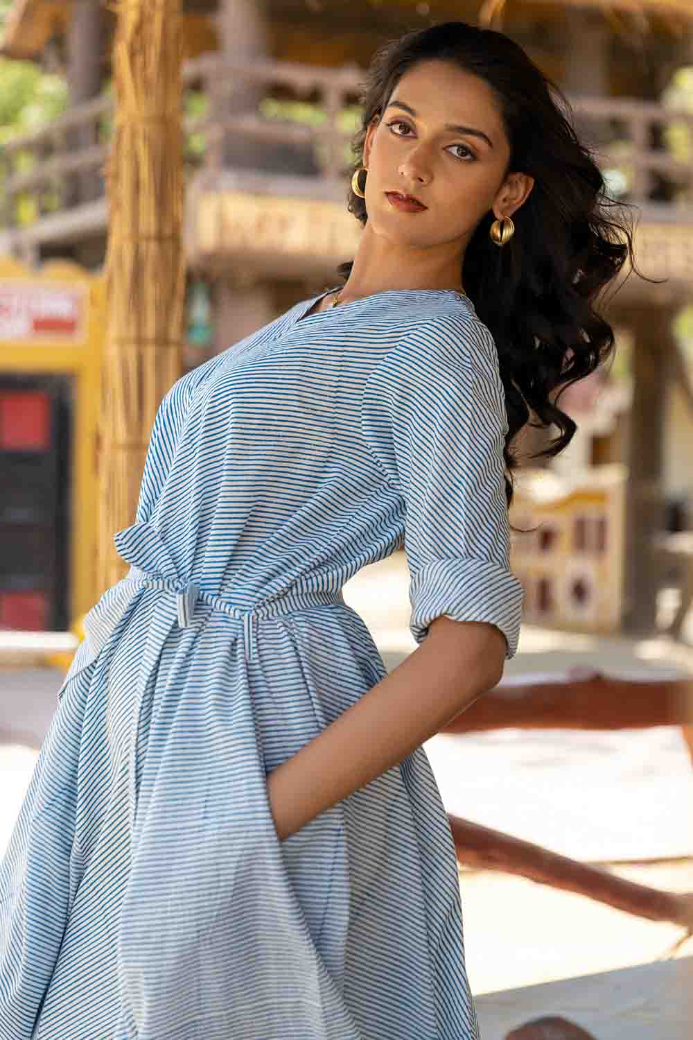 Blue & White Hand Block Flared Dress – Striped, Flowing & Elegant
