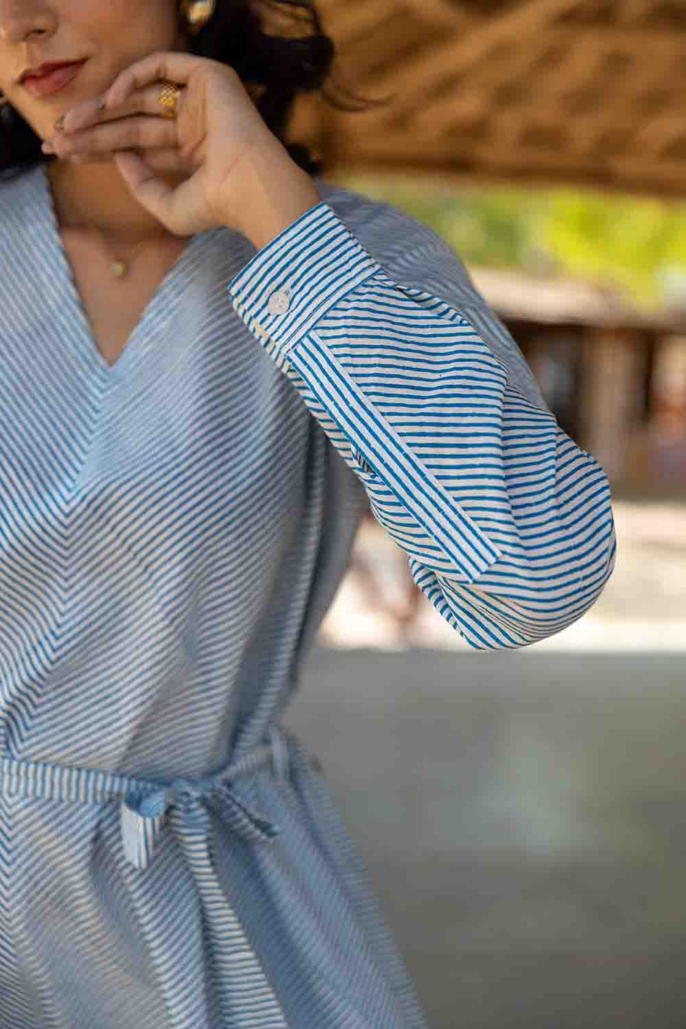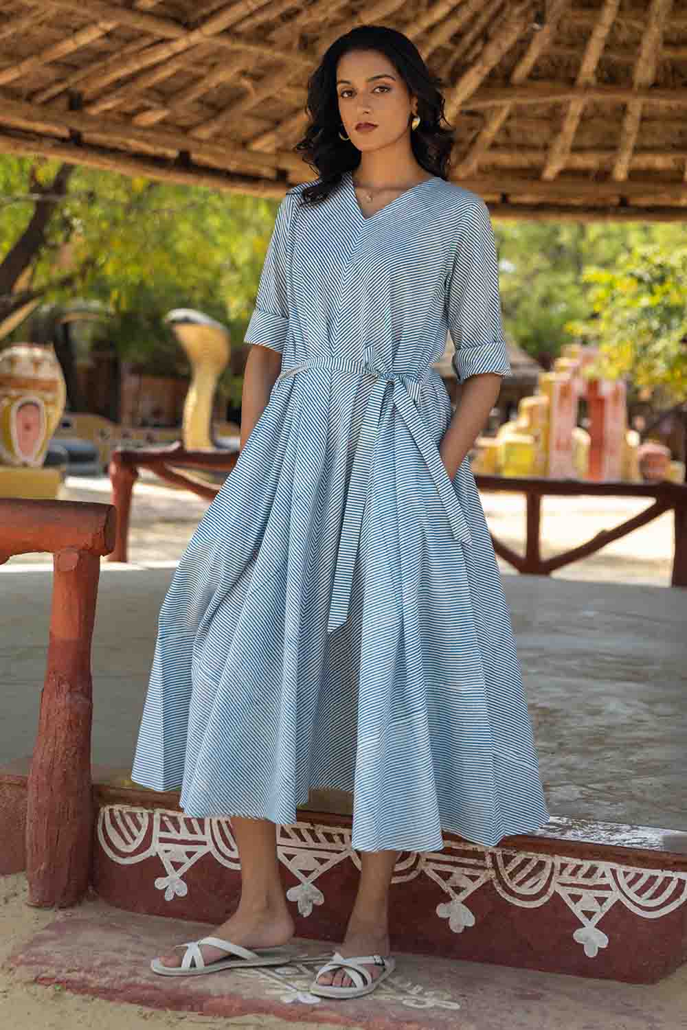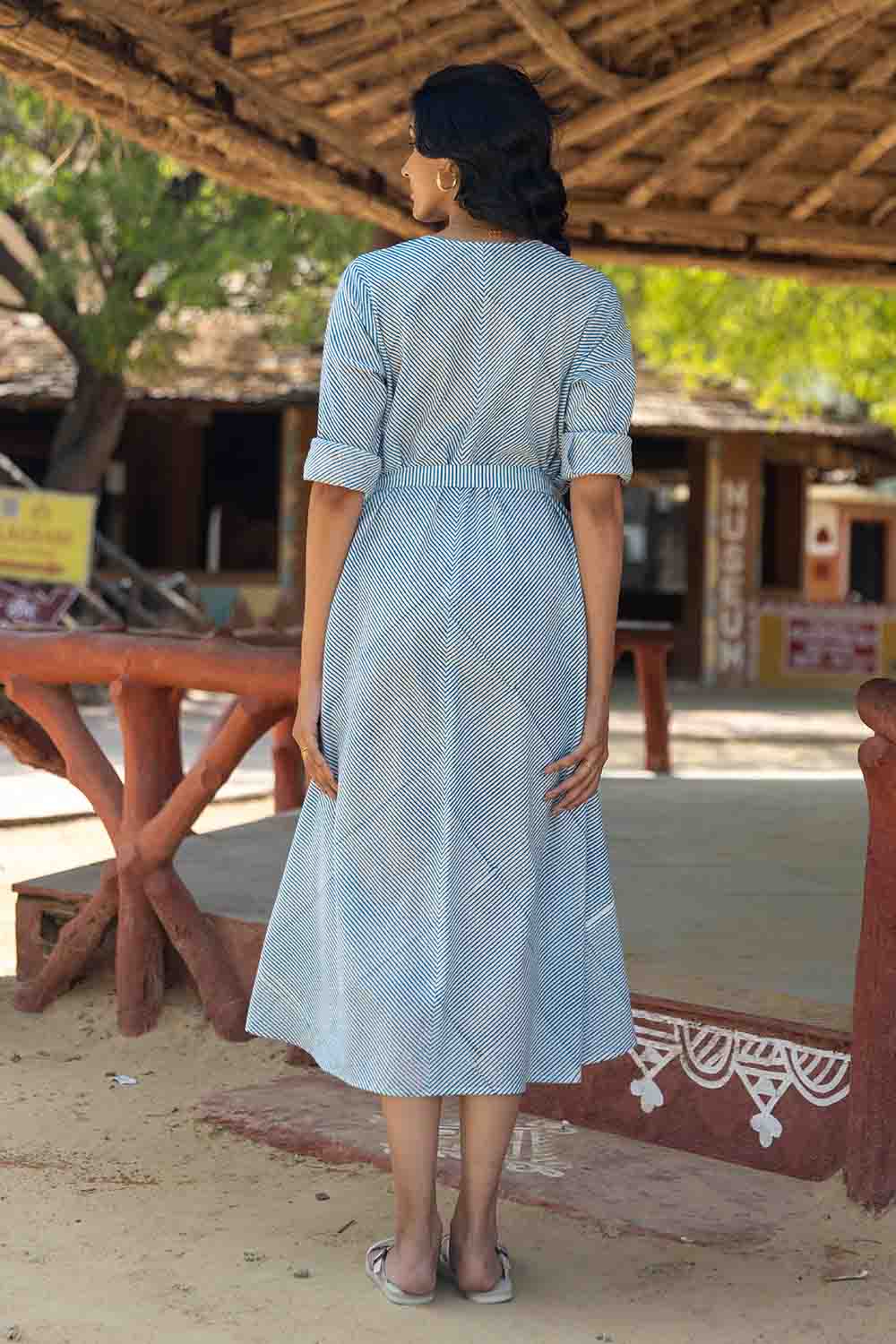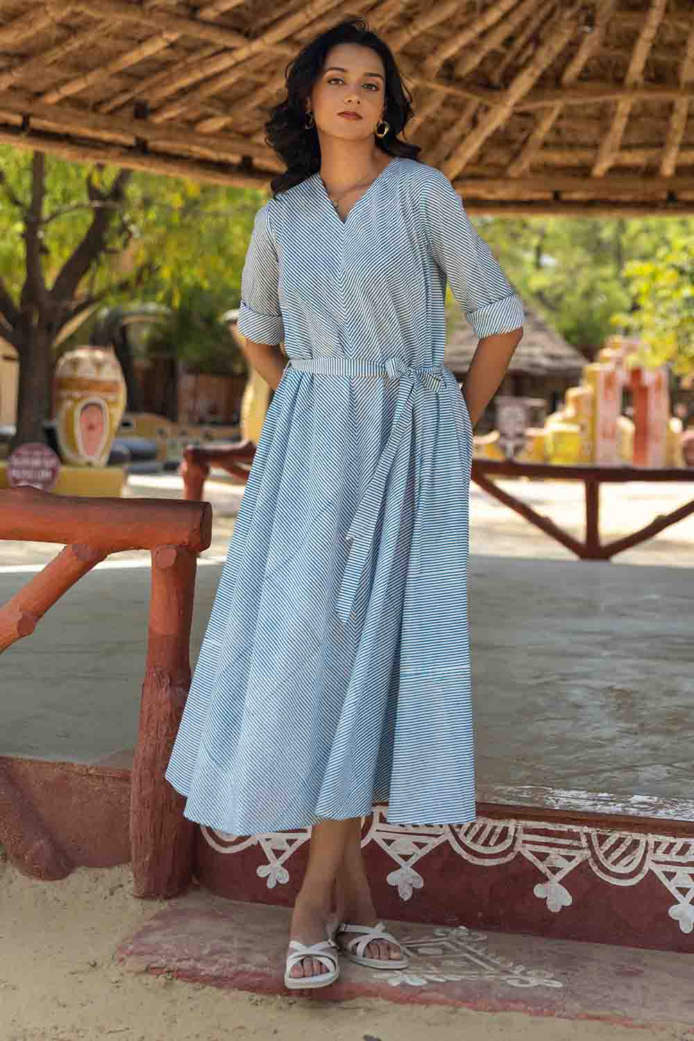 Blue & White Hand Block Flared Dress – Striped, Flowing & Elegant