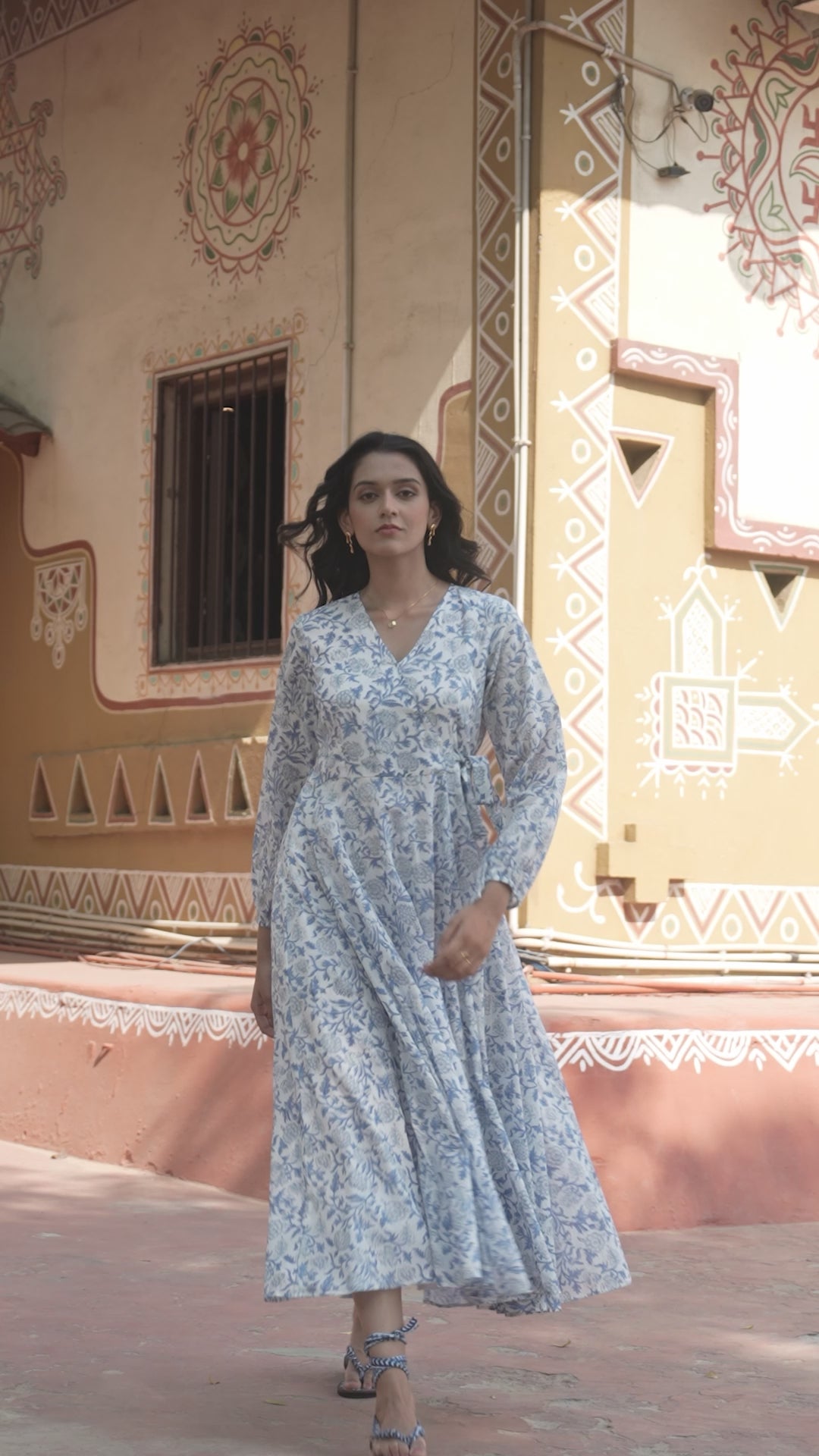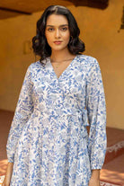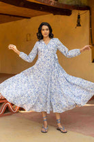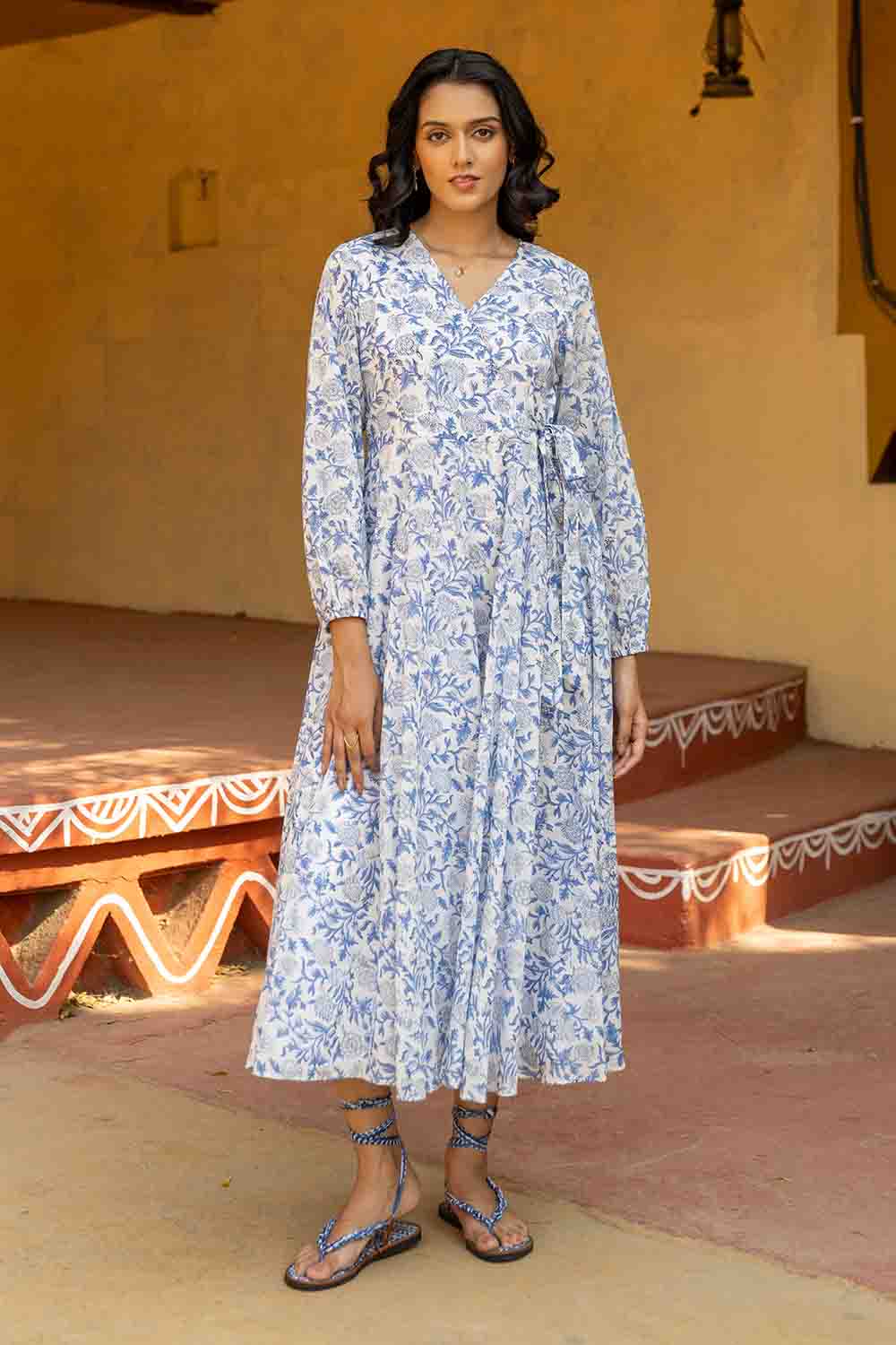 Embrace Effortless Style In Our White And Blue Malmal Cotton Dress. Featuring A Full-Length Full-Flared Silhouette And Intricate Block Prints—Perfect For A Breezy, Timeless Look.