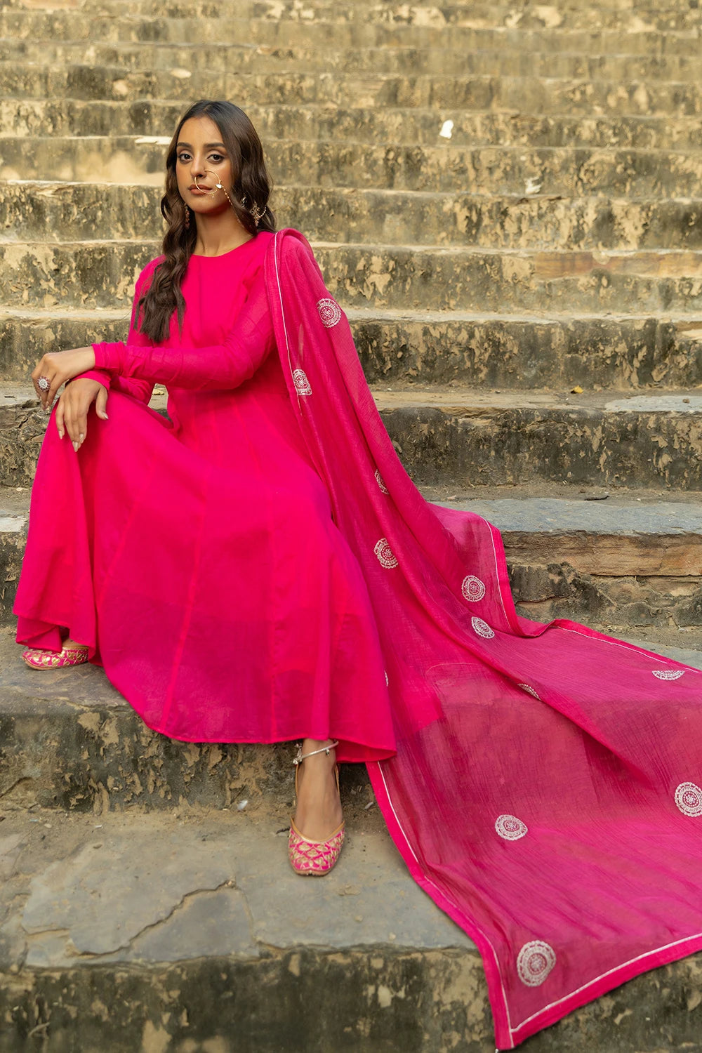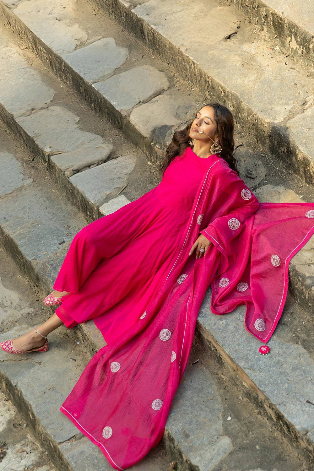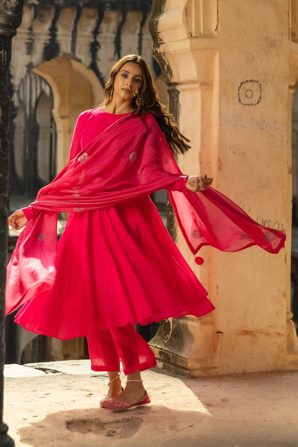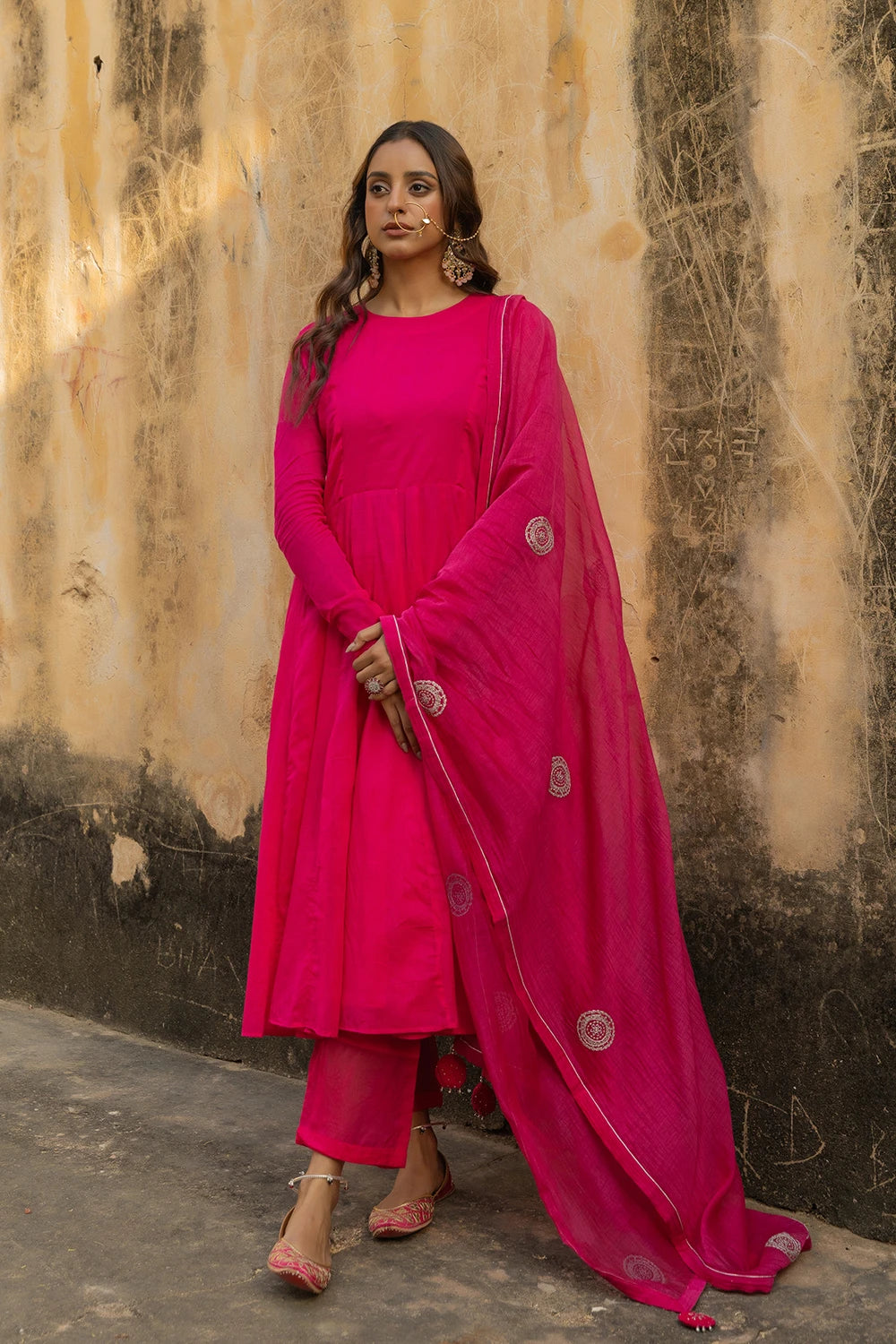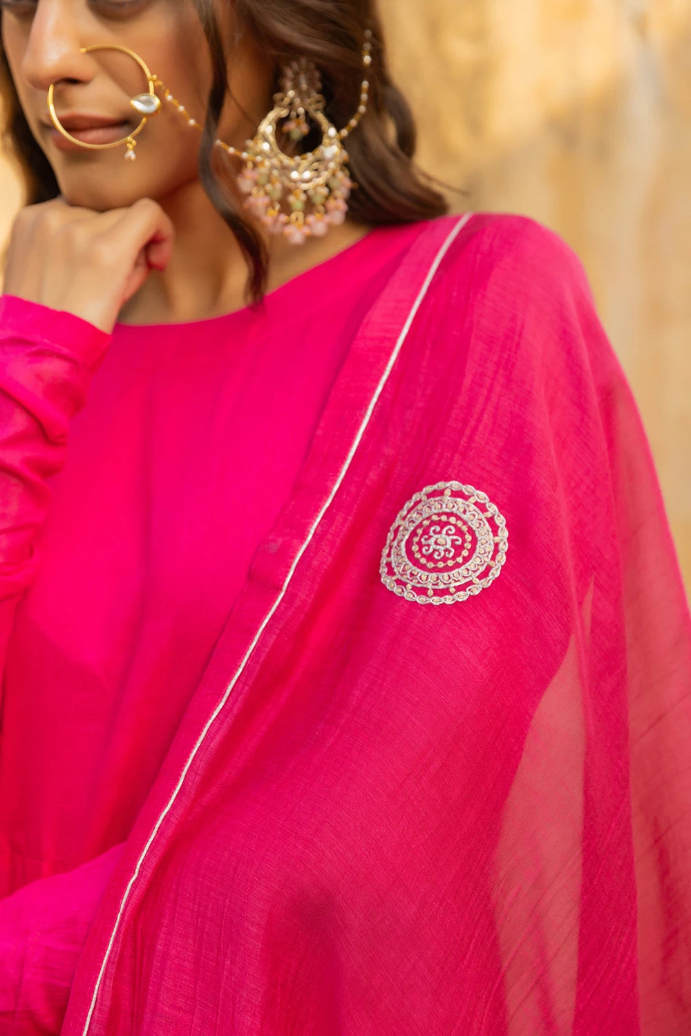 Magenta Malmal Anarkali With Chanderi Pitta Work Dupatta - Set Of 3