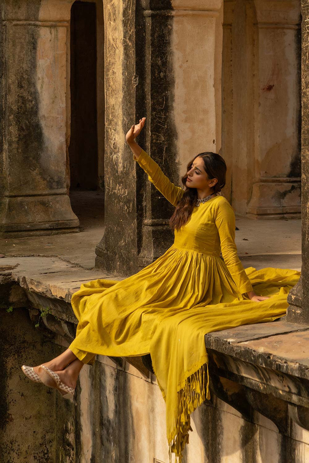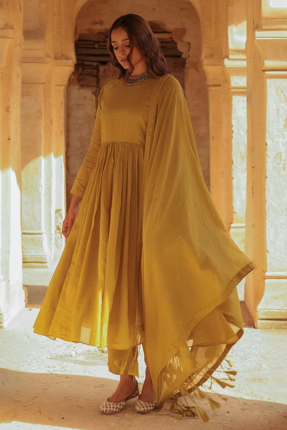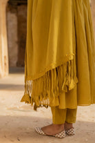 dupatta- A mustard-hued malmal dupatta, soft and airy to the touch, adorned with a delicate sprinkling of mirror work across its entire length. Both pallus are finished with playful fringes and fabric tassels crafted from the same material, adding movement, charm, and a lively, youthful character to the drape. Dupatta length-2.50mtr Dupatta width-85cm fabric- malmal colour- mustard