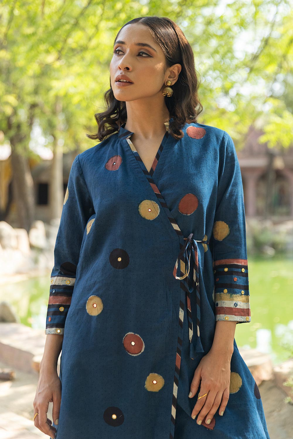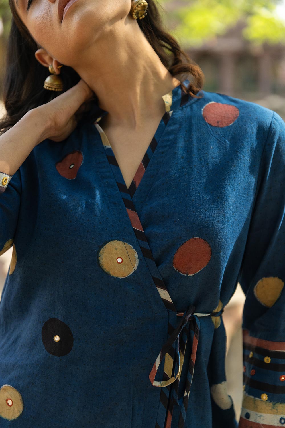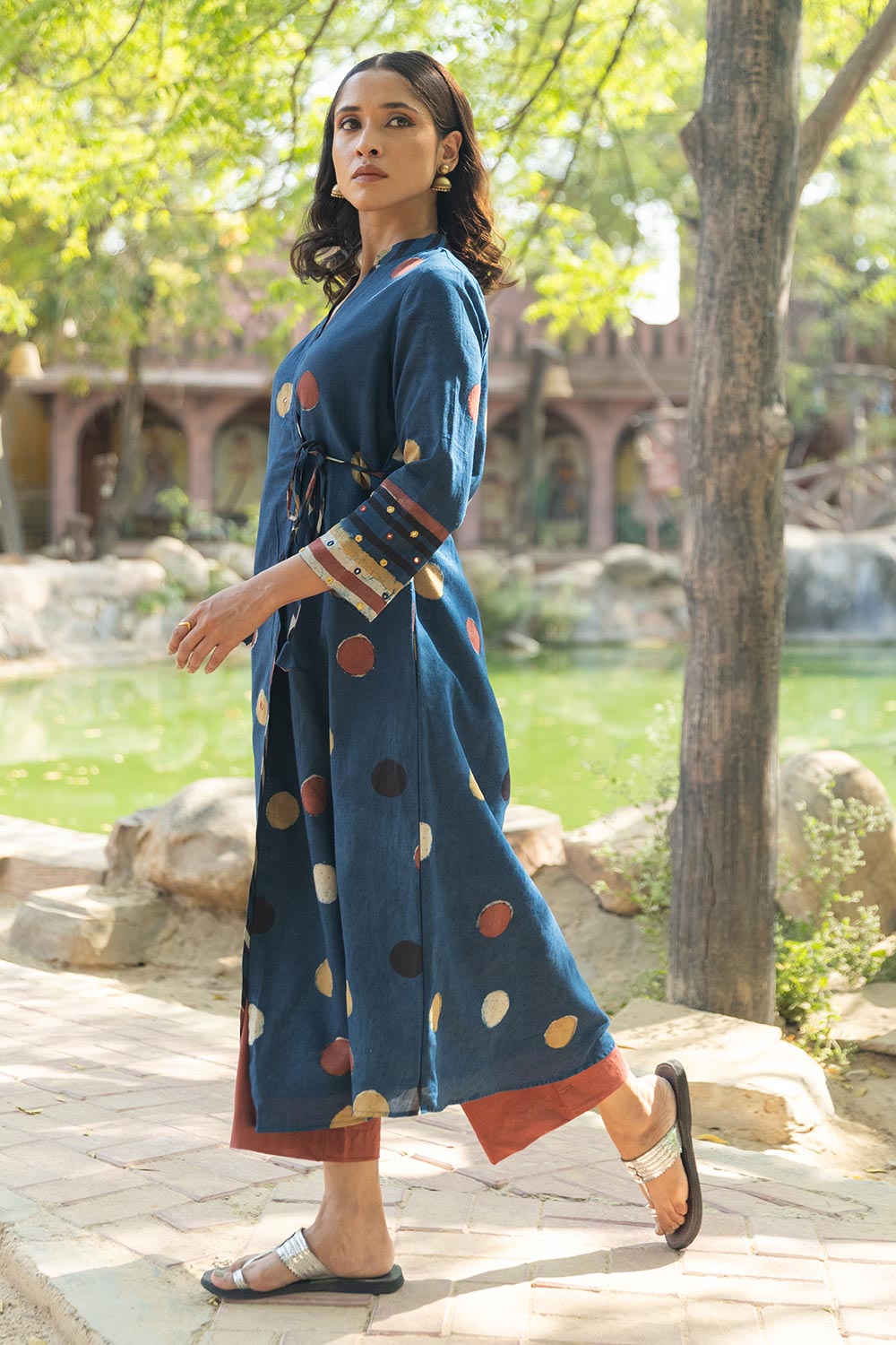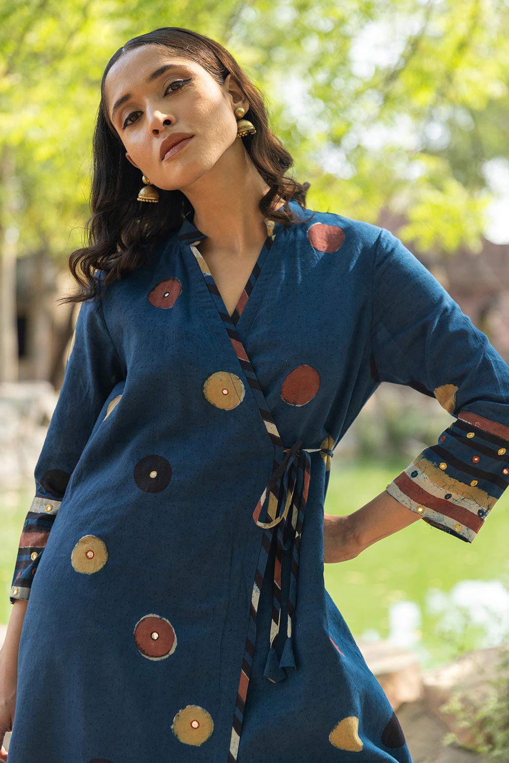 Step into effortless elegance with our Natural Indigo Dobby Print Overlap Kurta and Pants Set – a tribute to traditional craftsmanship and sustainable fashion. Made from handwoven