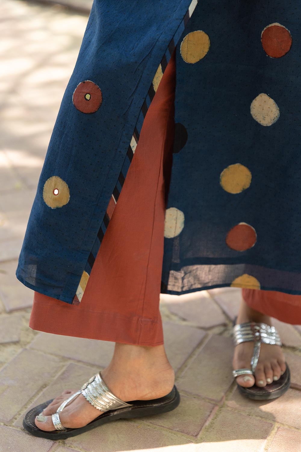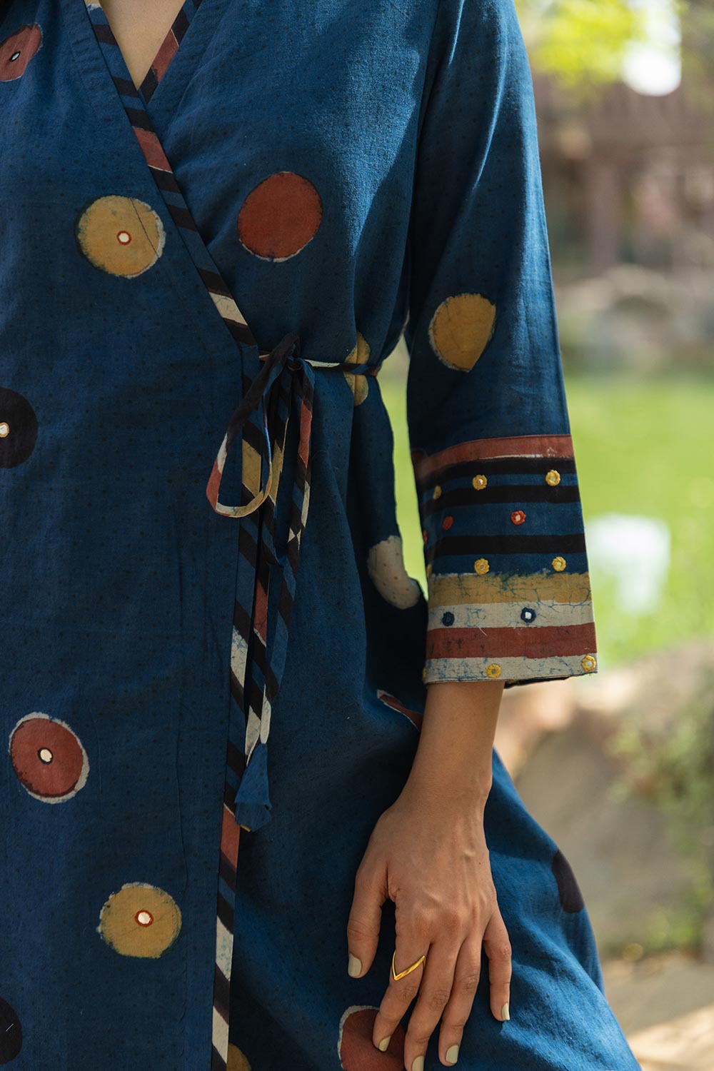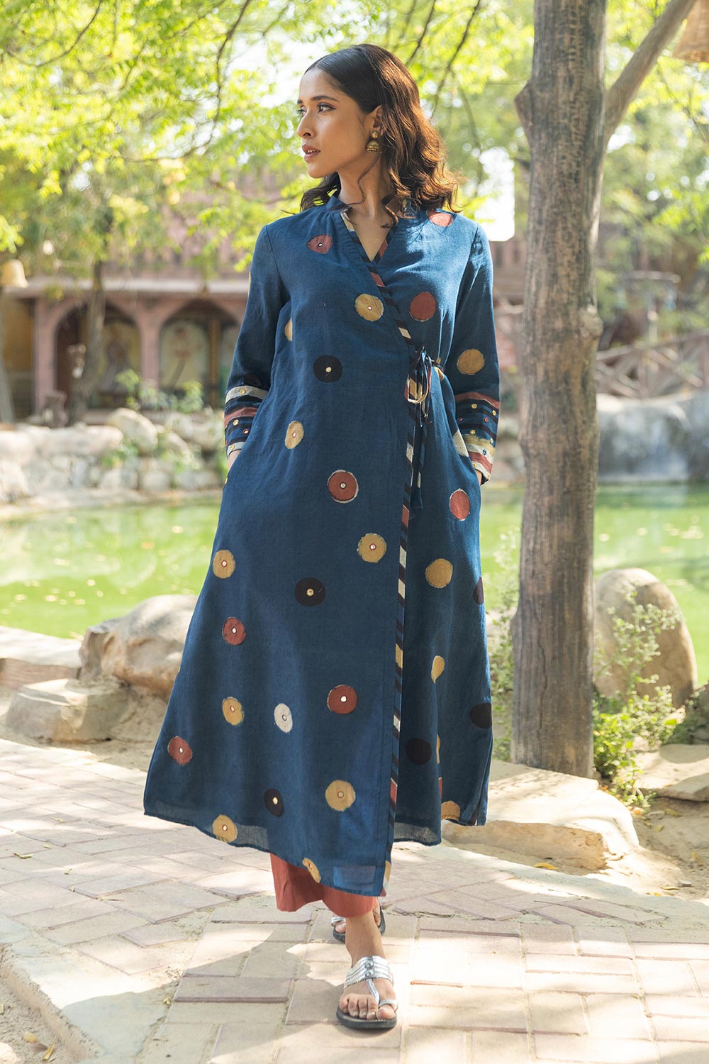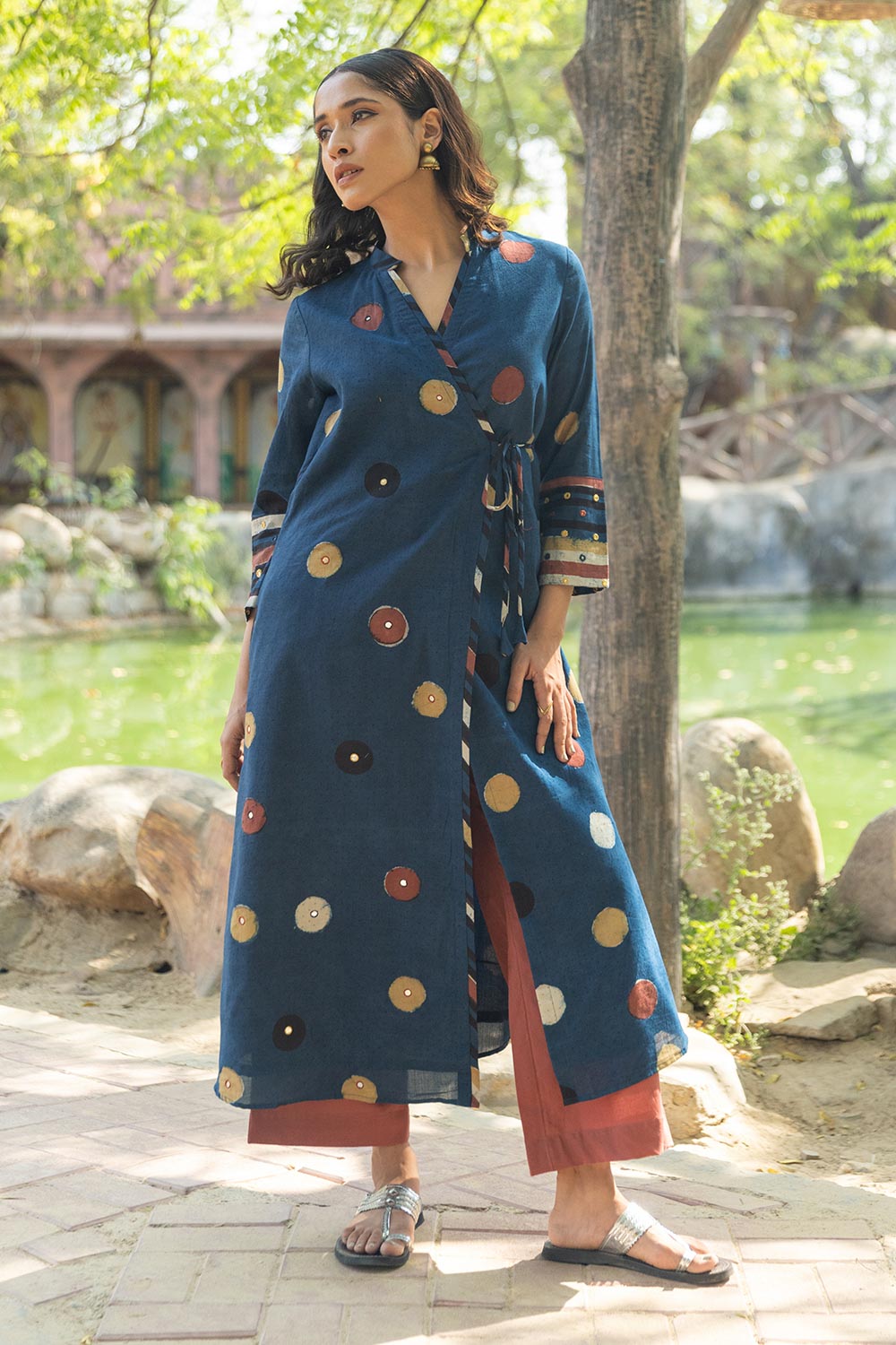 Step into effortless elegance with our Natural Indigo Dobby Print Overlap Kurta and Pants Set – a tribute to traditional craftsmanship and sustainable fashion. Made from handwoven