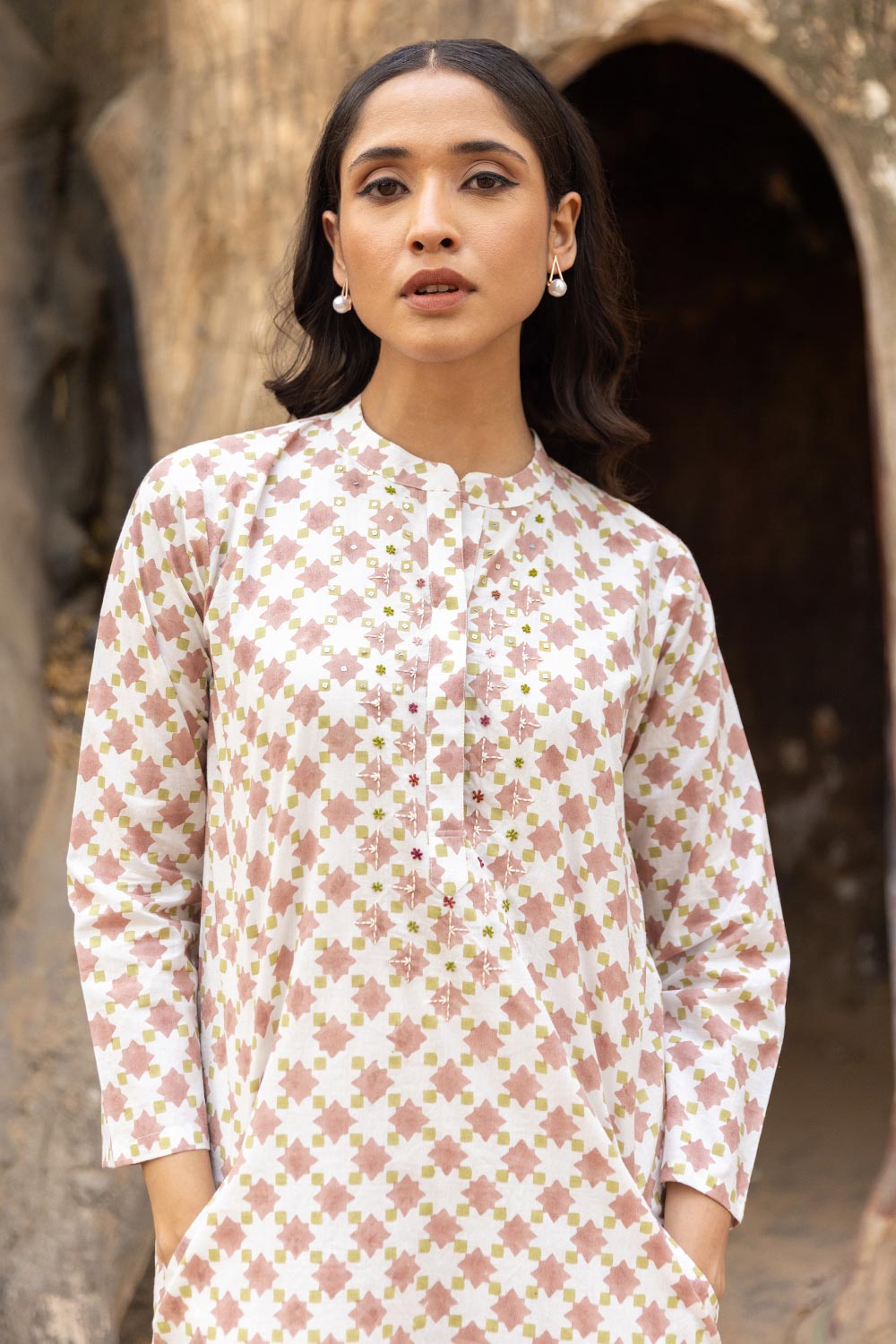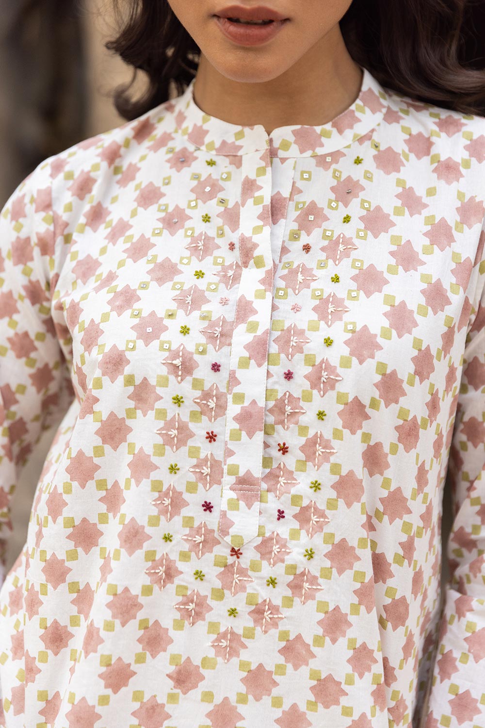 • Top fabric- premium cotton • Print artwork- hand block •Hand Work Art- Thread art work and sequin work on front yoke •pocket- Two Side Pockets in kurta