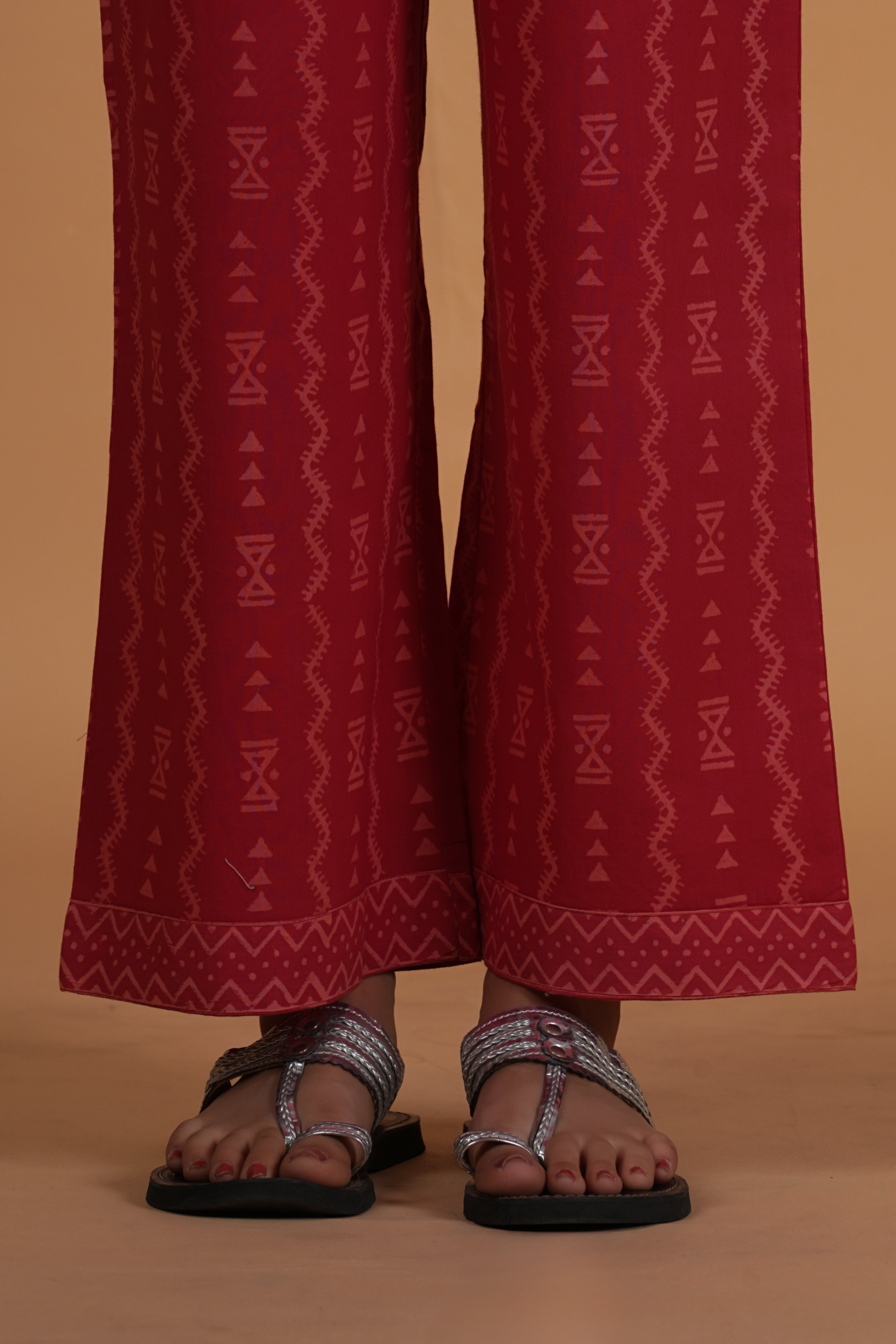 This red cotton straight-fit pants feature a classic Dabu print with a half-elasticated waistband and adjustable drawstring for everyday comfort. Finished with two functional pockets, they’re easy, breathable, and versatile for daily wear