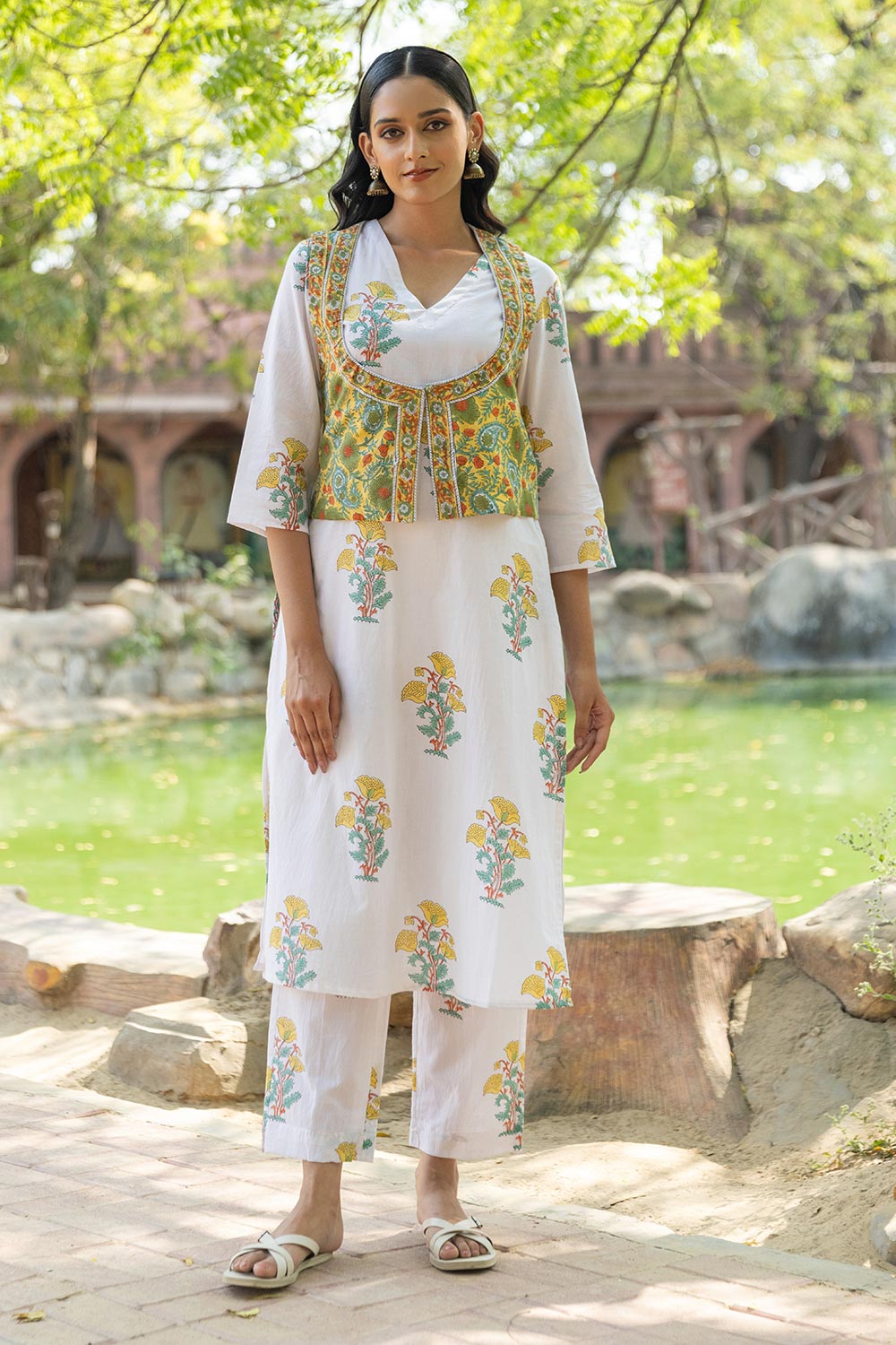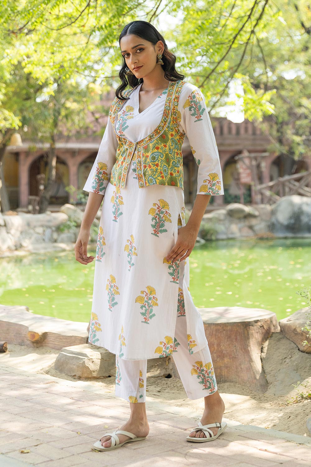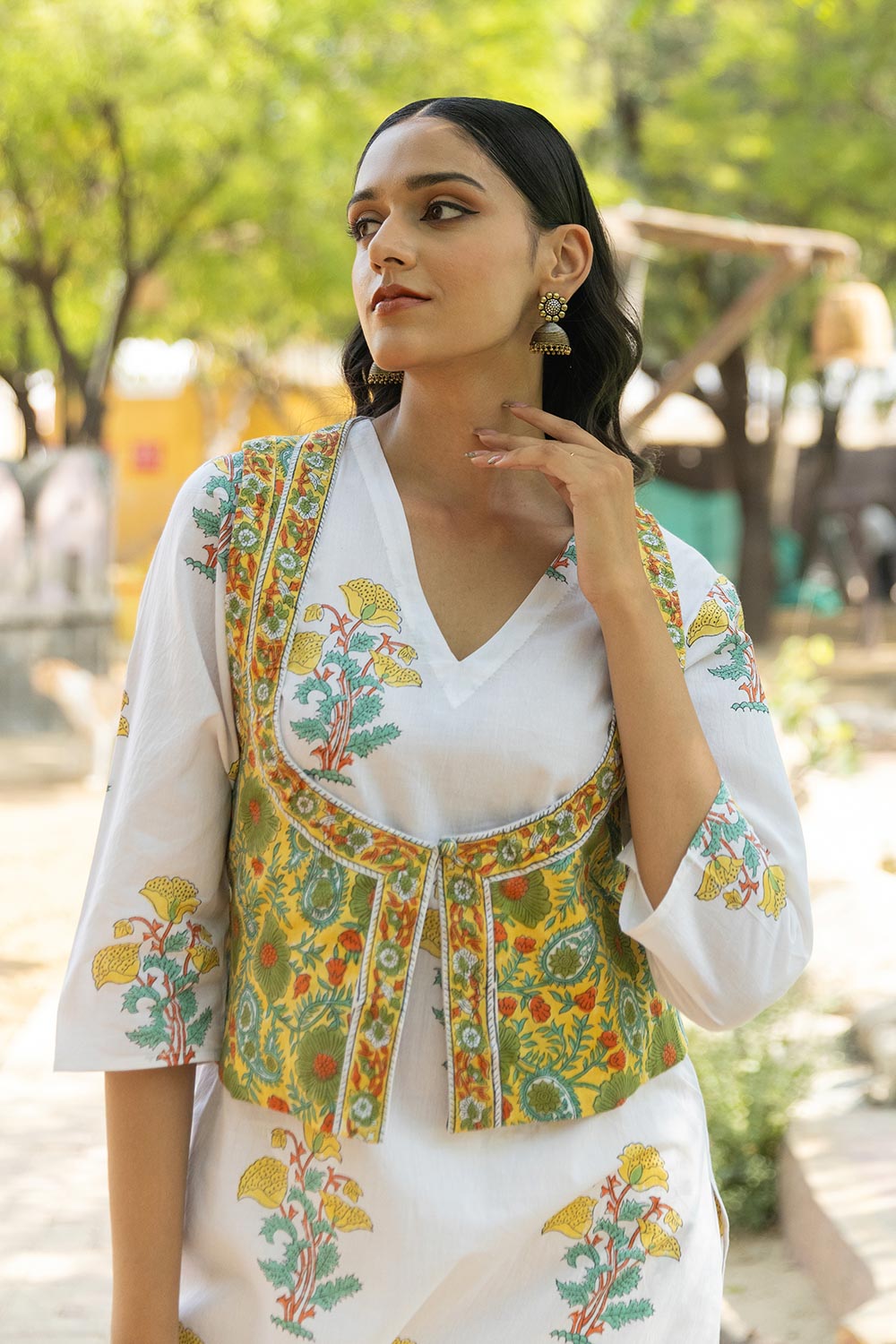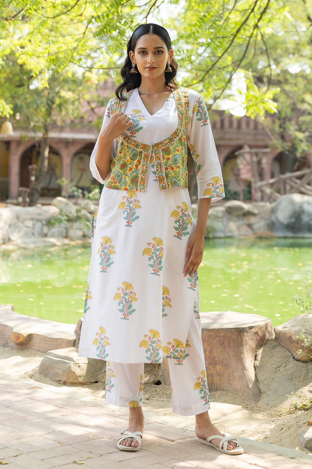 White Boota Co-ord Set With Contrast Dark Jacket - Elegant Indian Fusion Outfit